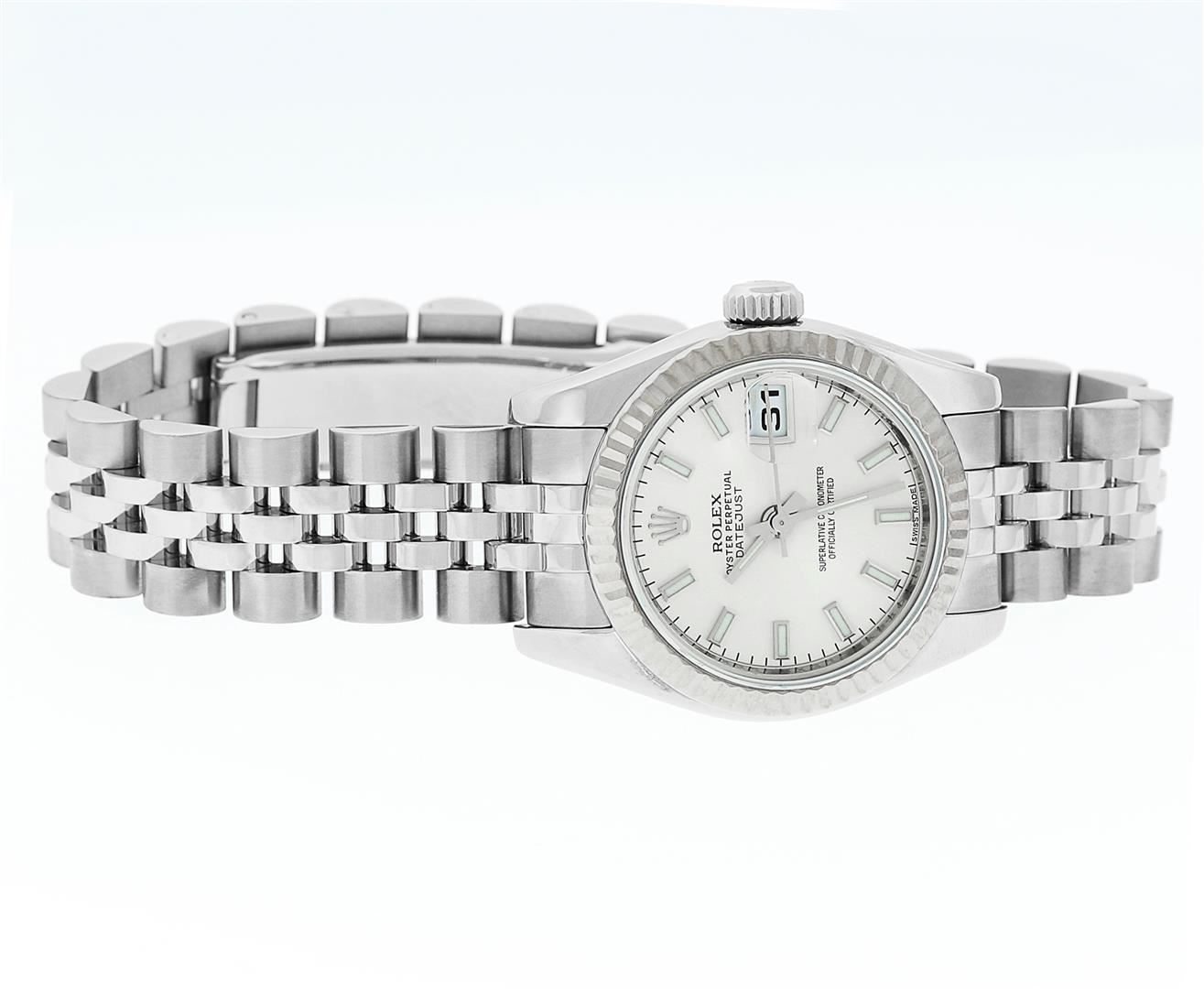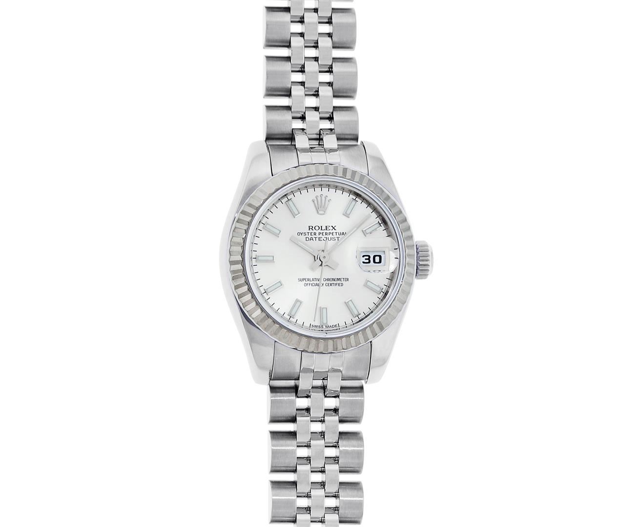 One New Style Ladies Pre Owned Quickset Stainless Steel Rolex Datejust Polished Bright with Satin Finish, Serviced & Electronically Tested, Rolex Stainless Steel Case: 26mm. Rolex Stainless Steel Crown, Rolex Bezel: 18K White Gold Fluted Bezel. Crystal: Sapphire With Magnified Date Window. Hands: Lumi Hands. Rolex Movement: Quickset Automatic Winding Movement 2235. Rolex Dial: White Index With Dash Track. Date Window: 3 O'Clock Position Date Display, Model: Sapphire Quickset Datejust. Condition: G-6 Extra Fine. Rolex Bracelet: Stainless Steel Jubilee Band With Hidden Clasp. Bright Polish & Satin Finish. 6.0 Inch Length, Adjustable. Hidden Clasp, With Rolex Logo. This Watch Has Been Serviced Time Tested And Is In Excellent Condition It Is Free Of All Scratches And Dents.