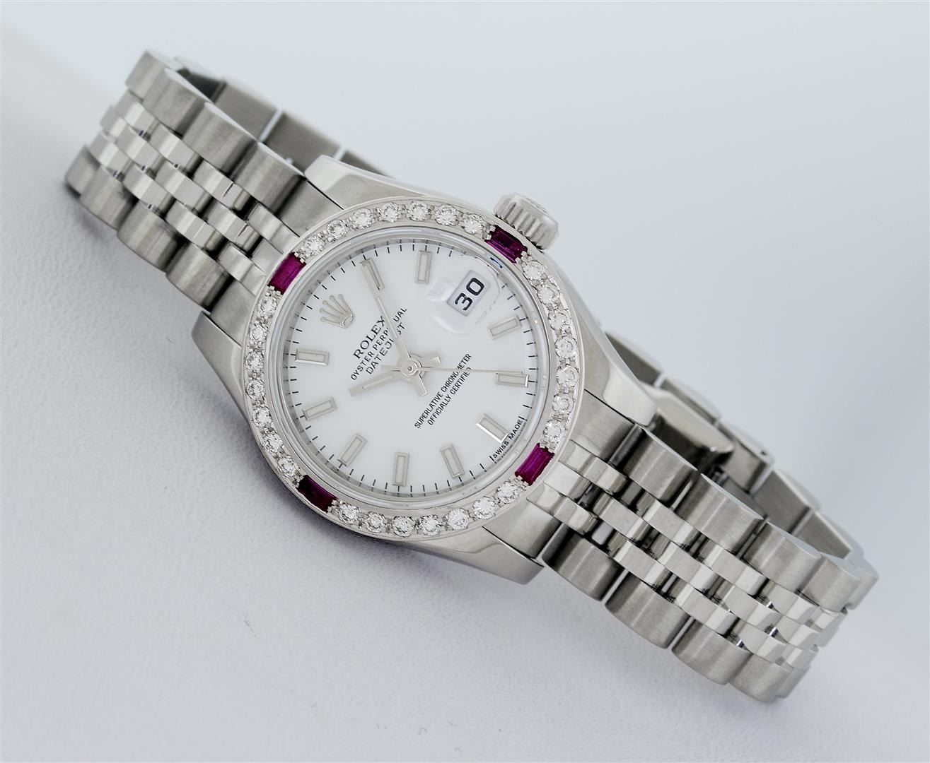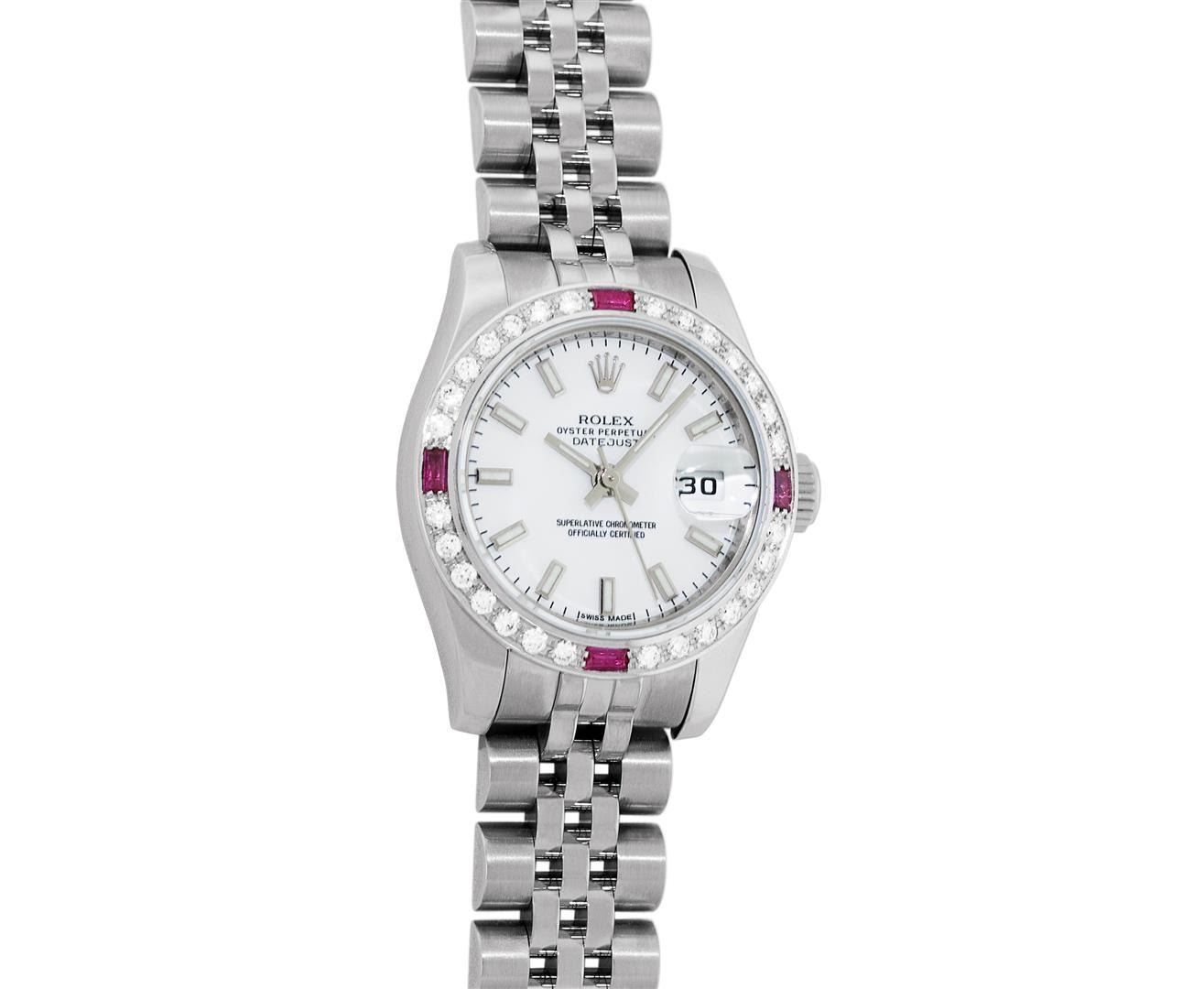 One Ladies Pre Owned Quickset Stainless Steel Rolex Datejust Polished Bright with Satin Finish, Serviced & Electronically Tested, Rolex Stainless Steel Case: 26mm. Rolex Stainless Steel Crown, Custom Bezel: New 18K White Gold Beadset And Ruby Bezel, Stone Count: 28 Diamonds + 4 Rubies, Diamond Color: G To H, Clarity: SI-VS. Crystal: Sapphire With Magnified Date Window. Hands: Lumi Hands. Rolex Movement: Quickset Automatic Winding Movement 2235. Rolex Dial: White Index With Dash Track. Date Window: 3 O'Clock Position Date Display, Model: Sapphire Quickset Datejust. Condition: G-6 Extra Fine. Rolex Bracelet: Stainless Steel Jubilee Band With Hidden Clasp. Bright Polish & Satin Finish. 6.0 Inch Length, Adjustable. Hidden Clasp, With Rolex Logo. This Watch Has Been Serviced Time Tested And Is In Excellent Condition It Is Free Of All Scratches And Dents.