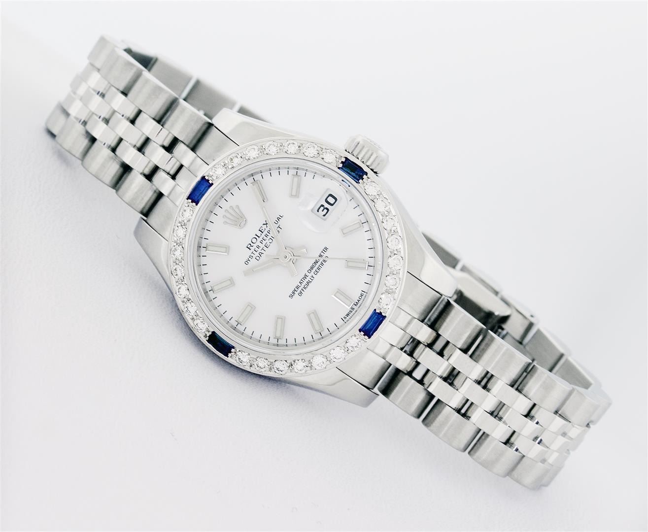One New Style Ladies Rolex Pre Owned Quickset Stainless Steel Datejust Polished Bright with Satin Finish, Serviced & Electronically Tested, Rolex Stainless Steel Case: 26mm. Rolex Stainless Steel Crown, Custom Bezel: New 18K White Gold Beadset And Sapphire Bezel, Stone Count: 28 Diamonds + 4 Sapphires, Diamond Color: G To H, Clarity: SI-VS. Crystal: Sapphire With Magnified Date Window. Hands: Lumi Hands. Rolex Movement: Quickset Automatic Winding Movement 2235. Rolex Dial: White Index With Dash Track. Date Window: 3 O'Clock Position Date Display, Model: Sapphire Quickset Datejust. Condition: G-6 Extra Fine. Rolex Bracelet: Stainless Steel Jubilee Band With Hidden Clasp. Bright Polish & Satin Finish. 6.0 Inch Length, Adjustable. Hidden Clasp, With Rolex Logo. This Watch Has Been Serviced Time Tested And Is In Excellent Condition It Is Free Of All Scratches And Dents.
