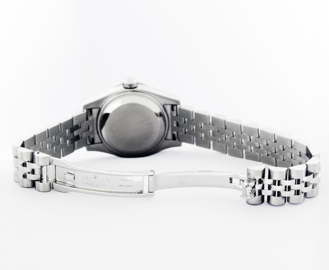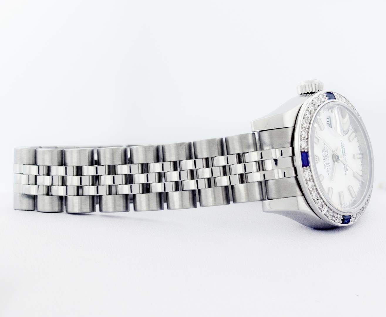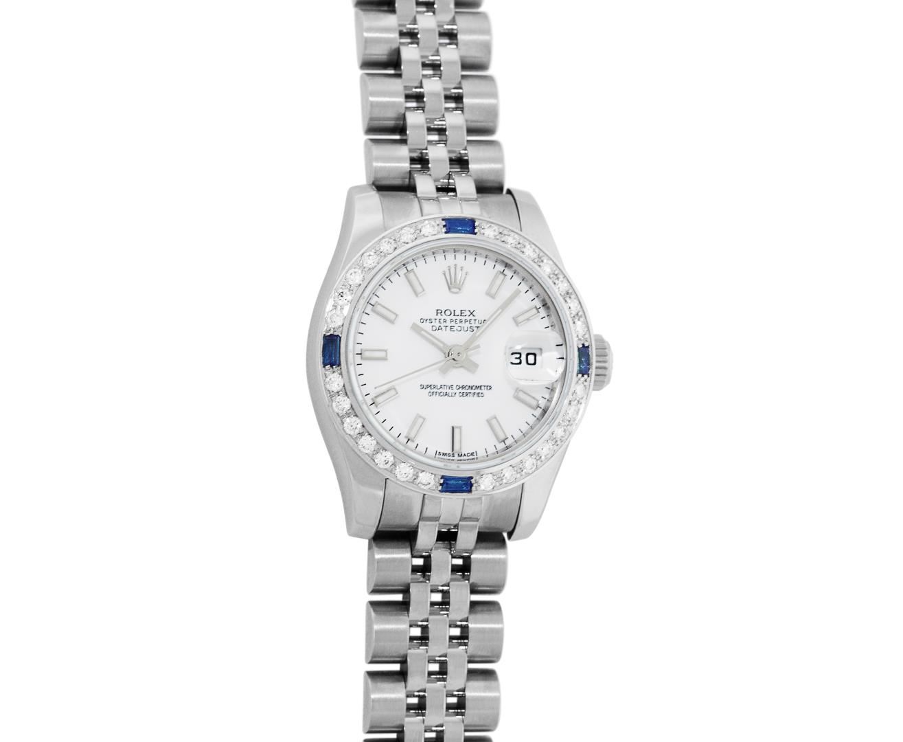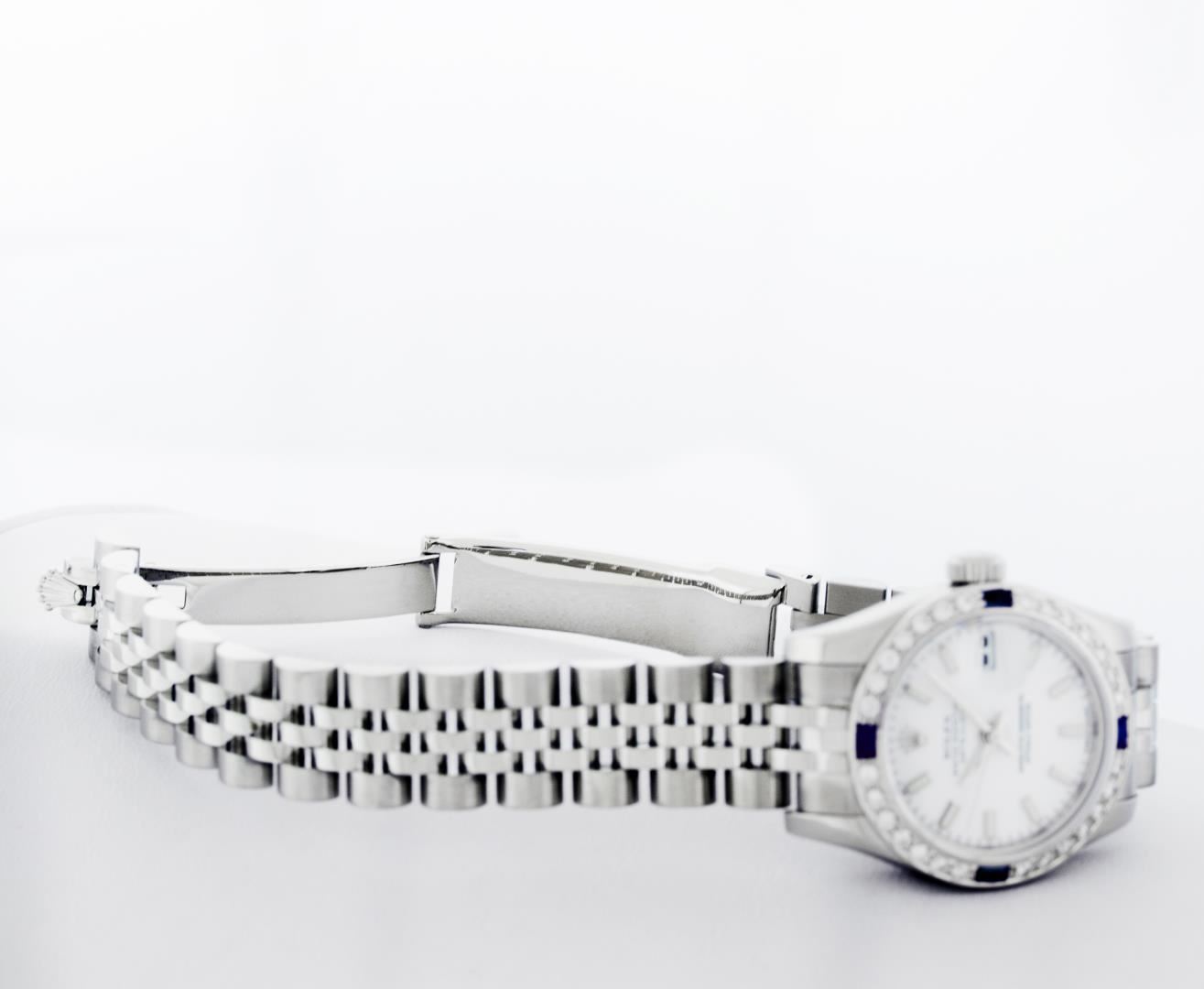 One New Style Ladies Rolex Pre Owned Quickset Stainless Steel Datejust Polished Bright with Satin Finish, Serviced And Electronically Tested, Rolex Stainless Steel Case: 26mm. Rolex Stainless Steel Crown, Custom Bezel: New 18K White Gold Beadset And Sapphire Bezel, Stone Count: 28 Diamonds + 4 Sapphires. Crystal: Sapphire With Magnified Date Window. Hands: Lumi Hands. Rolex Movement: Quickset Automatic Winding Movement 2235. Rolex Dial: White Index With Dash Track. Date Window: 3 O'Clock Position Date Display, Model: Sapphire Quickset Datejust. Condition: G-6 Extra Fine. Rolex Bracelet: Stainless Steel Jubilee Band With Hidden Clasp. Bright Polish And Satin Finish. 6.0 Inch Length, Adjustable. Hidden Clasp, With Rolex Logo. This Watch Has Been Serviced Time Tested And Is In Excellent Condition It Is Free Of All Scratches And Dents.