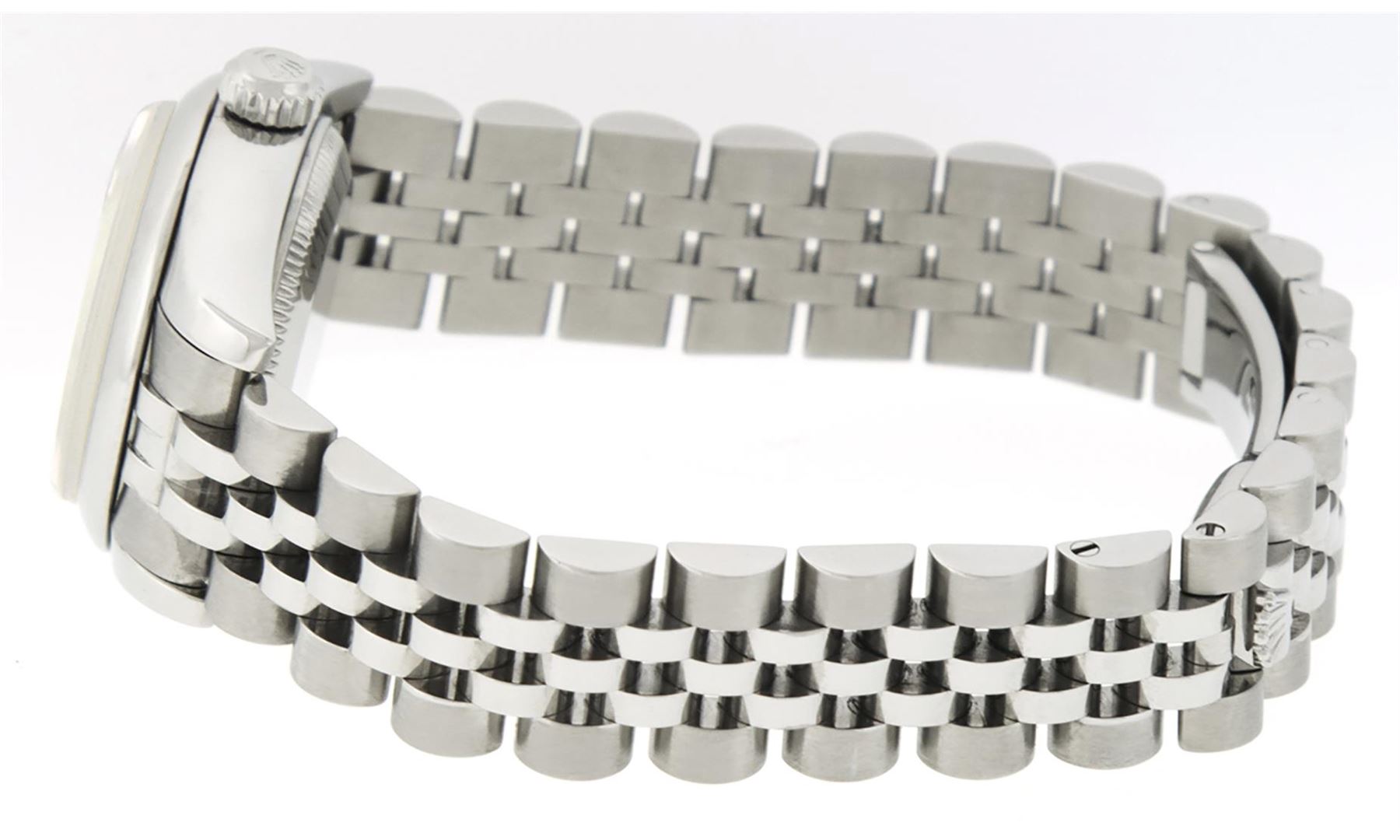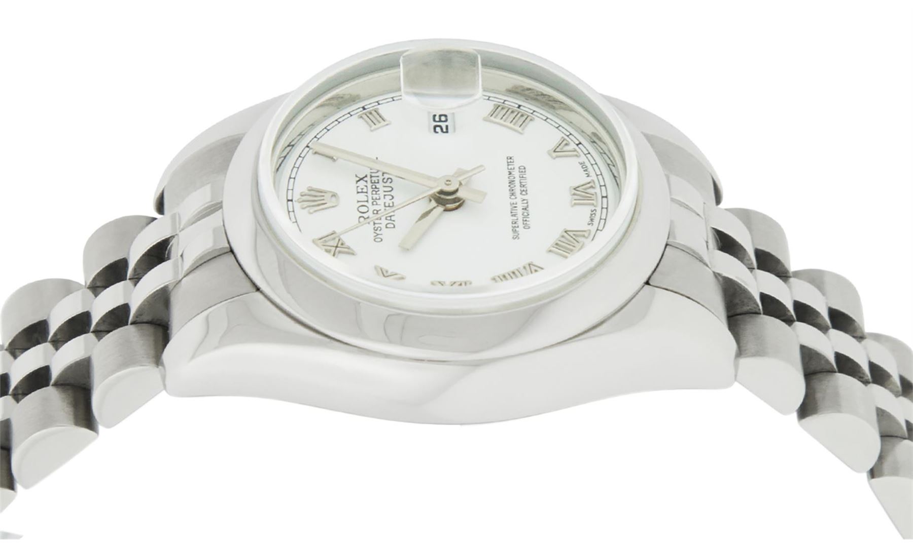 One New Style Ladies Pre Owned Quickset Stainless Steel Rolex Polished Bright with Satin Finish, Serviced & Electronically Tested, Rolex Stainless Steel Case: 26mm, Rolex Stainless Steel Crown, Rolex Bezel: Stainless Steel Smooth Bezel. Crystal: Sapphire With Magnified Date Window. Hands: Solid Hands. Rolex Movement: Automatic Winding Movement 2235. Rolex Dial: White Roman Dial With Square Track. Date Window: 3 O'Clock Position Date Display, Model: Quickset 179160. Condition: G-6 Extra Fine. Rolex Bracelet: Stainless Steel Jubilee Band. Bright Polish & Satin Finish. 6.0 Inch Length, Adjustable. Hidden Clasp, With Rolex Logo. This Watch Has Been Serviced Time Tested And Is In Excellent Condition It Is Free Of All Scratches And Dents.
