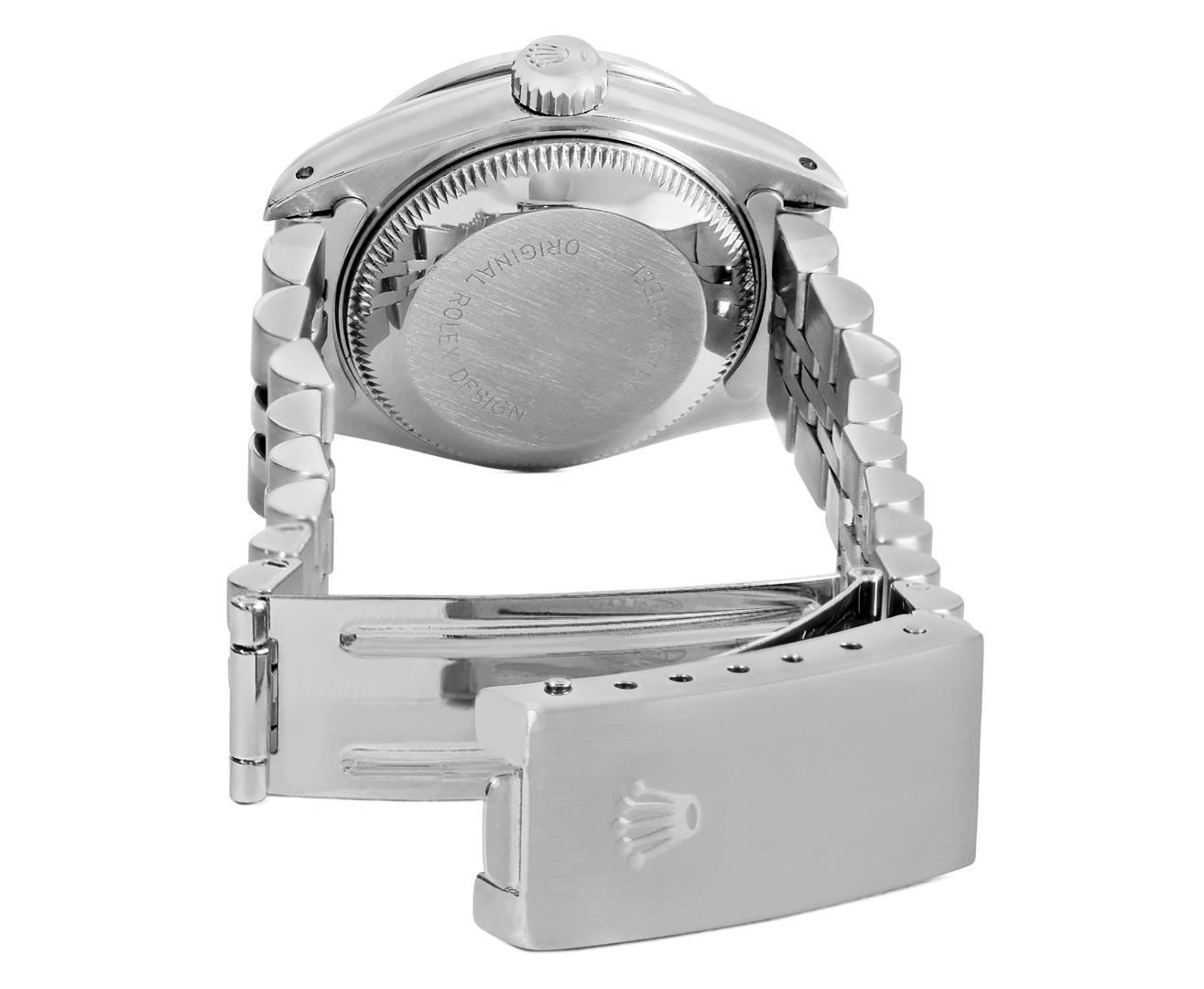 One Rolex Ladies Pre Owned Stainless Steel Datejust Wristwatch Polished Bright with Satin Finish, Serviced & Electronically Tested, Stainless Steel Case: 26mm, Stainless Steel Crown, Custom Bezel: New 18K White Gold Beadset Diamond Bezel, Diamond Count: 3