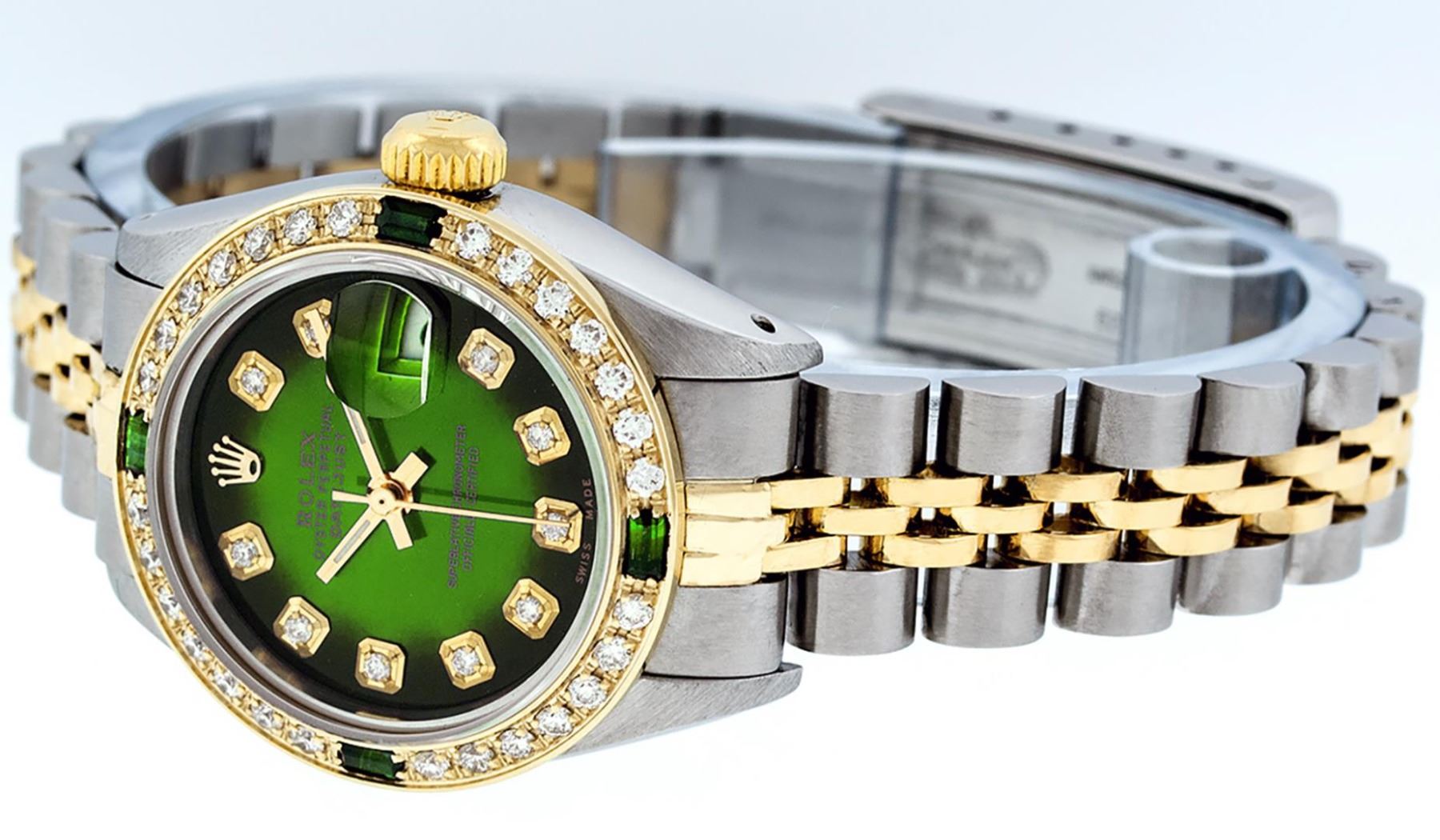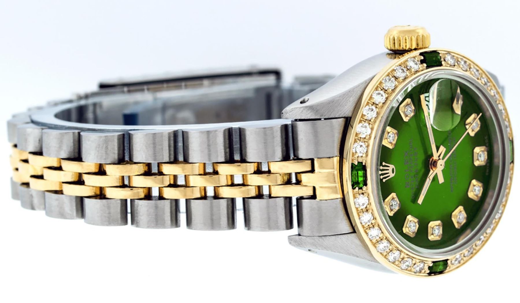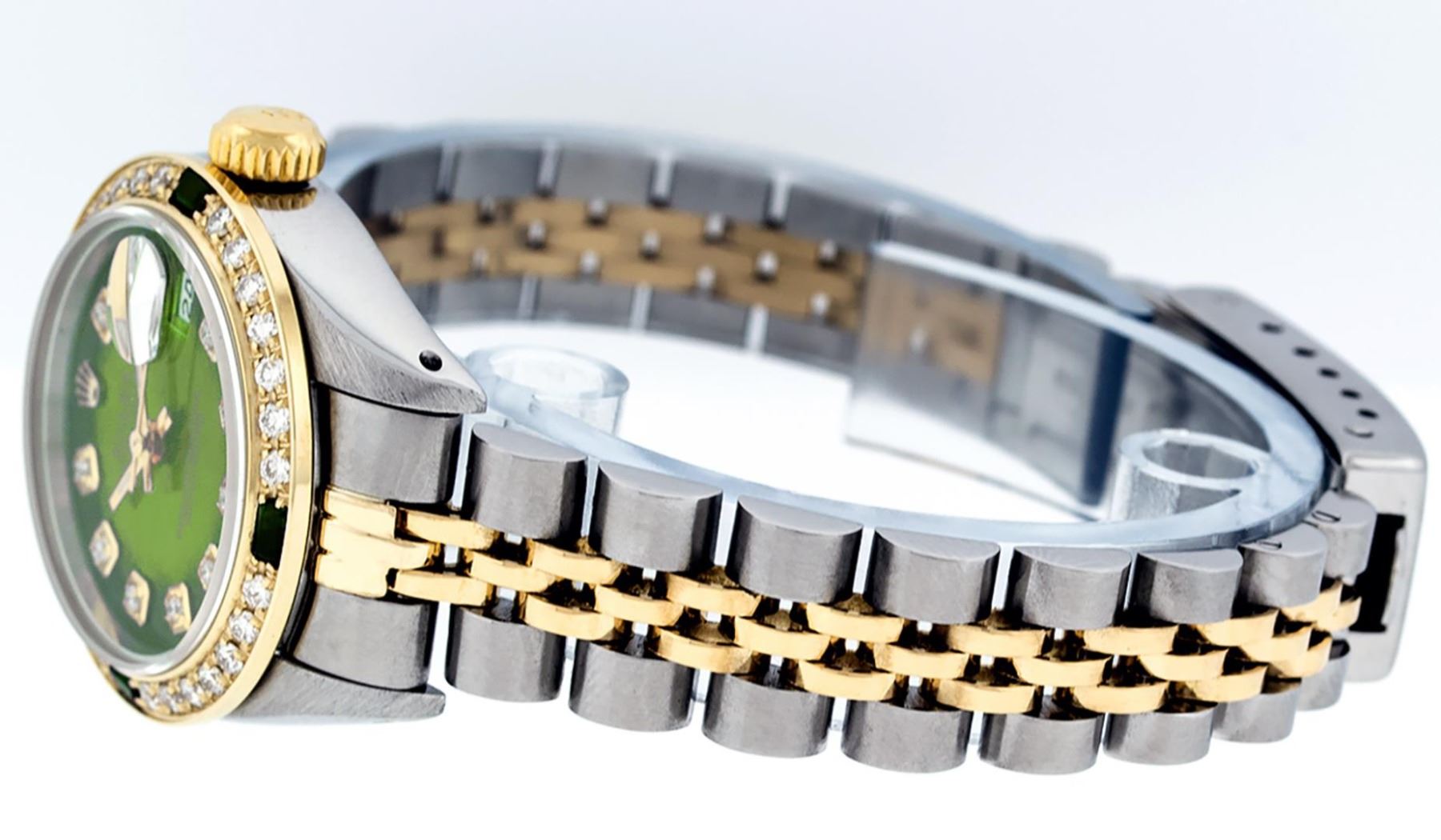 One Ladies Pre Owned Quickset Two Tone 18K Yellow Gold And Stainless Steel Rolex Datejust Polished, Serviced And Electronically Tested, Yellow Gold And Stainless Steel Case: 26mm, Yellow Gold Crown, Custom Bezel: New 18K Yellow Gold Emerald Beadset Diamond Bezel, Diamond + Gem Count: 28 Diamonds + 4 Emeralds. Custom Crystal: New Sapphire With Date Window. Custom Hands: New Luminescent Hands. Rolex Movement: Automatic Winding Movement 2135. Custom Dial: Custom Green Vignette Dial With Added Diamond Hour Markers, Diamond Count: 10 Diamond in Dial. Date Window: 3 O'Clock Position Date Display, Model: Quickset Datejust, Condition: G-6 Extra Fine. Rolex Bracelet: Two Tone Yellow Gold And Stainless Steel Jubilee Band. Bright Polish. 6.0 Inch Length, Adjustable. Standard Clasp, With Rolex Logo. This Watch Has Been Serviced Time Tested And Is In Excellent Condition It Is Free Of All Scratches And Dents.
