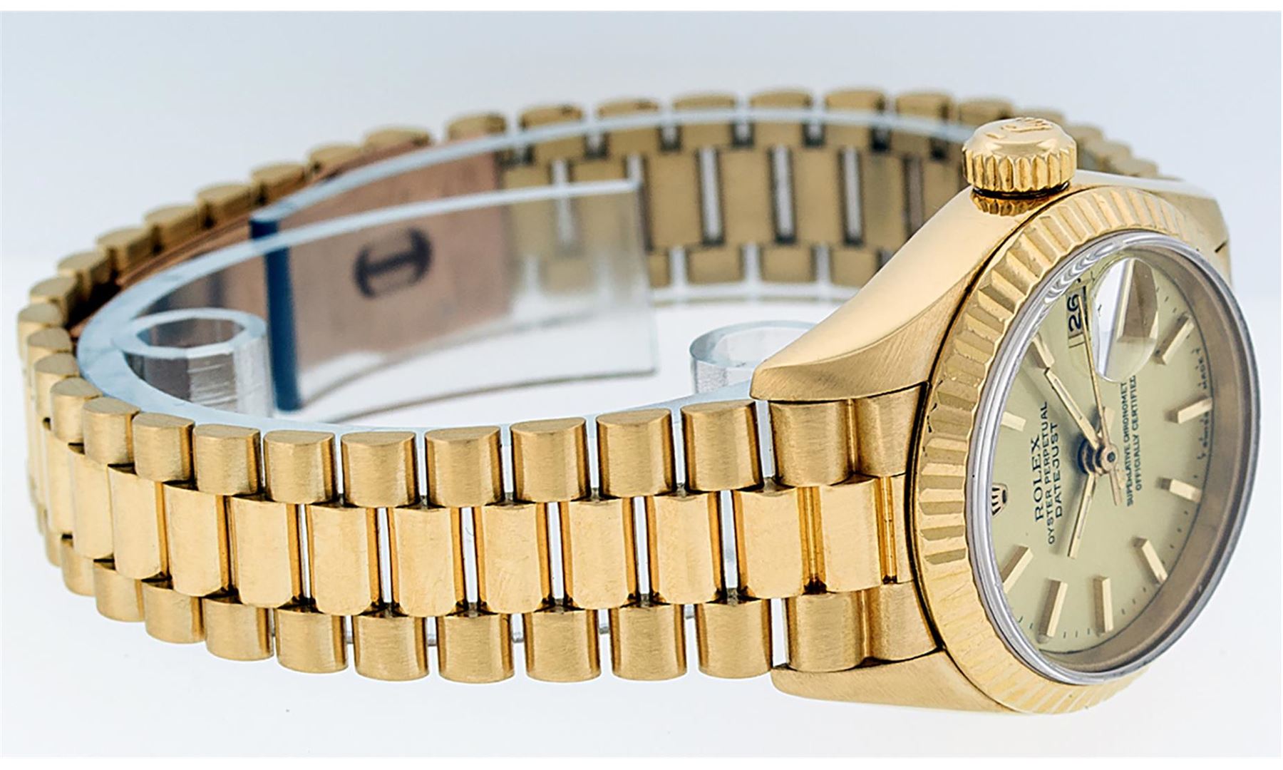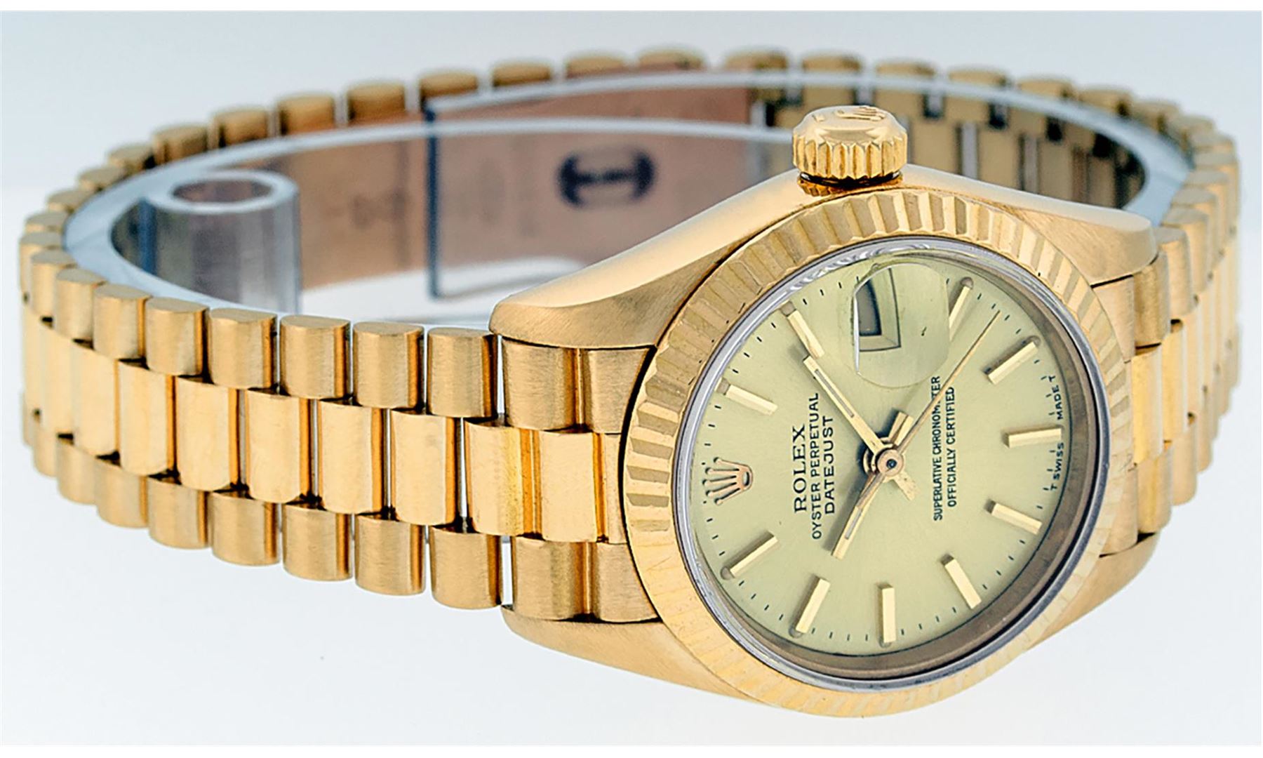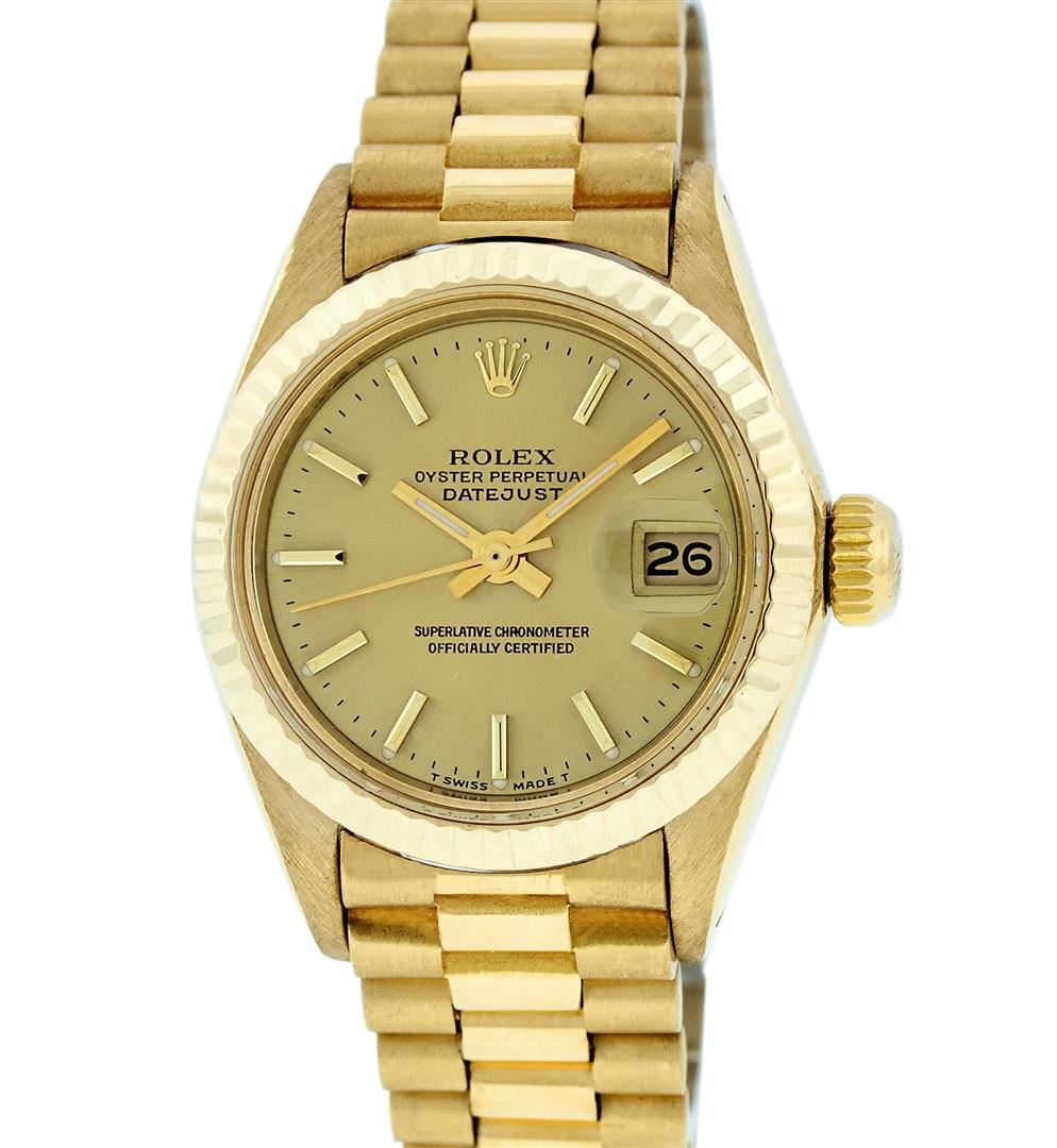 One Ladies Pre Owned Quickset Rolex 18K Yellow Gold President Polished, Serviced & Electronically Tested, Rolex 18K Yellow Gold Case: 26mm, Rolex 18K Yellow Gold Crown, Rolex Bezel: 18K Yellow Gold Fluted Bezel. Rolex Crystal: Sapphire With Cyclops Lens. Rolex Hands: Luminescent Hands. Rolex Movement: Automatic Winding Quickset Movement 2130. Rolex Dial: Champagne Index Dial With Dash Track & Lumi Dots. Date Window: 3 O'Clock Position, Model: President. Condition: G-6 Extra Fine. Rolex Bracelet: 18K Yellow Gold President Band, Bright & Satin Polish. 6.0 Inch Length, Standard President Clasp (Hidden Clasp), With Rolex Logo. The Watch Is In Very Good Condition Free Of All Scratches And Dents.