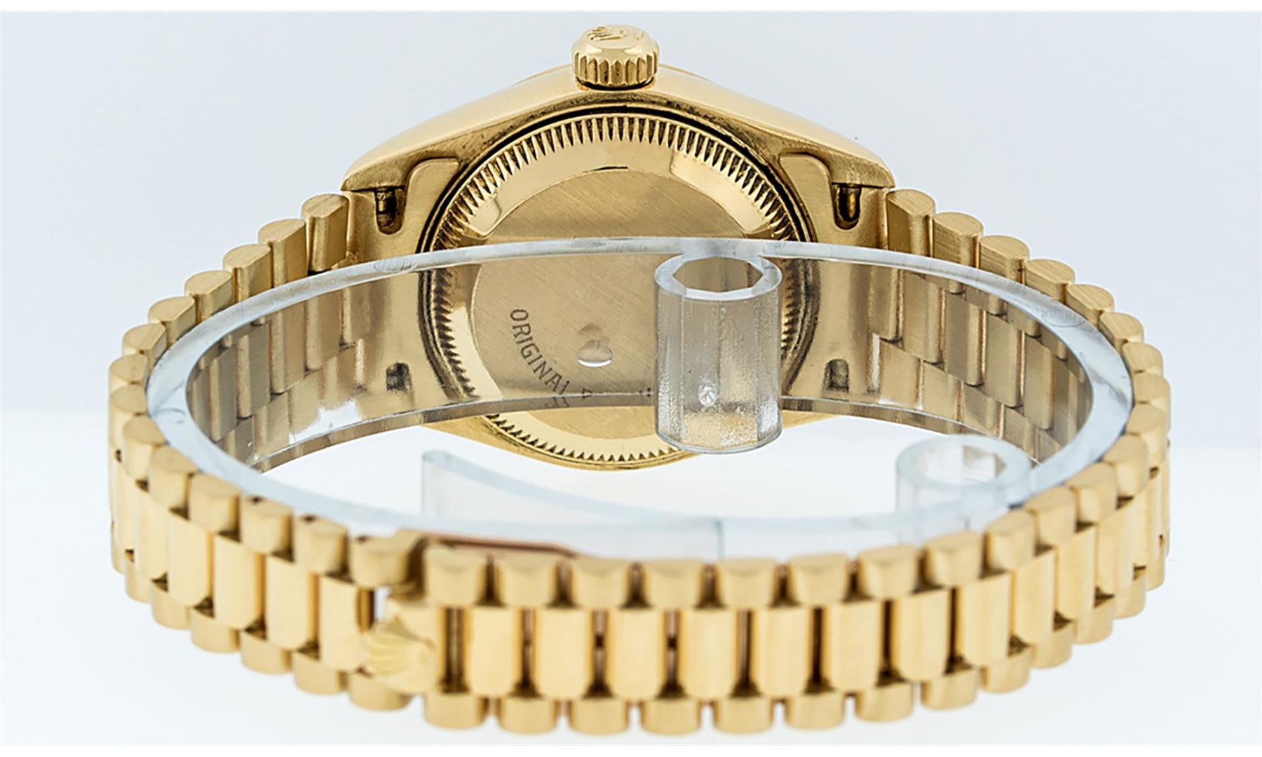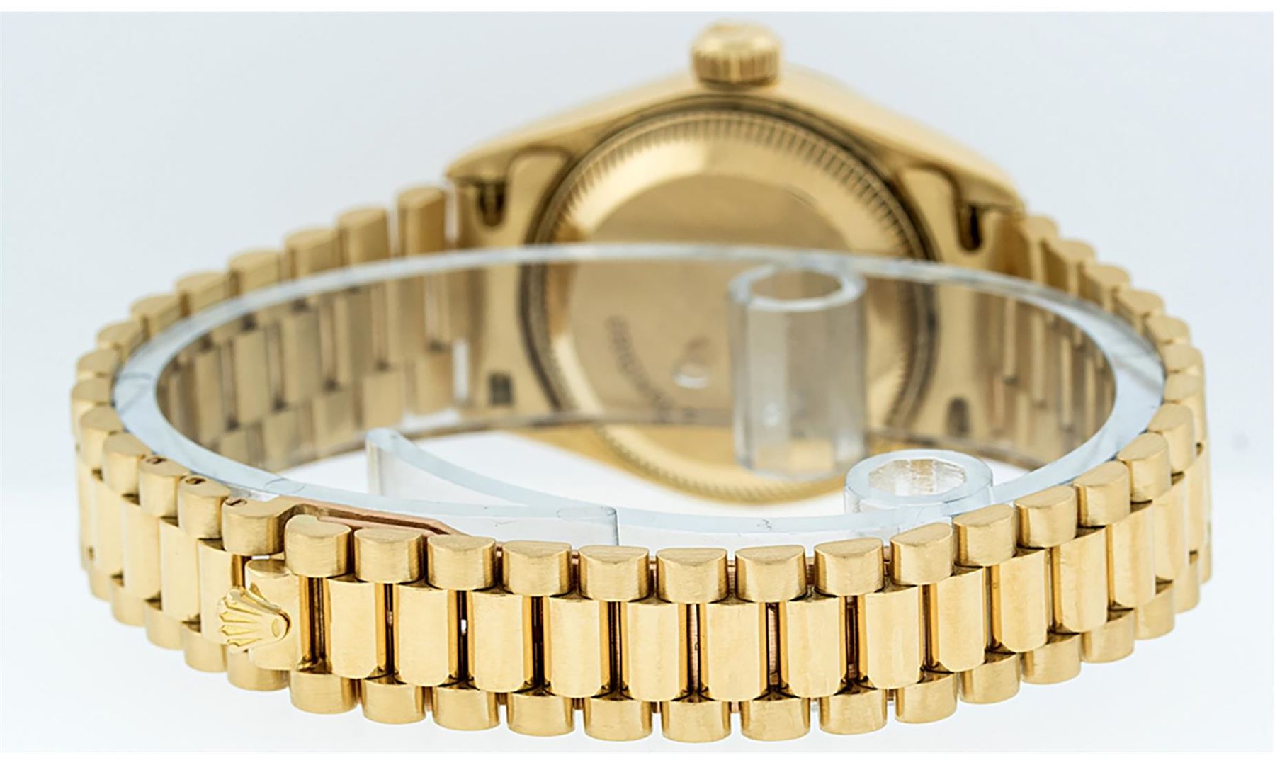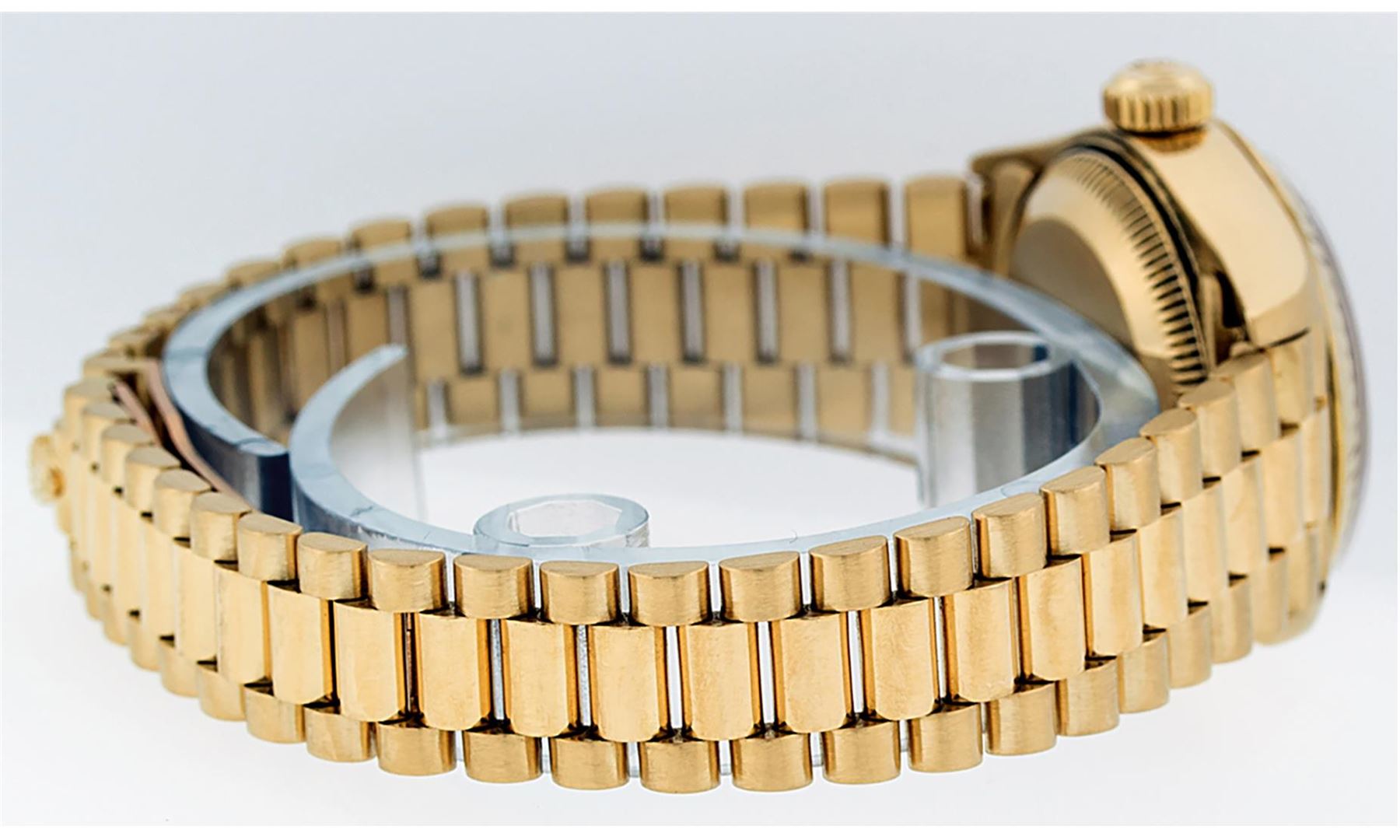 One Ladies Pre Owned Quickset Rolex 18K Yellow Gold President Polished, Serviced & Electronically Tested, Rolex 18K Yellow Gold Case: 26mm, Rolex 18K Yellow Gold Crown, Rolex Bezel: 18K Yellow Gold Fluted Bezel. Rolex Crystal: Sapphire With Cyclops Lens. Rolex Hands: Luminescent Hands. Rolex Movement: Automatic Winding Quickset Movement 2130. Rolex Dial: Champagne Index Dial With Dash Track & Lumi Dots. Date Window: 3 O'Clock Position, Model: President. Condition: G-6 Extra Fine. Rolex Bracelet: 18K Yellow Gold President Band, Bright & Satin Polish. 6.0 Inch Length, Standard President Clasp (Hidden Clasp), With Rolex Logo. The Watch Is In Very Good Condition Free Of All Scratches And Dents.