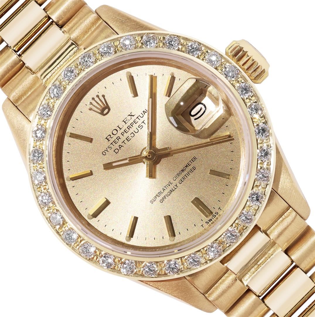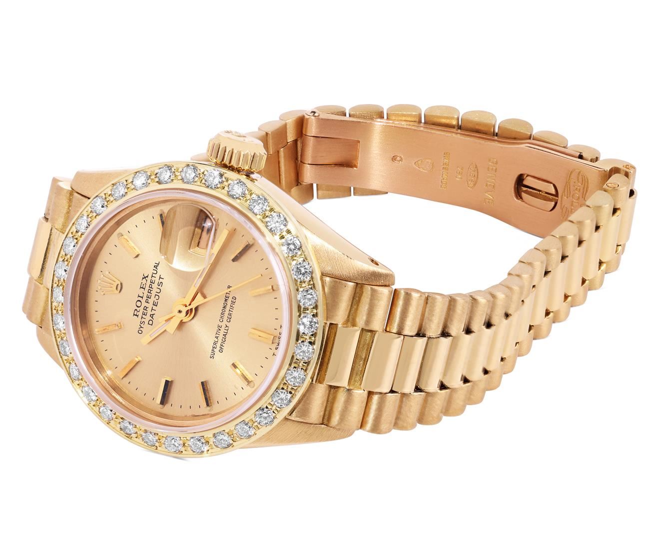 One Ladies Pre Owned Quickset Rolex 18K Yellow Gold President Polished, Serviced & Electronically Tested, Rolex 18K Yellow Gold Case: 26mm, Rolex 18K Yellow Gold Crown, Custom Bezel: New Beadset Diamond Bezel, Diamond Count: 32 Diamonds On Bezel. Custom C