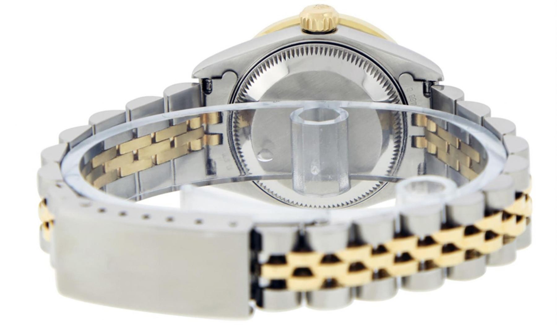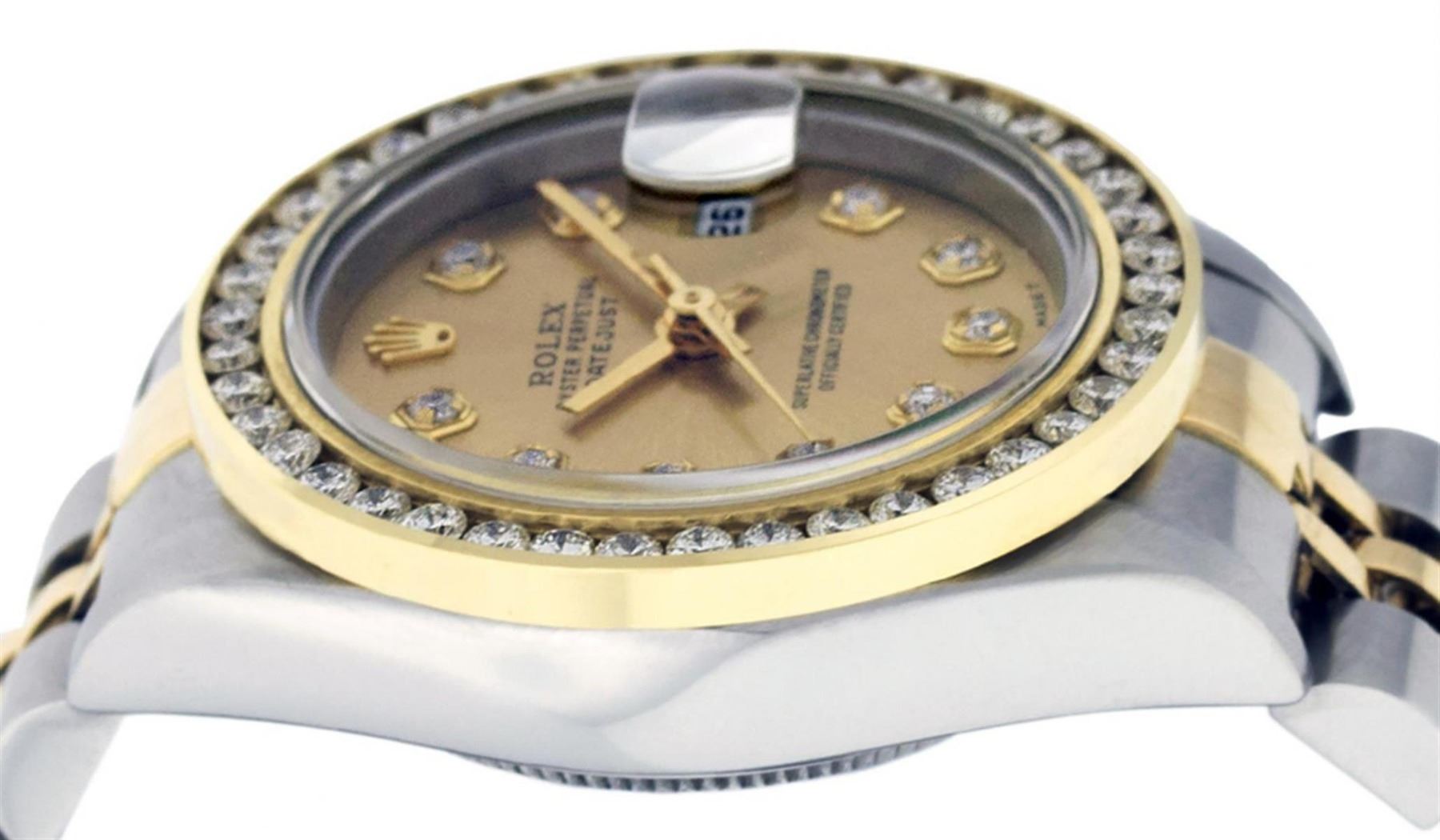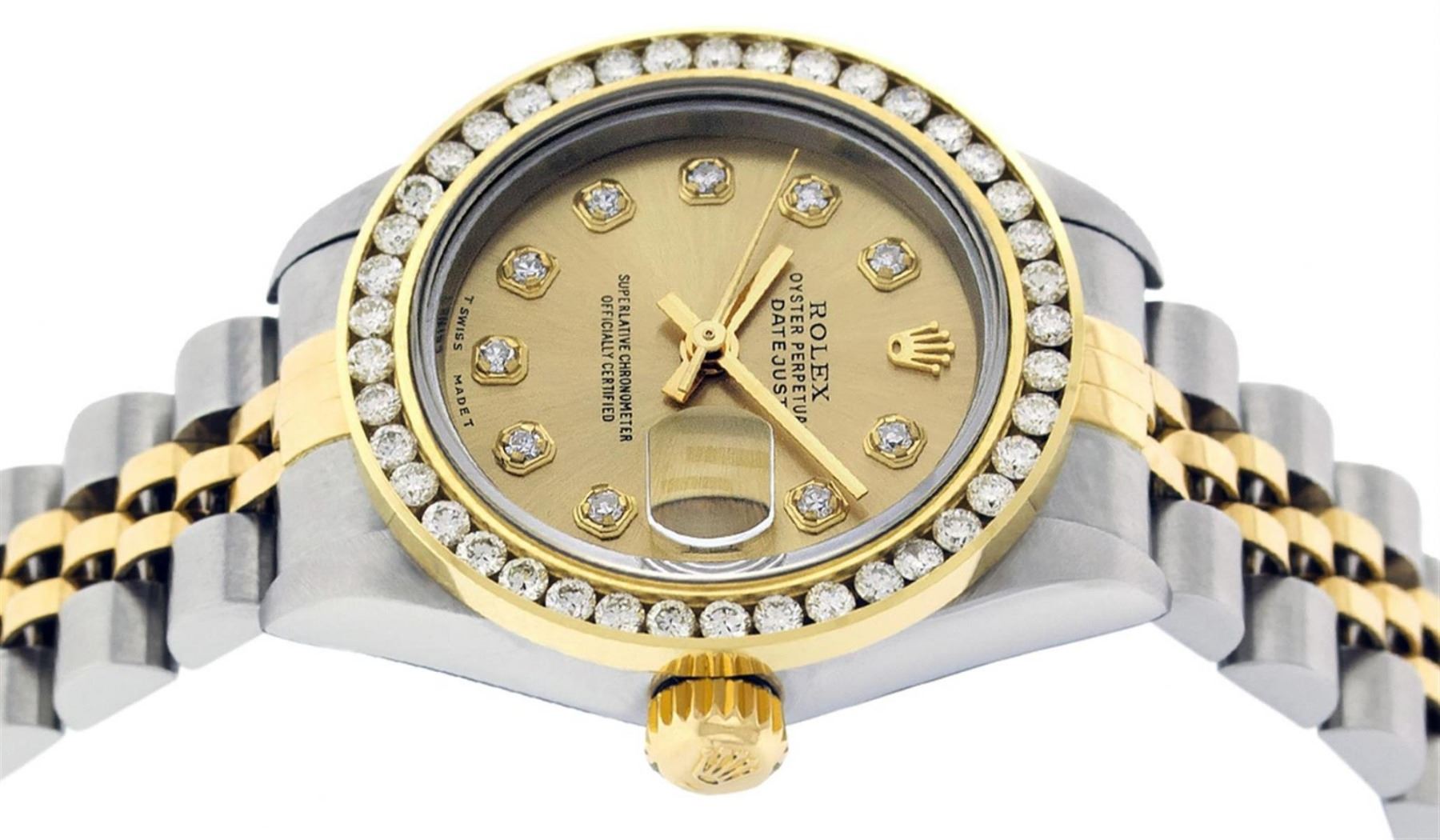 One Ladies 18K Two Tone Rolex Datejust Polished, Serviced & Electronically Tested, 18K Yellow Gold & Stainless Steel Case: 26mm, 18K Yellow Gold Crown, Custom Bezel: New 18K Yellow Gold Channel Set Diamond Bezel, Diamond Count: 44 Diamonds in dial, Total Weight 1.00 Carat, Clarity: SI-VS, Color: G to H. Custom Crystal: New Synthetic Sapphire Cyclops Lens. Custom Hands: New Luminescent Hands. Movement: Automatic Winding Movement Caliber 2235. Custom Dial: Champagne Single Cut Diamond Dial, Stone Count: 10 Diamonds, Clarity: VS2, Color: G to H. Date Window: 3 O'Clock Position Date Display, Model: Datejust. Condition: G-6 Extra Fine. Bracelet: Two Tone 18K Yellow Gold & Stainless Steel Jubilee Band. Bright Polish. 6.0 Inch Length, Adjustable. Standard Clasp, With Rolex Logo. This Watch Has Been Serviced Time Tested And Is In Excellent Condition It Is Free Of All Scratches And Dents.
