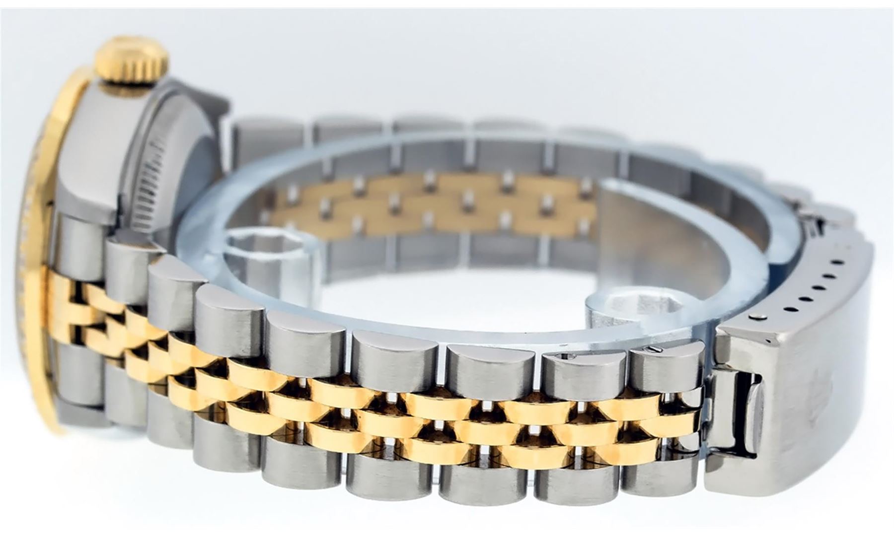 One Ladies 18K Two Tone Rolex Oyster Perpetual Datejust Polished, Serviced & Electronically Tested, 18K Yellow Gold & Stainless Steel Case: 26mm, 18K Yellow Gold Crown, Custom Bezel: New 18K Yellow Gold Beadset Diamond Bezel, Diamond Count: 43 Diamonds in dial, Total Weight .70 Carat, Clarity: SI-VS, Color: G to H. Custom Crystal: New Synthetic Sapphire Cyclops Lens. Custom Hands: New Luminescent Hands. Movement: Automatic Winding Movement. Custom Dial: Mother Of Pearl Diamond Dial, Stone Count: 10 Diamonds, Clarity: SI-VS, Color: G to H. Date Window: 3 O'Clock Position Date Display, Model: Datejust. Condition: G-6 Extra Fine. Bracelet: Two Tone 18K Yellow Gold & Stainless Steel Jubilee Band. Bright Polish. 6.0 Inch Length, Adjustable. Standard Clasp, With Rolex Logo. This Watch Has Been Serviced Time Tested And Is In Excellent Condition It Is Free Of All Scratches And Dents.