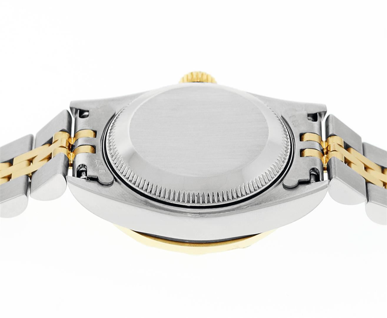 One Pre Owned Quickset Ladies Two Tone 18K Yellow Gold & Stainless Rolex Polished, Serviced & Electronically Tested, Rolex 18K Yellow Gold & Stainless Steel Case: 26mm. Rolex Yellow Gold Crown, Custom Bezel: New 18K Yellow Gold Pyramid Bezel, Diamond Count: 24 Diamonds On Bezel, Clarity: SI-VS, Color: G to H. Custom Crystal: New Sapphire With Magnified Date Window. Custom Hands: New Lumi Hands. Rolex Movement: Automatic Quickset Winding Movement 2235. Rolex Dial: Champagne Index With Lumi Dots And Dash Track. Date Window: 3 O'Clock Position Date Display, Model: Quickset Datejust, Condition: G-6 Extra Fine. Rolex Bracelet: Two Tone 18K Yellow Gold & Stainless Steel Jubilee Band. Bright Polish. 6.0 Inch Length, Adjustable. Standard Clasp, With Rolex Logo. This Watch Has Been Serviced Time Tested And Is In Excellent Condition It Is Free Of All Scratches And Dents.