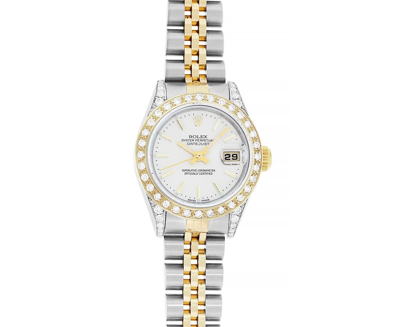One Pre Owned Quickset Ladies Two Tone 18K Yellow Gold & Stainless Rolex Polished, Serviced & Electronically Tested, Rolex 18K Yellow Gold & Stainless Steel Case: 26mm, Custom Diamond Lugs: Added Diamonds On Lugs, Diamond Count: 24 Diamonds On Lugs. Rolex Yellow Gold Crown, Custom Bezel: New 18K Yellow Gold Diamond Bezel, Diamond Count: 32 Diamonds, Clarity: SI-VS, Color: G to H. Custom Crystal: New Sapphire With Magnified Date Window. Custom Hands: New Lumi Hands. Rolex Movement: Automatic Quickset Winding Movement 2235. Rolex Dial: Silver Index With Lumi Dots And Dash Track. Date Window: 3 O'Clock Position Date Display, Model: Quickset Datejust, Condition: G-6 Extra Fine. Rolex Bracelet: Two Tone 18K Yellow Gold & Stainless Steel Jubilee Band. Bright Polish. 6.0 Inch Length, Adjustable. Standard Clasp, With Rolex Logo. This Watch Has Been Serviced Time Tested And Is In Excellent Condition It Is Free Of All Scratches And Dents.