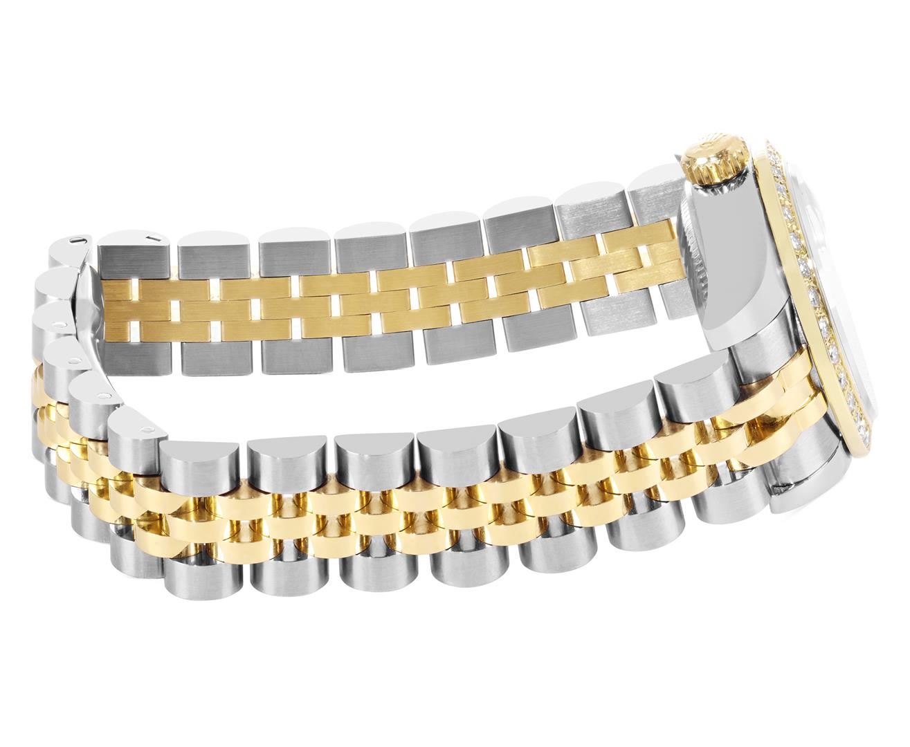 One Rolex Ladies Pre Owned Two Tone 18K Yellow Gold & Stainless Steel Rolex Datejust Polished, Serviced & Electronically Tested, Rolex Yellow Gold & Stainless Steel Case: 26mm, Rolex Yellow Gold Crown. Custom Bezel: New 18K Yellow Gold Beadset Diamond Bez
