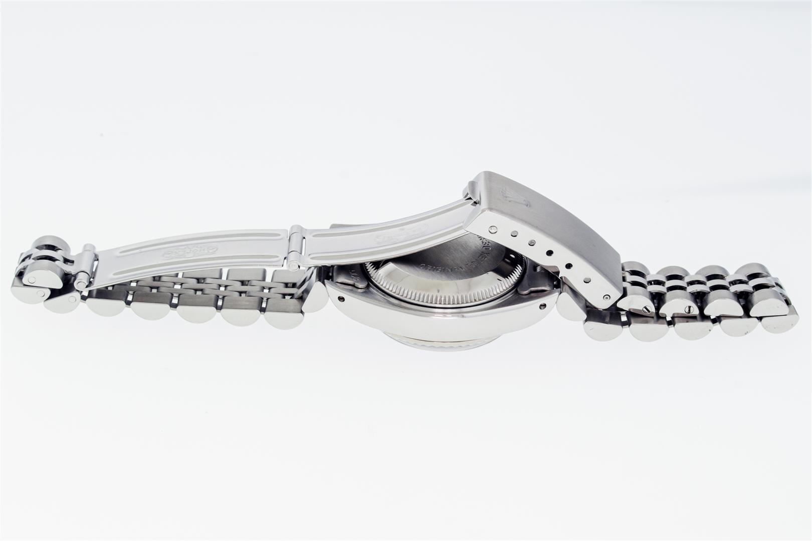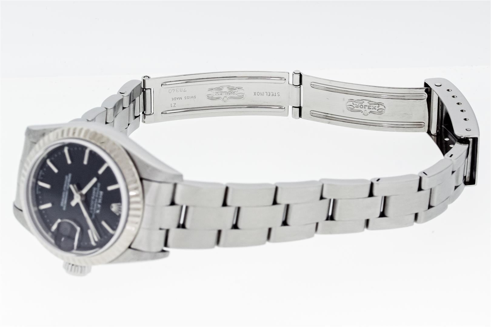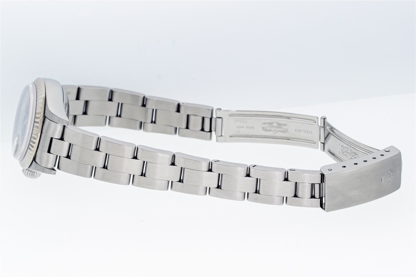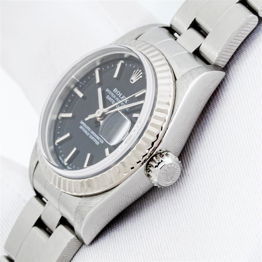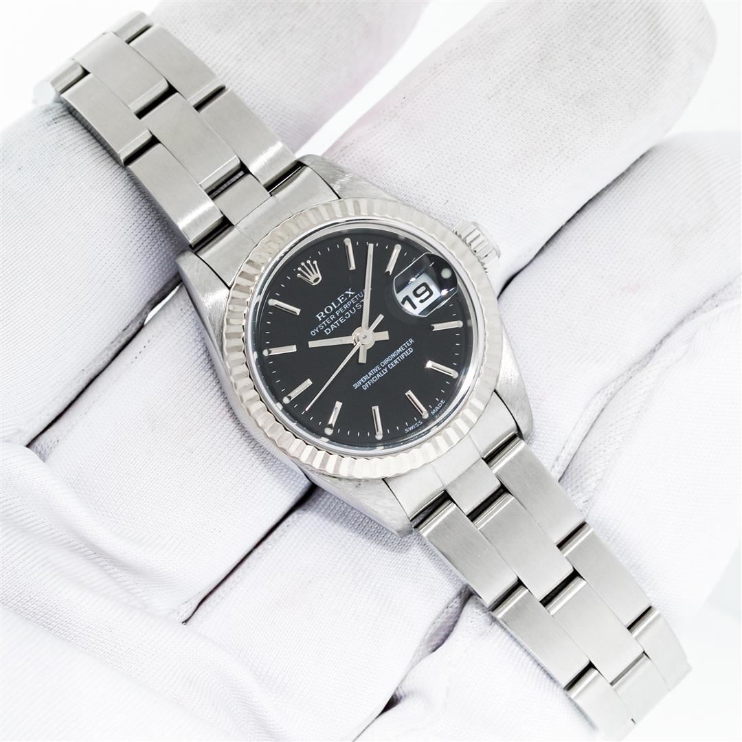 One Ladies Pre Owned Quickset Stainless Steel Rolex Datejust Polished Bright with Satin Finish, Serviced & Electronically Tested, Stainless Steel Case: 26mm, Rolex Stainless Steel Crown, Rolex Bezel: 18K White Gold Fluted Bezel. Crystal: Sapphire With Magnified Date Window. Custom Hands: Luminescent Hands. Rolex Movement: Automatic Winding Movement 2235. Rolex Dial: Black Index With Dash Track. Date Window: 3 O'Clock Position Date Display, Model: Datejust. Condition: G-6 Extra Fine. Rolex Bracelet: Stainless Steel Oyster Band. Bright Polish & Satin Finish. 6.0 Inch Length, Adjustable. Standard Clasp, With Rolex Logo. This Watch Has Been Serviced Time Tested And Is In Excellent Condition It Is Free Of All Scratches And Dents.