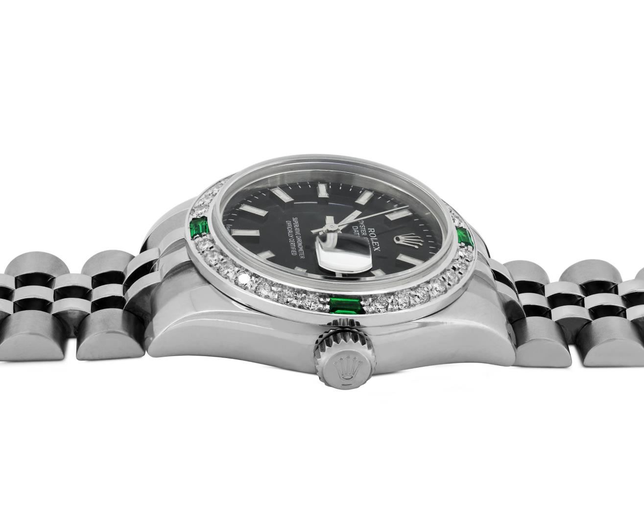One Rolex Ladies Pre Owned Quickset Stainless Steel Date Wristwatch Polished Bright with Satin Finish, Serviced And Electronically Tested, Stainless Steel Case: 26mm, Stainless Steel Crown, Custom Bezel: New 18K White Gold Emerald Beadset Diamond Bezel, Diamond + Gem Count: 36 Diamonds + 4 Emeralds. Crystal: Sapphire With Magnified Date Window. Hands: Luminescent Hands. Rolex Movement: 2235 Automatic Winding Movement. Rolex Dial: Factory Black With Index Hour Markers And Dash Tracks. Date Window: 3 O'Clock Position Date Display, Model: Sapphire Quickset Date. Condition: G-6 Extra Fine. Rolex Bracelet: Stainless Steel Jubilee Band. Bright Polish & Satin Finish. 6.0 Inch Length, Adjustable. Hidden Clasp, With Rolex Logo. This Watch Has Been Serviced And Time Tested. It Is In Excellent Condition, Free Of All Scratches And Dents. This Watch Comes With A Rolex Box.