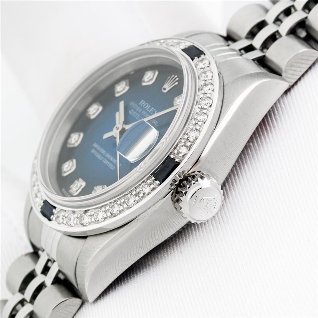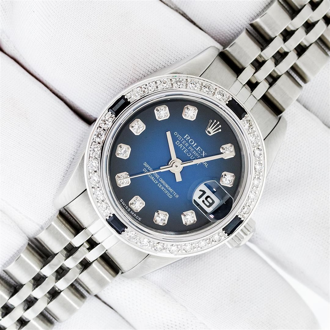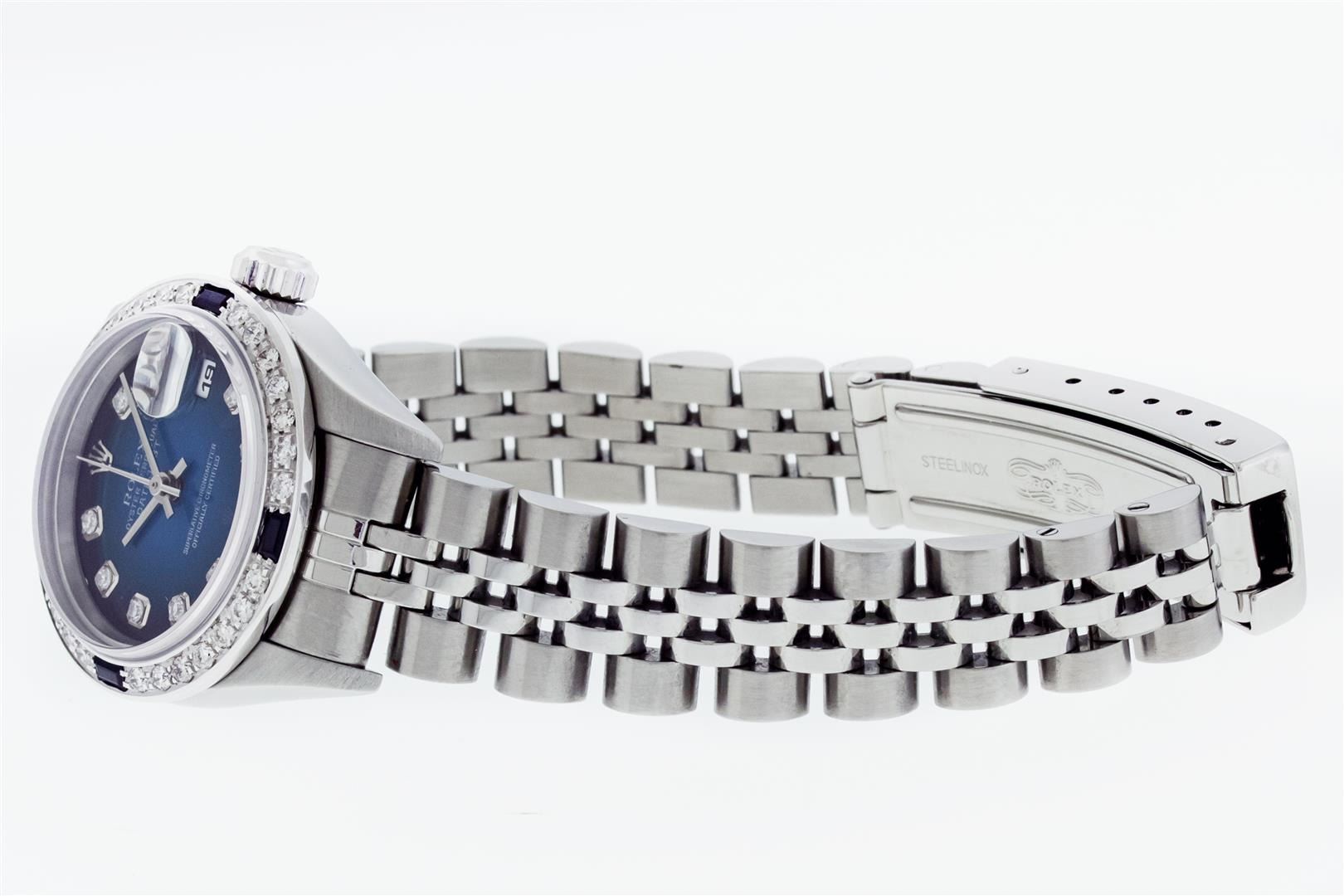One Ladies Pre Owned Quickset Stainless Steel Rolex Datejust Polished Bright with Satin Finish, Serviced & Electronically Tested, Stainless Steel Case: 26mm, Rolex Stainless Steel Crown, Custom Bezel: New 18K White Gold Sapphire Bead Set Diamond Bezel, Diamond + Gem Count: 28 Diamonds + 4 Sapphires. Custom Crystal: New Sapphire With Magnified Date Window. Custom Hands: New Hands. Rolex Movement: Automatic Winding Movement 2235. Custom Dial: Blue Vignette With Added Diamond Hour Markers, Diamond Count: 10 Diamonds On Dial. Date Window: 3 O'Clock Position Date Display, Model: Quickset Datejust. Condition: G-6 Extra Fine. Rolex Bracelet: Stainless Steel Jubilee Band. Bright Polish & Satin Finish. 6.0 Inch Length, Adjustable. Standard Clasp, With Rolex Logo. This Watch Has Been Serviced Time Tested And Is In Excellent Condition It Is Free Of All Scratches And Dents.