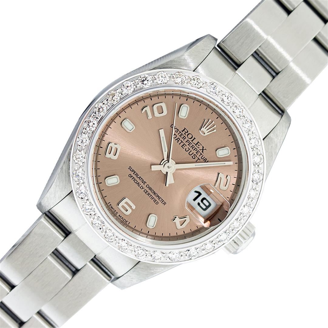 One Ladies Pre Owned Quickset Stainless Steel Rolex Datejust Polished Bright with Satin Finish, Serviced & Electronically Tested, Stainless Steel Case: 26mm, Rolex Stainless Steel Crown, Custom Bezel: New 18K White Gold Bead Set Diamond Bezel, Diamond Count: 32 Diamonds, Clarity: SI-VS, Color: G to H. Custom Crystal: New Sapphire With Magnified Date Window. Custom Hands: New Luminescent Hands. Rolex Movement: Automatic Winding Movement 2235. Rolex Dial: Salmon With Arabic Hour Markers & Dash Track. Date Window: 3 O'Clock Position Date Display, Model: Datejust. Condition: G-6 Extra Fine. Rolex Bracelet: Stainless Steel Oyster Band. Bright Polish & Satin Finish. 6.0 Inch Length, Adjustable. Standard Clasp, With Rolex Logo. This Watch Has Been Serviced Time Tested And Is In Excellent Condition It Is Free Of All Scratches And Dents.