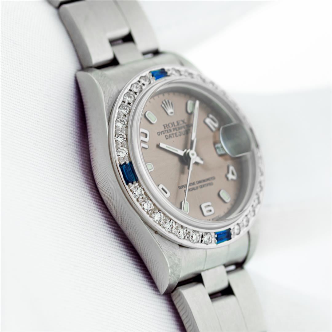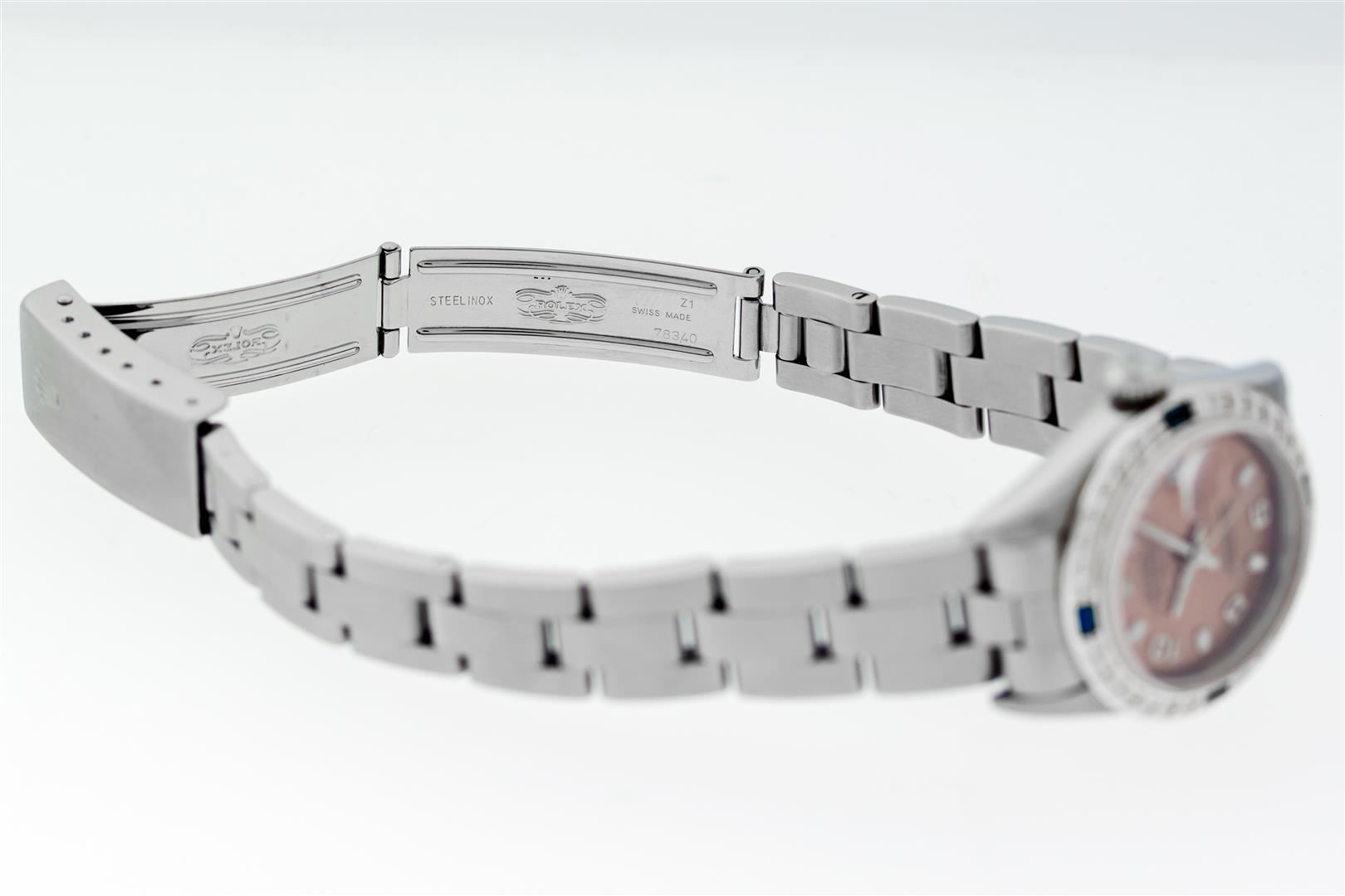 One Ladies Pre Owned Stainless Steel Rolex Datejust Polished Bright with Satin Finish, Serviced & Electronically Tested, Stainless Steel Case: 26mm, Rolex Stainless Steel Crown, Custom Bezel: New 18K White Gold Sapphire Bead Set Diamond Bezel, Diamond + Gem Count: 28 Diamonds + 4 Sapphires, Clarity: SI-VS, Color: G to H. Custom Crystal: New Sapphire With Magnified Date Window. Custom Hands: New Luminescent Hands. Rolex Movement: Automatic Winding Movement 2235. Rolex Dial: Salmon With Arabic Hour Markers & Dash Track. Date Window: 3 O'Clock Position Date Display, Model: Quickset Datejust. Condition: G-6 Extra Fine. Rolex Bracelet: Stainless Steel Oyster Band. Bright Polish & Satin Finish. 6.0 Inch Length, Adjustable. Standard Clasp, With Rolex Logo. This Watch Has Been Serviced Time Tested And Is In Excellent Condition It Is Free Of All Scratches And Dents.