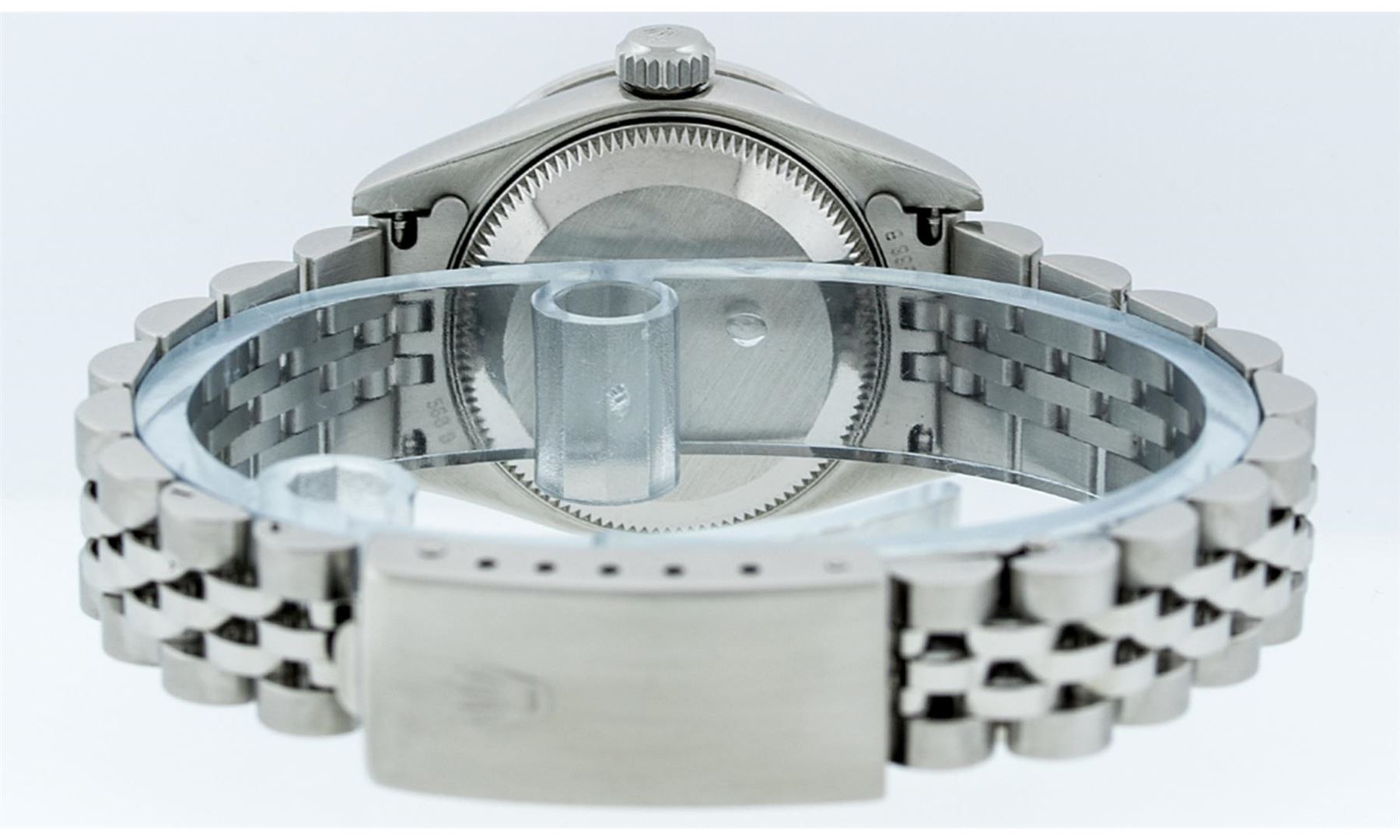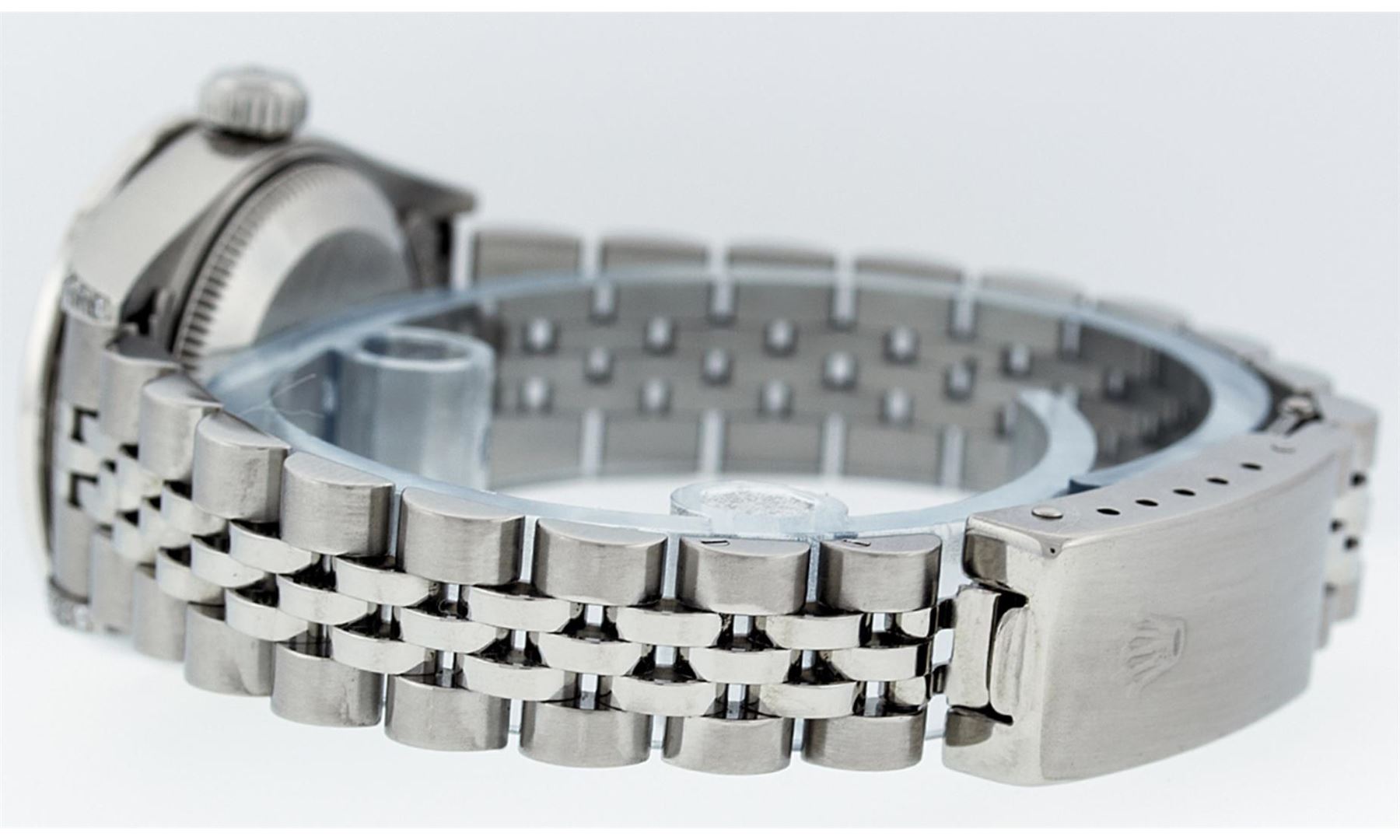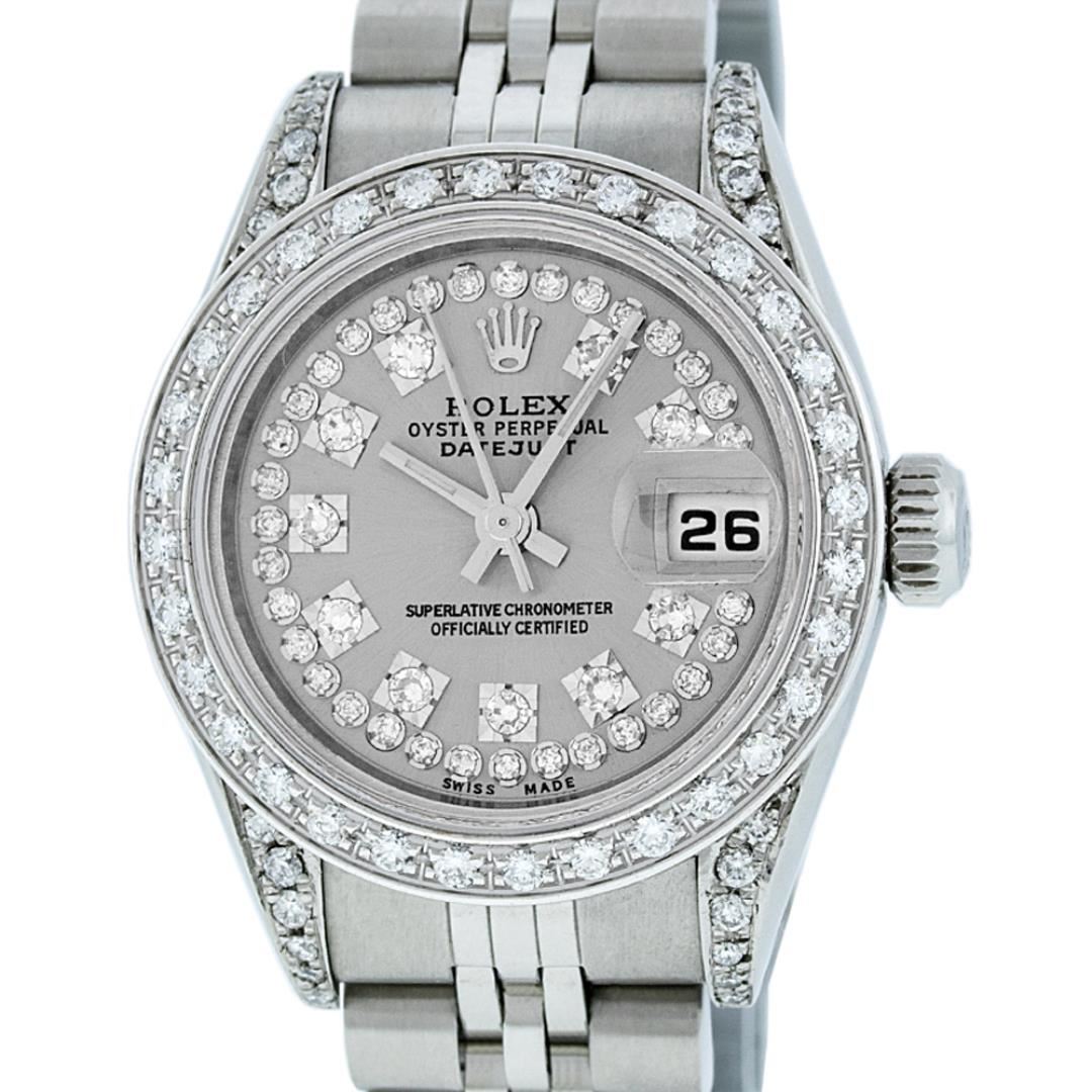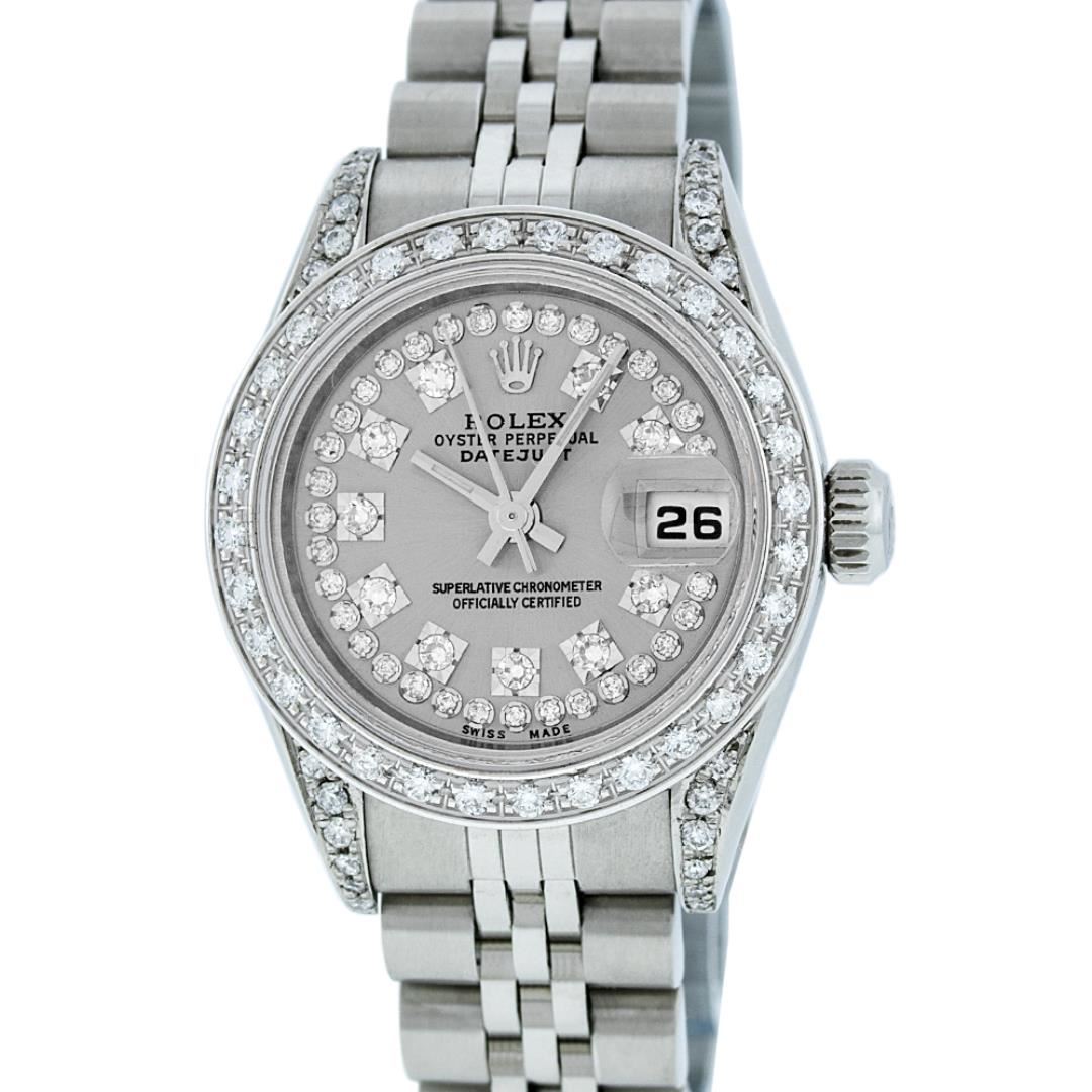 One Ladies Pre Owned Quickset Sapphire Stainless Steel Rolex Datejust Polished Bright with Satin Finish, Serviced And Electronically Tested, Stainless Steel Case: 26mm, Stainless Steel Crown, Custom Diamond Lugs: 24 Added Diamonds On Lugs. Custom Bezel: New 18K White Gold Beadset Diamond Bezel, Diamond Count: 32 Diamonds. Custom Crystal: New Sapphire With Date Window. Custom Hands: New Luminescent Hands. Rolex Movement: Automatic Quickset Winding Movement 2235. Custom Dial: Custom Grey Dial With Added Diamonds, 43 Diamonds On Dial. Date Window: 3 O'Clock Position Date Display, Model: Quickset Datejust. Condition: G-6 Extra Fine. Rolex Bracelet: Stainless Steel Jubilee Band. Bright Polish And Satin Finish. 6.0 Inch Length, Adjustable. Standard Clasp, With Rolex Logo. This Watch Has Been Serviced Time Tested And Is In Excellent Condition It Is Free Of All Scratches And Dents.