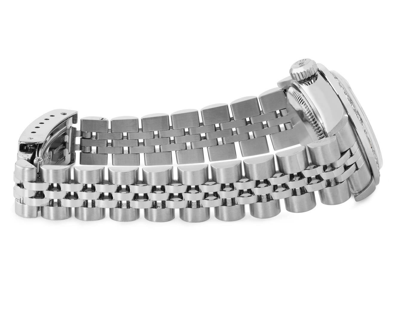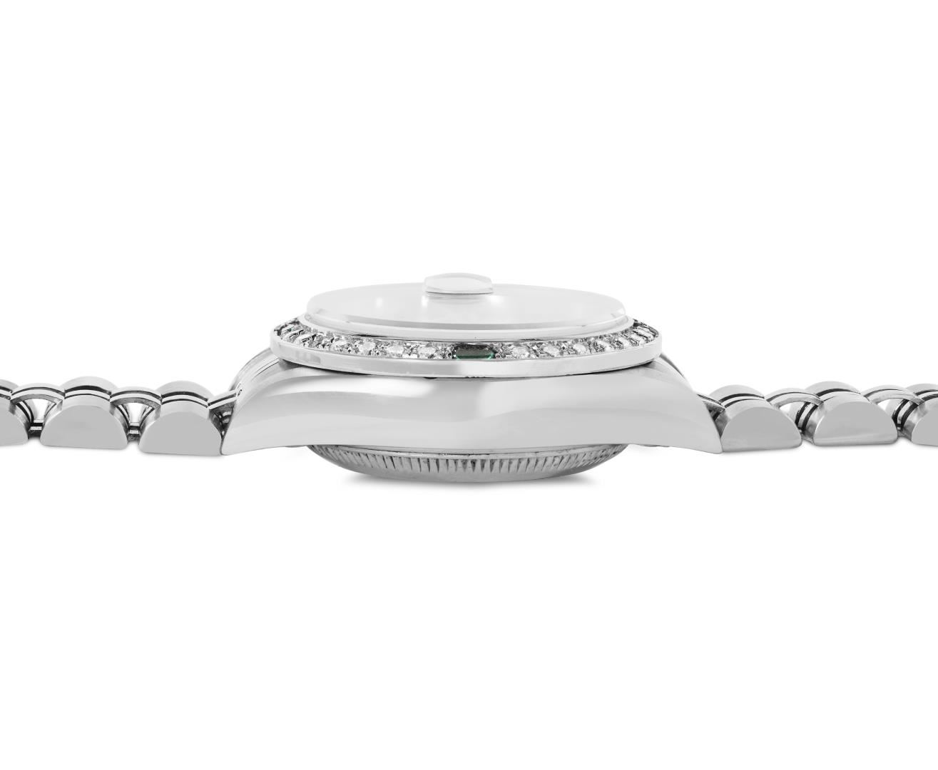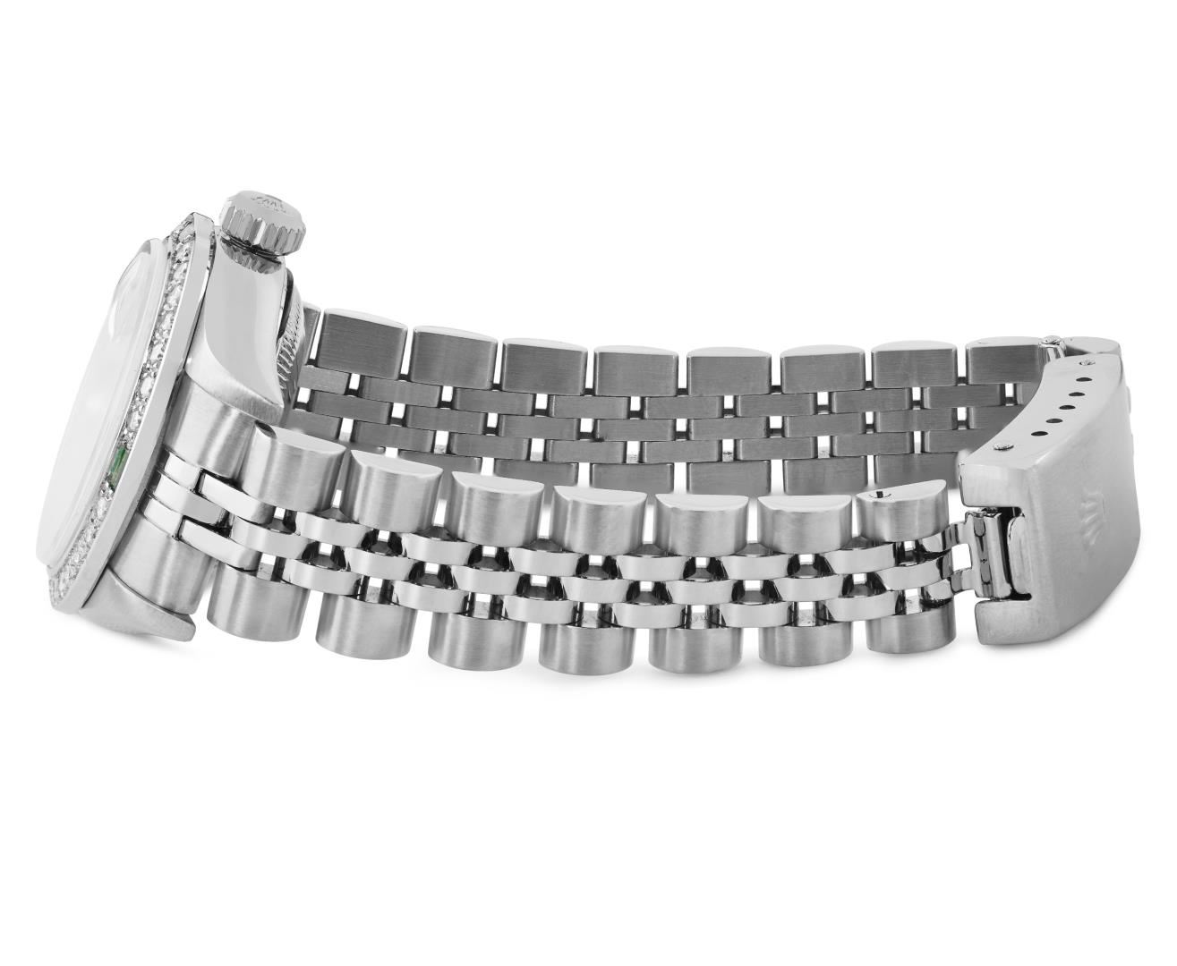One Rolex Ladies Pre Owned Quickset Stainless Steel Datejust Wristwatch Polished Bright with Satin Finish, Serviced And Electronically Tested, Stainless Steel Case: 26mm, Stainless Steel Crown, Custom Bezel: New 18K White Gold Emerald Beadset Diamond Bezel, Diamond + Gem Count: 36 Diamonds + 4 Emeralds. Custom Crystal: New Sapphire With Magnified Date Window. Custom Hands: New Luminescent Hands. Rolex Movement: 2235 Automatic Winding Movement. Rolex Dial: Factory Silver Dial With Index Hour Markers, and Dash Track. Date Window: 3 O'Clock Position Date Display, Model: Quickset Datejust. Condition: G-6 Extra Fine. Rolex Bracelet: Stainless Steel Jubilee Band. Bright Polish And Satin Finish. 6.0 Inch Length, Adjustable. Standard Clasp, With Rolex Logo. This Watch Has Been Serviced Time Tested And Is In Excellent Condition. It Is Free Of All Scratches And Dents. This Watch Comes With A Rolex Box.