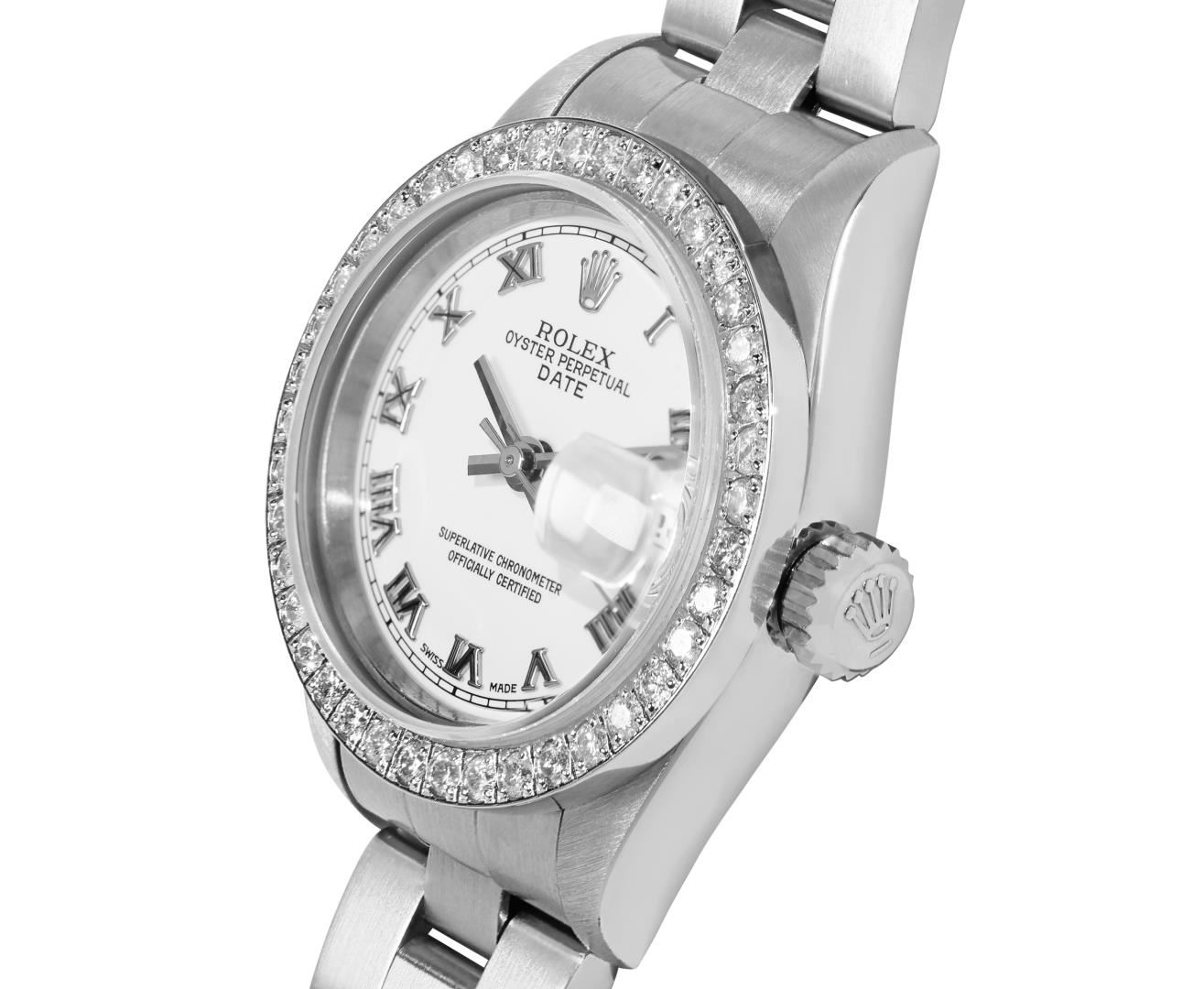One Rolex Ladies Quickset Pre Owned Stainless Steel Date Wristwatch Polished Bright with Satin Finish, Serviced & Electronically Tested, Stainless Steel Case: 26mm, Stainless Steel Crown, Custom Bezel: New Stainless Steel Beadset Diamond Bezel, Diamond Count: 40 Diamonds On Bezel. Custom Crystal: New Sapphire With Magnified Date Window. Custom Hands: New Solid Hands. Rolex Movement: 2235 Automatic Winding Movement. Rolex Dial: Factory White With Roman Hour Markers, Square Track. Date Window: 3 O'Clock Position Date Display, Model: Quickset Sapphire Date. Condition: G-6 Extra Fine. Rolex Bracelet: Stainless Steel Jubilee Band. Bright Polish & Satin Finish. 6.0 Inch Length, Adjustable. Standard Clasp, With Rolex Logo. This Watch Has Been Serviced And Time Tested. It Is In Excellent Condition, Free Of All Scratches And Dents.