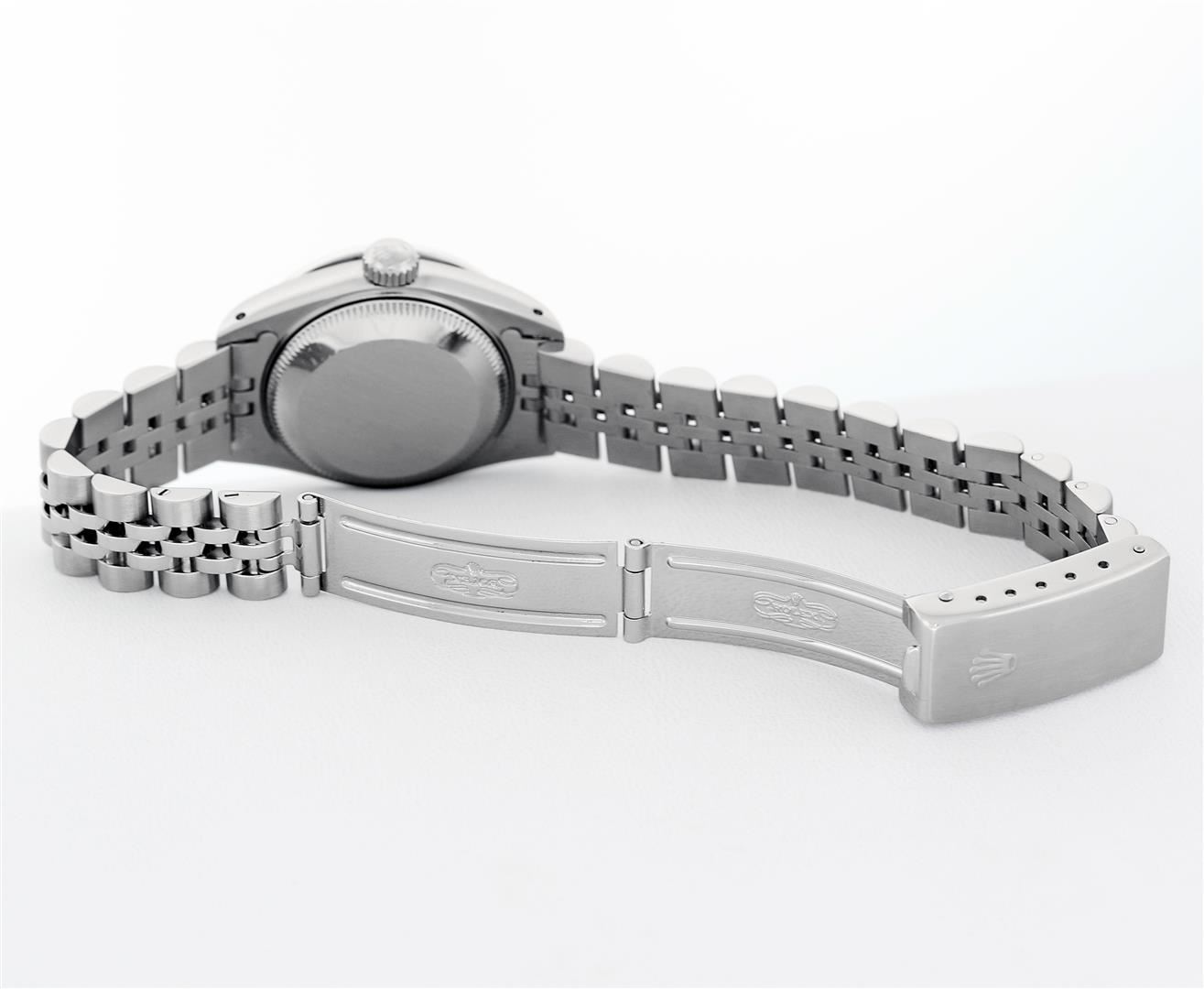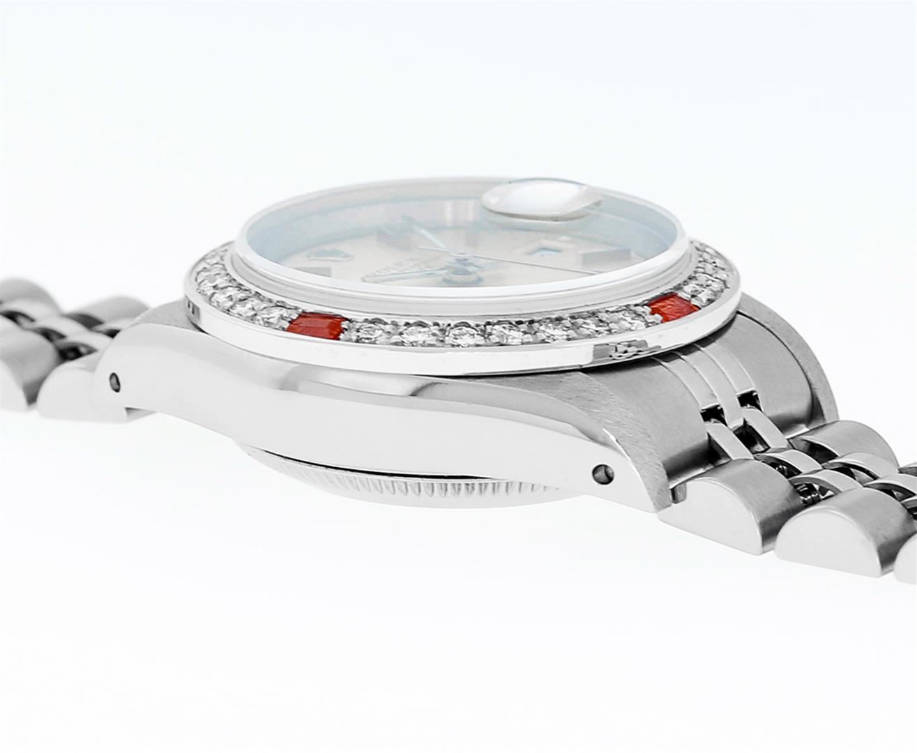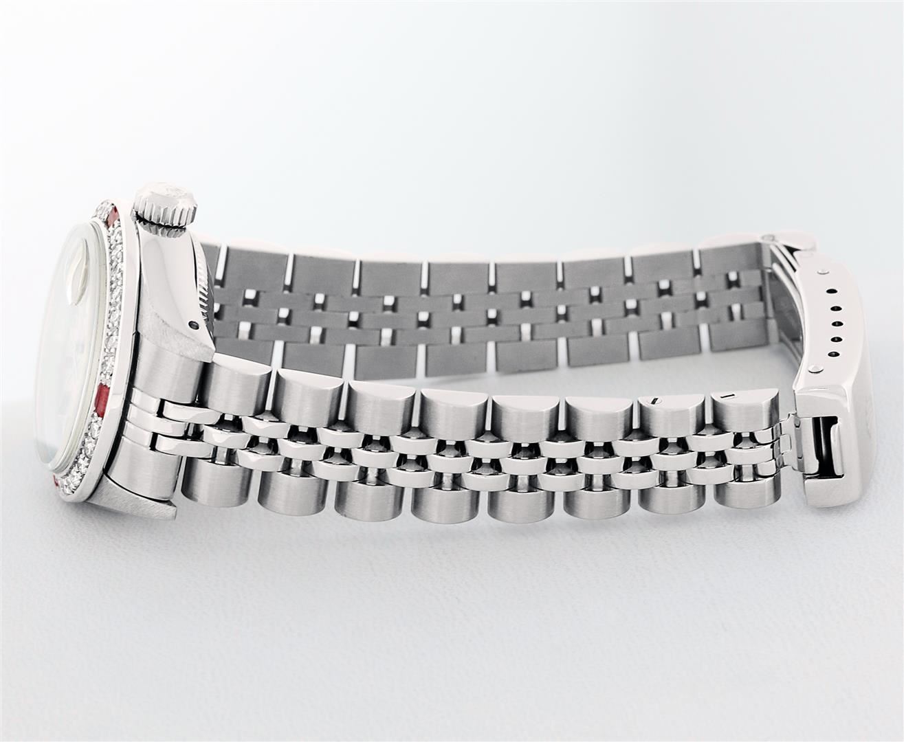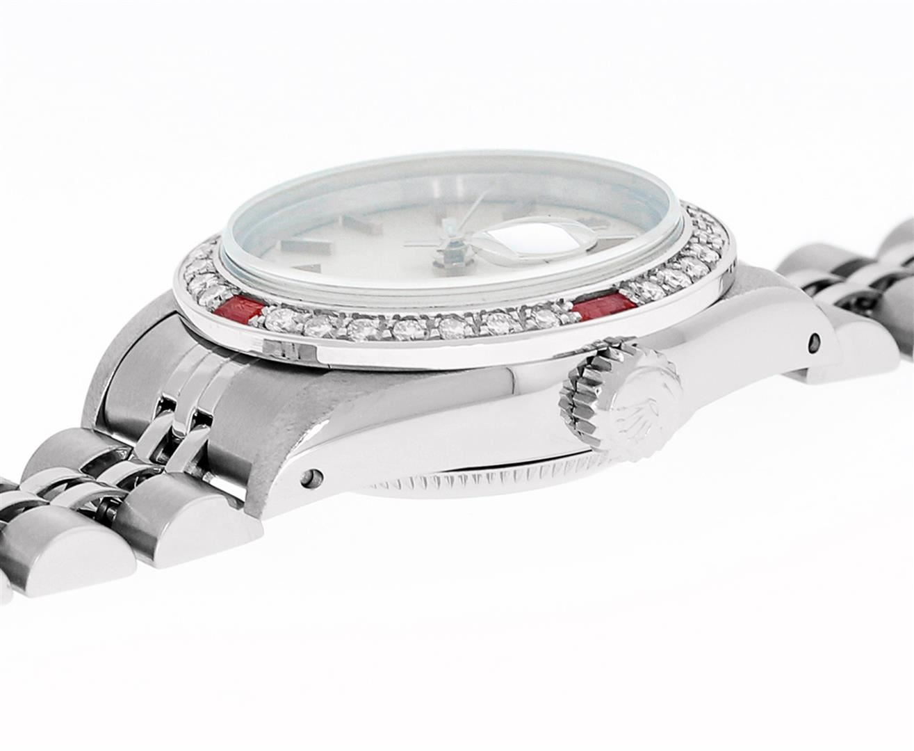One Ladies Pre Owned Quickset Stainless Steel Rolex Datejust Polished Bright with Satin Finish, Serviced & Electronically Tested, Rolex Stainless Steel Case: 26mm, Rolex Stainless Steel Crown, Custom Bezel: 18K White Gold Beadset Ruby Bezel, Stone Count: 28 Diamonds + 4 Rubies, Diamond Color: G To H, Clarity: SI-VS. Custom Crystal: New Sapphire With Magnified Date Window. Custom Hands: New Luminescent Hands. Rolex Movement: Quickset Automatic Winding Movement 2130. Rolex Dial: Silver Index Dial With Luminescent Dots & Dash Track. Date Window: 3 O'Clock Position Date Display, Model: Sapphire Quickset Datejust. Condition: G-6 Extra Fine. Rolex Bracelet: Stainless Steel Jubilee Band. Bright Polish & Satin Finish. 6.0 Inch Length, Adjustable. Standard Clasp, With Rolex Logo. This Watch Has Been Serviced Time Tested And Is In Excellent Condition It Is Free Of All Scratches And Dents.