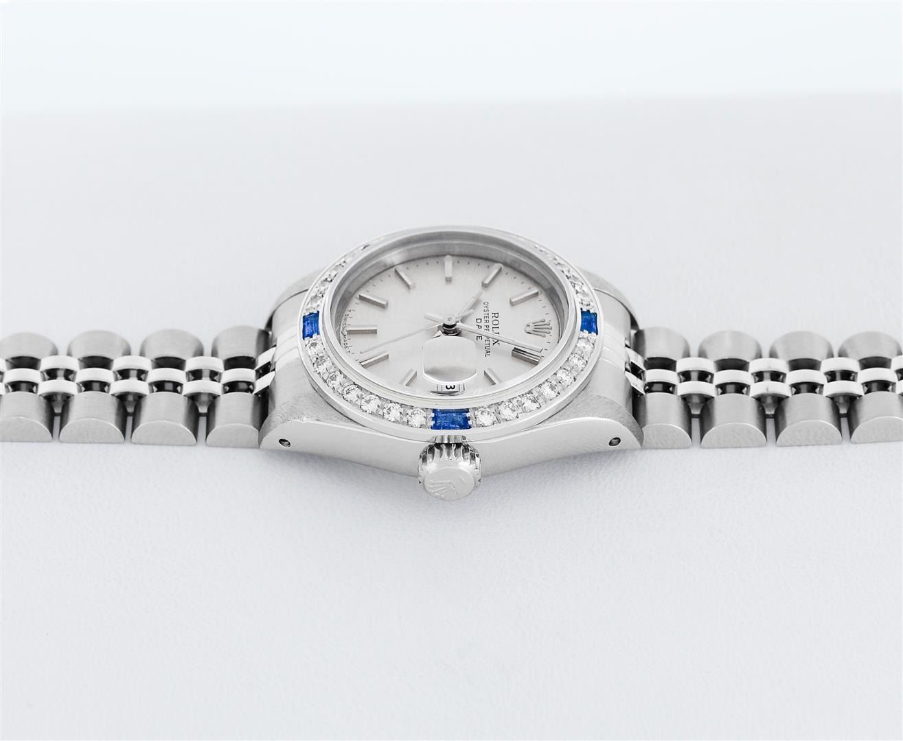 One Ladies Pre Owned Quickset Stainless Steel Rolex Datejust Polished Bright with Satin Finish, Serviced & Electronically Tested, Rolex Stainless Steel Case: 26mm, Rolex Stainless Steel Crown, Custom Bezel: New 18K White Gold Beadset And Sapphire Bezel, Stone Count: 28 Diamonds + 4 Sapphires, Diamond Color: G To H, Clarity: SI-VS. Custom Crystal: New Sapphire With Magnified Date Window. Custom Hands: New Luminescent Hands. Rolex Movement: Quickset Automatic Winding Movement 2130. Rolex Dial: Silver Index Dial With Luminescent Dots & Dash Track. Date Window: 3 O'Clock Position Date Display, Model: Sapphire Quickset Datejust. Condition: G-6 Extra Fine. Rolex Bracelet: Stainless Steel Jubilee Band. Bright Polish & Satin Finish. 6.0 Inch Length, Adjustable. Standard Clasp, With Rolex Logo. This Watch Has Been Serviced Time Tested And Is In Excellent Condition It Is Free Of All Scratches And Dents.