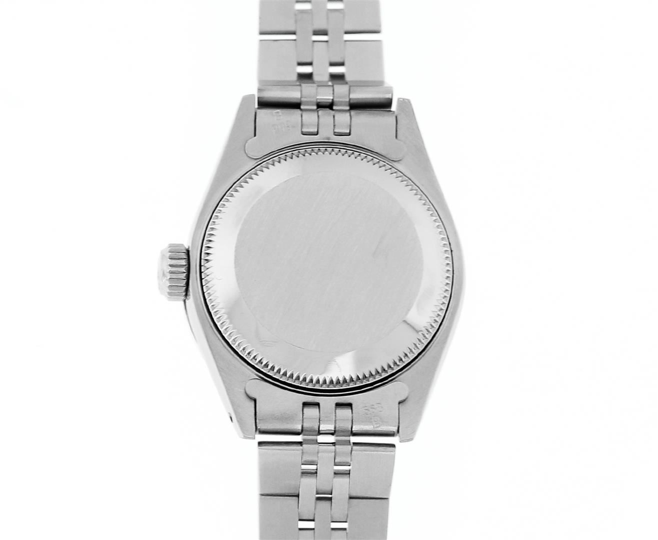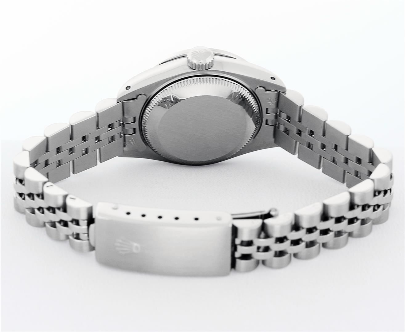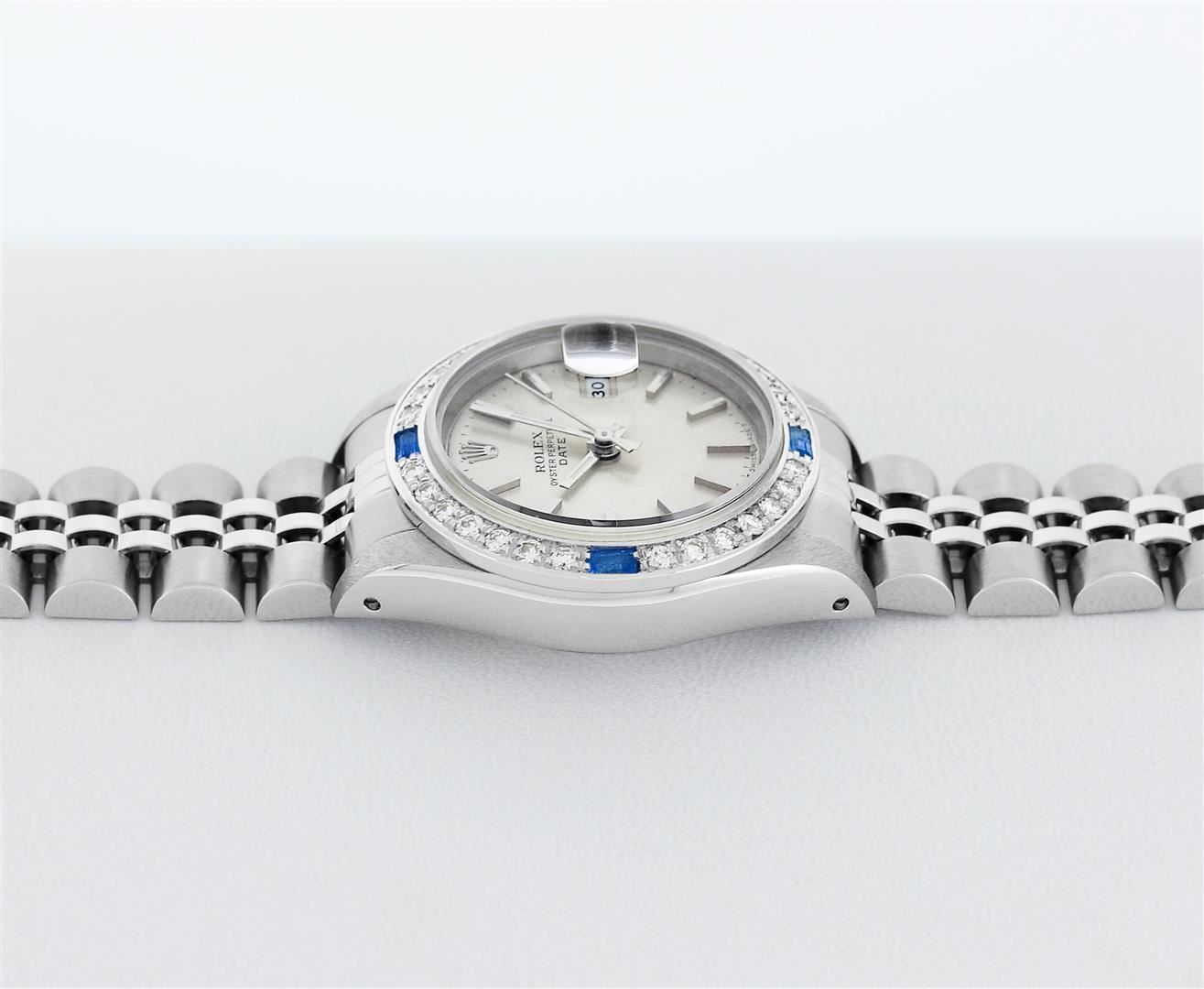One Ladies Pre Owned Quickset Stainless Steel Rolex Datejust Polished Bright with Satin Finish, Serviced & Electronically Tested, Rolex Stainless Steel Case: 26mm, Rolex Stainless Steel Crown, Custom Bezel: New 18K White Gold Beadset And Sapphire Bezel, Stone Count: 28 Diamonds + 4 Sapphires, Diamond Color: G To H, Clarity: SI-VS. Custom Crystal: New Sapphire With Magnified Date Window. Custom Hands: New Luminescent Hands. Rolex Movement: Quickset Automatic Winding Movement 2130. Rolex Dial: Silver Index Dial With Luminescent Dots & Dash Track. Date Window: 3 O'Clock Position Date Display, Model: Sapphire Quickset Datejust. Condition: G-6 Extra Fine. Rolex Bracelet: Stainless Steel Jubilee Band. Bright Polish & Satin Finish. 6.0 Inch Length, Adjustable. Standard Clasp, With Rolex Logo. This Watch Has Been Serviced Time Tested And Is In Excellent Condition It Is Free Of All Scratches And Dents.