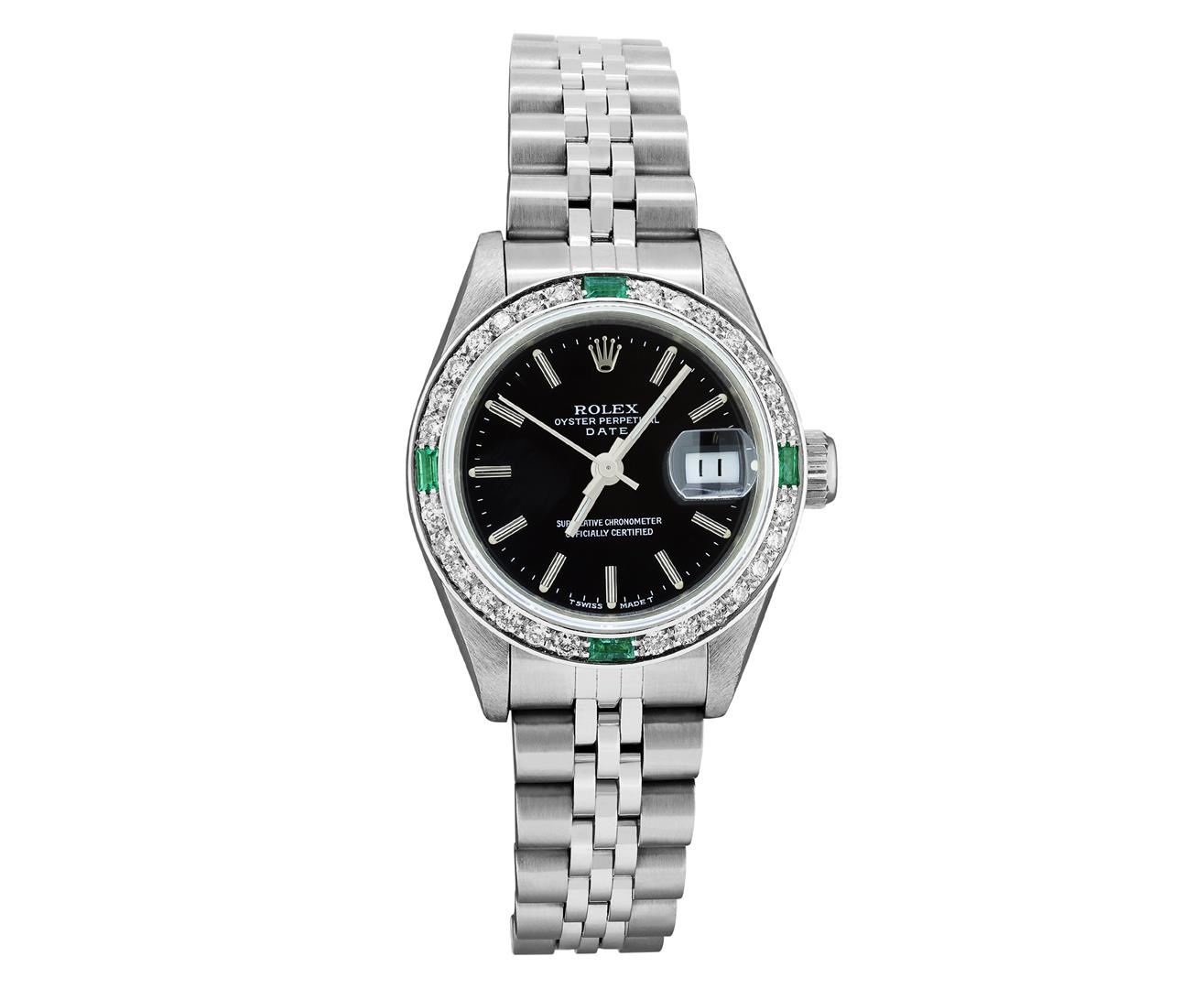 One Rolex Ladies Quickset Pre Owned Stainless Steel Date Wristwatch Polished Bright with Satin Finish, Serviced & Electronically Tested, Stainless Steel Case: 26mm, Stainless Steel Crown, Custom Bezel: New 18K White Gold Emerald Beadset Diamond Bezel, Diamond + Gem Count: 36 Diamonds + 4 Emeralds, Clarity: SI-VS, Color: G to H. Custom Crystal: New Sapphire With Magnified Date Window. Custom Hands: New Luminescent Hands. Rolex Movement: 2135 Automatic Winding Movement. Rolex Dial: Factory Black Dial With Index Hour Markers And Lumi Dots. Date Window: 3 O'Clock Position Date Display, Model: Quickset Datejust. Condition: G-6 Extra Fine. Rolex Bracelet: Stainless Steel Jubilee Band. Bright Polish & Satin Finish. 6.0 Inch Length, Adjustable. Standard Clasp, With Rolex Logo. This Watch Has Been Serviced And Time Tested. It Is In Excellent Condition, Free Of All Scratches And Dents. This Watch Comes With A Rolex Box.