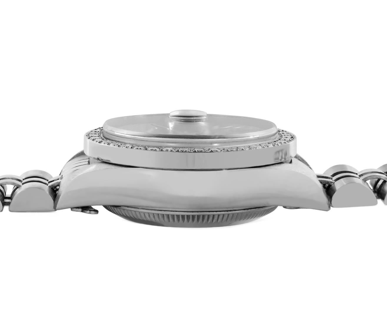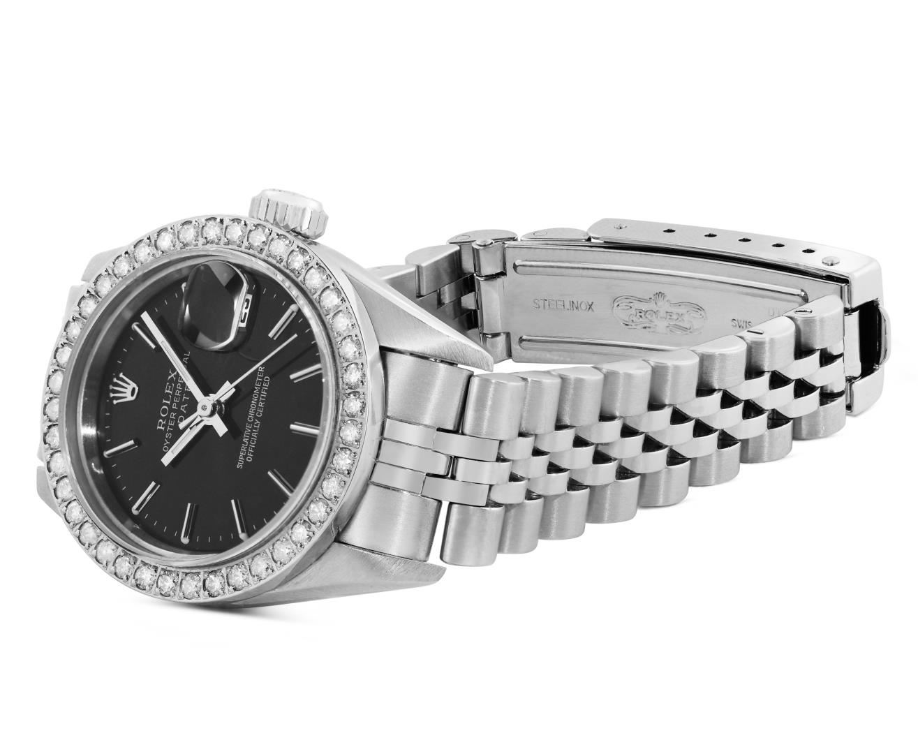 One Rolex Ladies Quickset Pre Owned Stainless Steel Date Wristwatch Polished Bright with Satin Finish, Serviced & Electronically Tested, Stainless Steel Case: 26mm, Stainless Steel Crown, Custom Bezel: New Stainless Steel Beadset Diamond Bezel, Diamond Count: 40 Diamonds On Bezel. Custom Crystal: New Sapphire With Magnified Date Window. Hands: Luminescent Hands. Rolex Movement: 2235 Automatic Winding Movement. Rolex Dial: Factory Black Dial With Index Hour Markers And Lumi Dots. Date Window: 3 O'Clock Position Date Display, Model: Quickset Sapphire Date. Condition: G-6 Extra Fine. Rolex Bracelet: Stainless Steel Jubilee Band. Bright Polish & Satin Finish. 6.0 Inch Length, Adjustable. Standard Clasp, With Rolex Logo. This Watch Has Been Serviced And Time Tested. It Is In Excellent Condition, Free Of All Scratches And Dents.