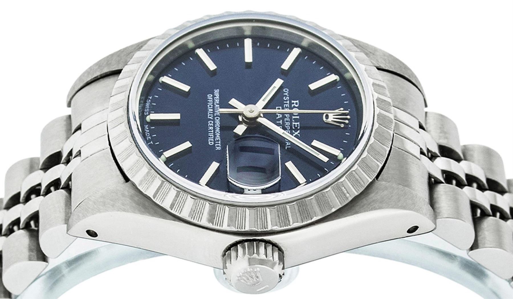 One Ladies Pre Owned Quickset Stainless Steel Rolex Date Polished Bright with Satin Finish, Serviced & Electronically Tested, Rolex Stainless Steel Case: 26mm, Rolex Stainless Steel Crown, Rolex Bezel: Stainless Steel Engine Turn Bezel. Crystal: Sapphire With Magnified Date Window. Hands: Luminescent Hands. Rolex Movement: Automatic Winding Movement 2230. Rolex Dial: Blue Index Dial With Luminescent Dots & Dash Track. Date Window: 3 O'Clock Position Date Display, Model: Sapphire Quickset Date Caliber 2230. Condition: G-6 Extra Fine. Rolex Bracelet: Stainless Steel Jubilee Band. Bright Polish & Satin Finish. 6.0 Inch Length, Adjustable. Standard Clasp, With Rolex Logo. This Watch Has Been Serviced Time Tested And Is In Excellent Condition It Is Free Of All Scratches And Dents.