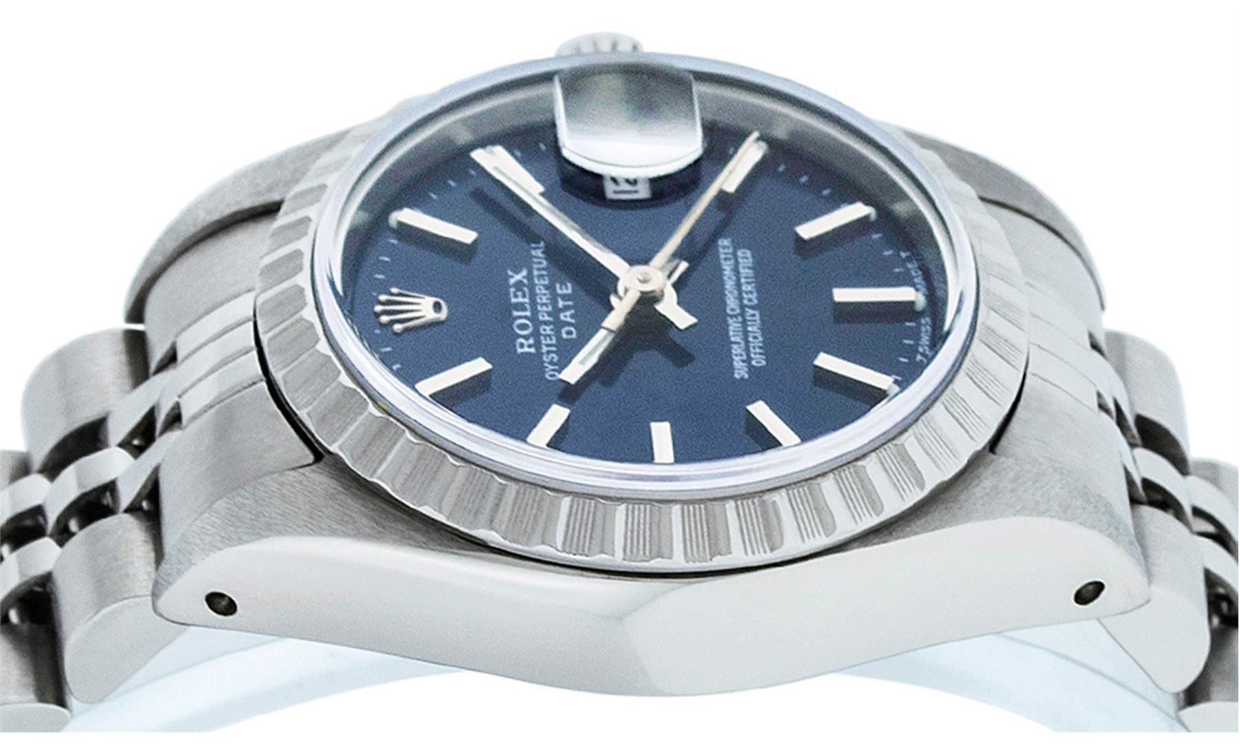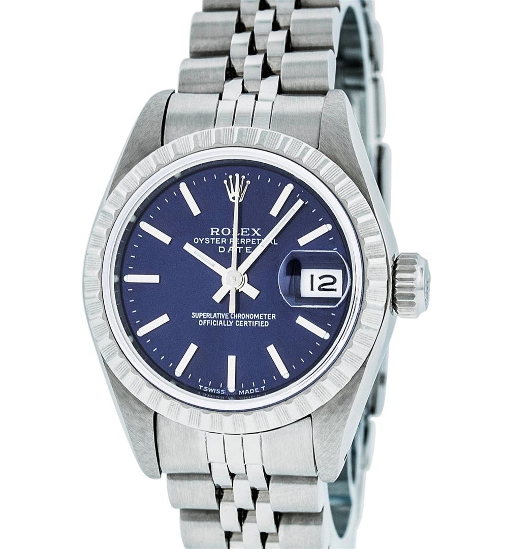 One Ladies Pre Owned Quickset Stainless Steel Rolex Date Polished Bright with Satin Finish, Serviced & Electronically Tested, Rolex Stainless Steel Case: 26mm, Rolex Stainless Steel Crown, Rolex Bezel: Stainless Steel Engine Turn Bezel. Crystal: Sapphire With Magnified Date Window. Hands: Luminescent Hands. Rolex Movement: Automatic Winding Movement 2230. Rolex Dial: Blue Index Dial With Luminescent Dots & Dash Track. Date Window: 3 O'Clock Position Date Display, Model: Sapphire Quickset Date Caliber 2230. Condition: G-6 Extra Fine. Rolex Bracelet: Stainless Steel Jubilee Band. Bright Polish & Satin Finish. 6.0 Inch Length, Adjustable. Standard Clasp, With Rolex Logo. This Watch Has Been Serviced Time Tested And Is In Excellent Condition It Is Free Of All Scratches And Dents.