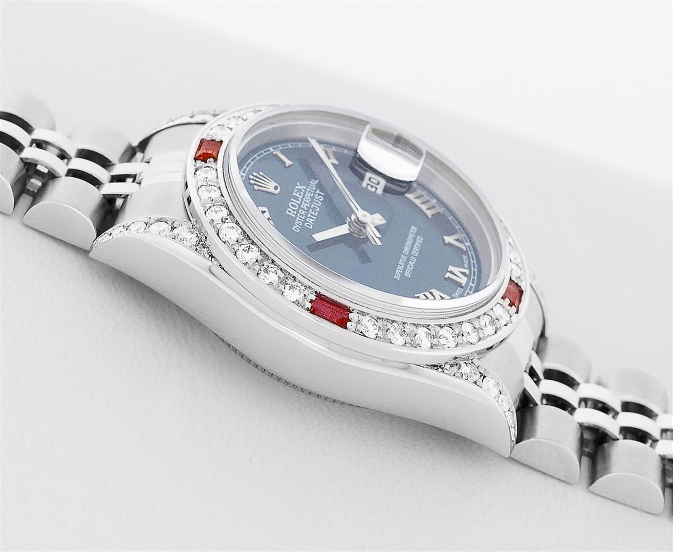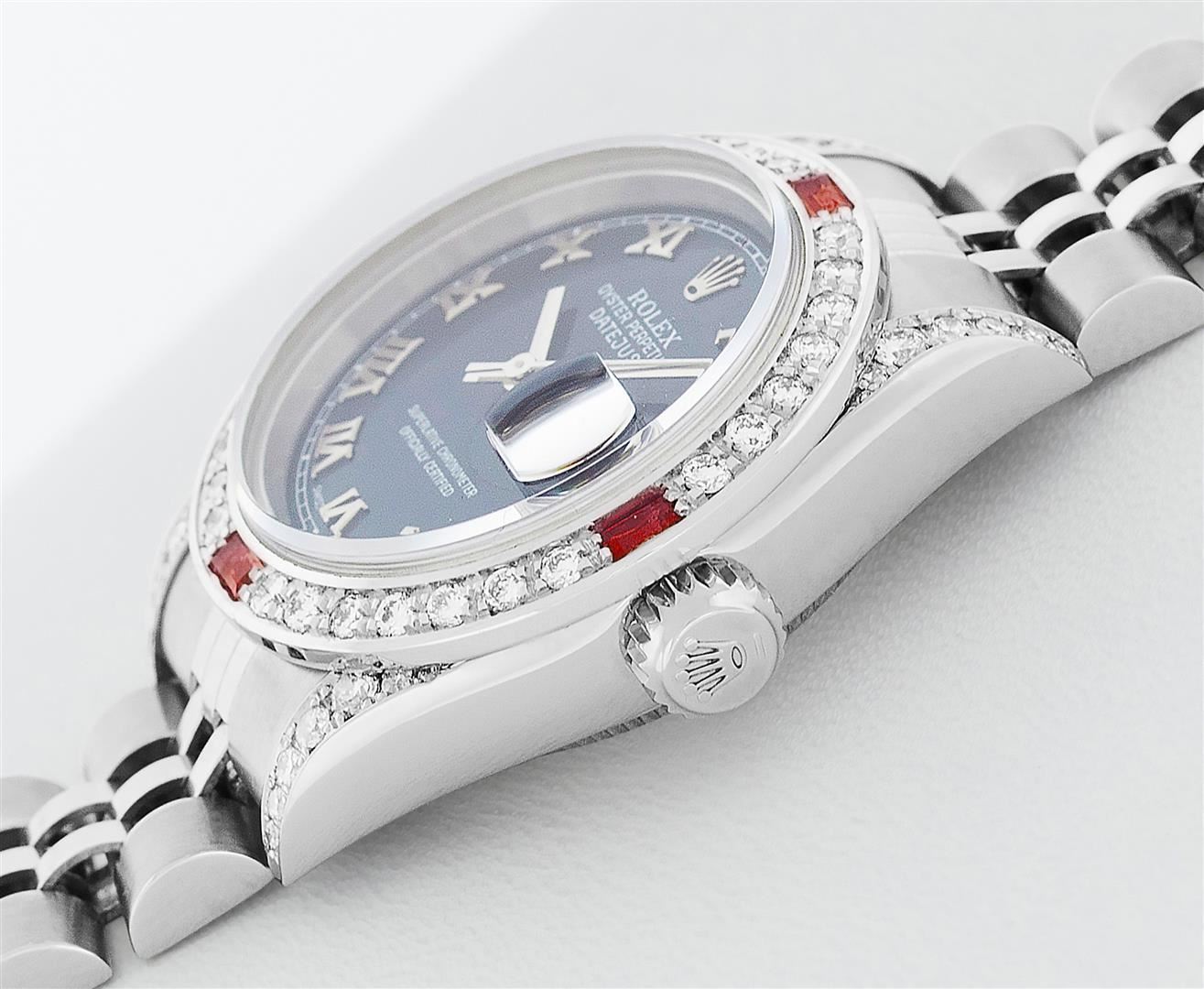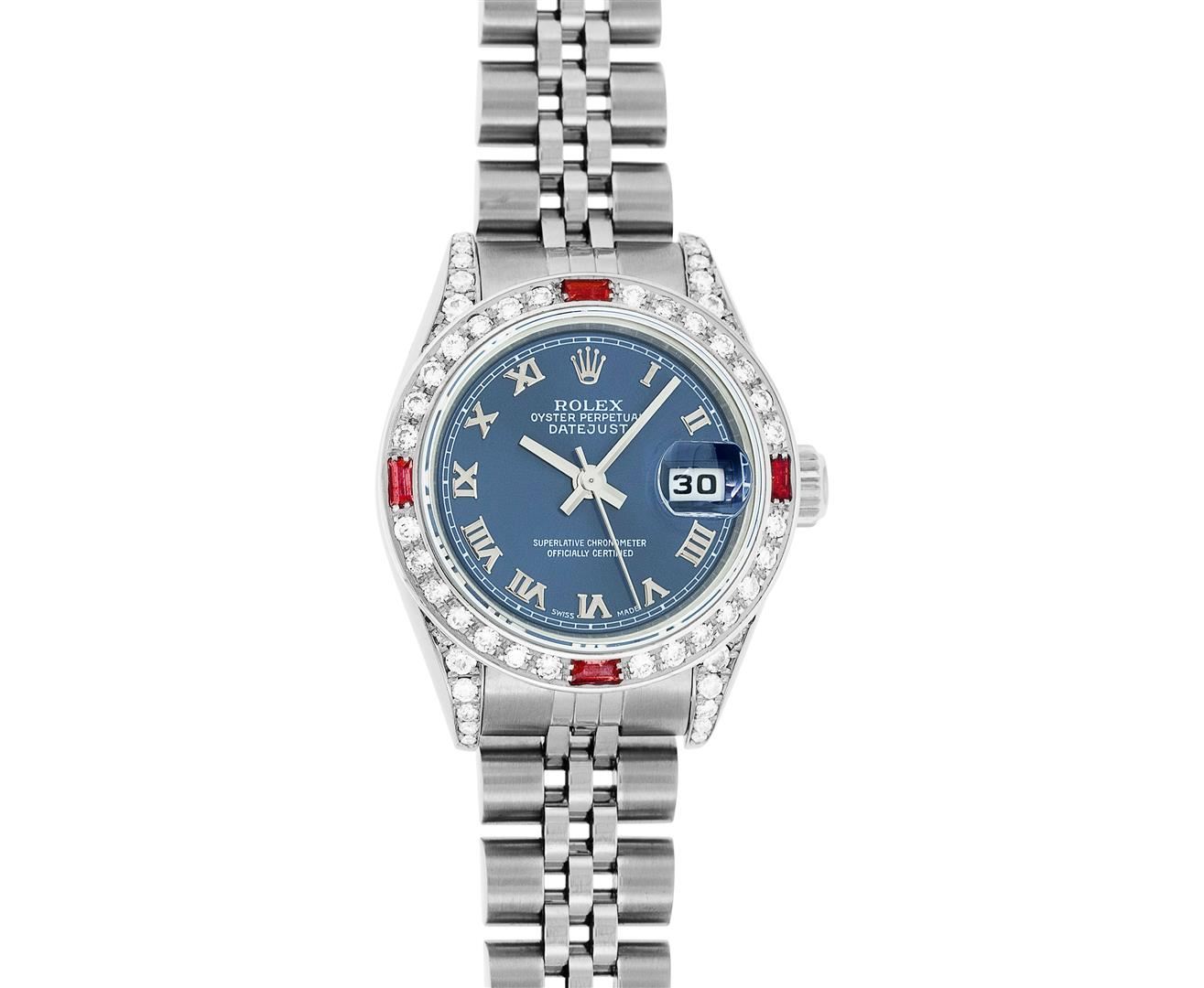 One Ladies Pre Owned Quickset Stainless Steel Rolex Datejust Polished Bright with Satin Finish, Serviced & Electronically Tested, Rolex Stainless Steel Case: 26mm, Custom Diamond Lugs: Added Diamonds On Lugs, Diamond Count: 24 Diamonds On Bezel, Color: G To H, Clartity: SI-VS. Rolex Stainless Steel Crown, Custom Bezel: New 18K White Gold Beadset And Ruby Bezel, Stone Count: 28 Diamonds + 4 Rubies, Diamond Color: G To H, Clarity: SI-VS. Custom Crystal: New Sapphire With Magnified Date Window. Custom Hands: New Hands. Rolex Movement: Quickset Automatic Winding Movement 2230. Rolex Dial: Blue Roman Dial With Square Track. Date Window: 3 O'Clock Position Date Display, Model: Sapphire Quickset Datejust. Condition: G-6 Extra Fine. Rolex Bracelet: Stainless Steel Jubilee Band. Bright Polish & Satin Finish. 6.0 Inch Length, Adjustable. Standard Clasp, With Rolex Logo. This Watch Has Been Serviced Time Tested And Is In Excellent Condition It Is Free Of All Scratches And Dents.