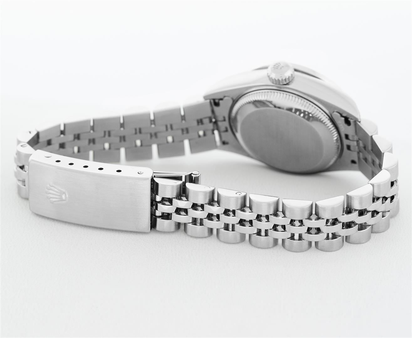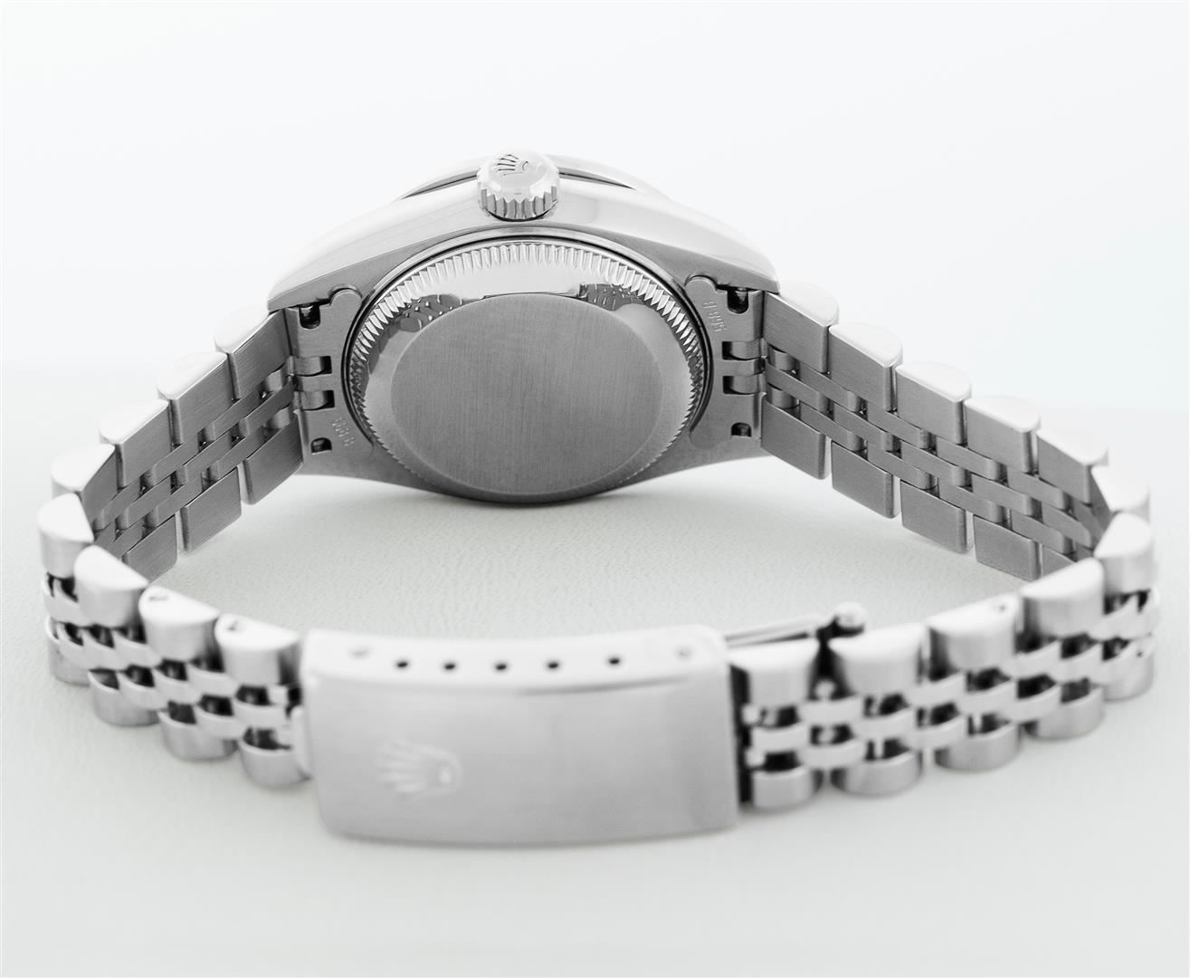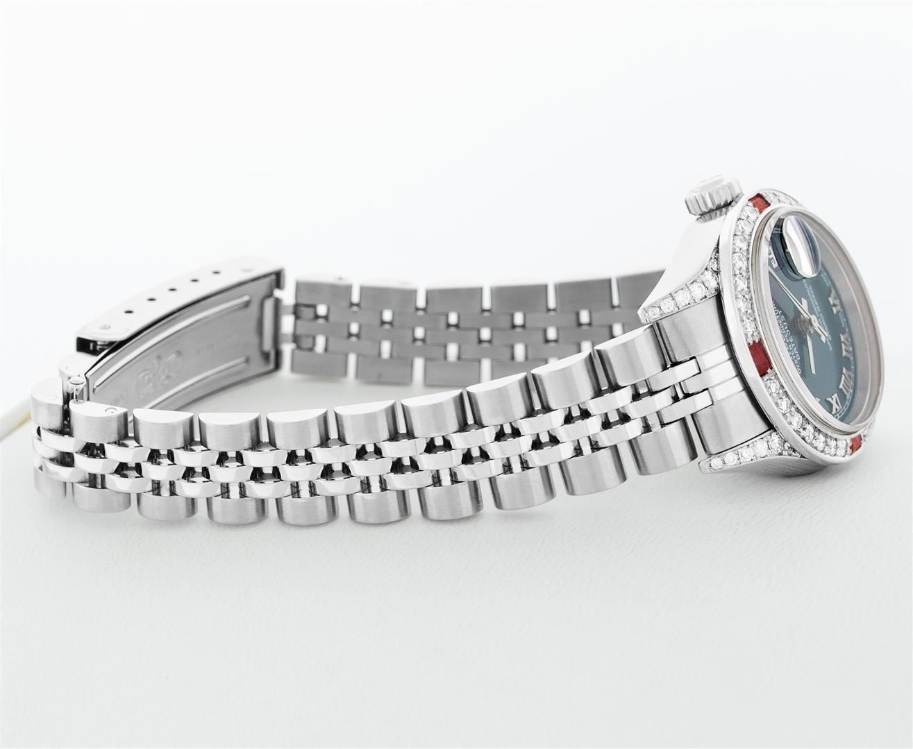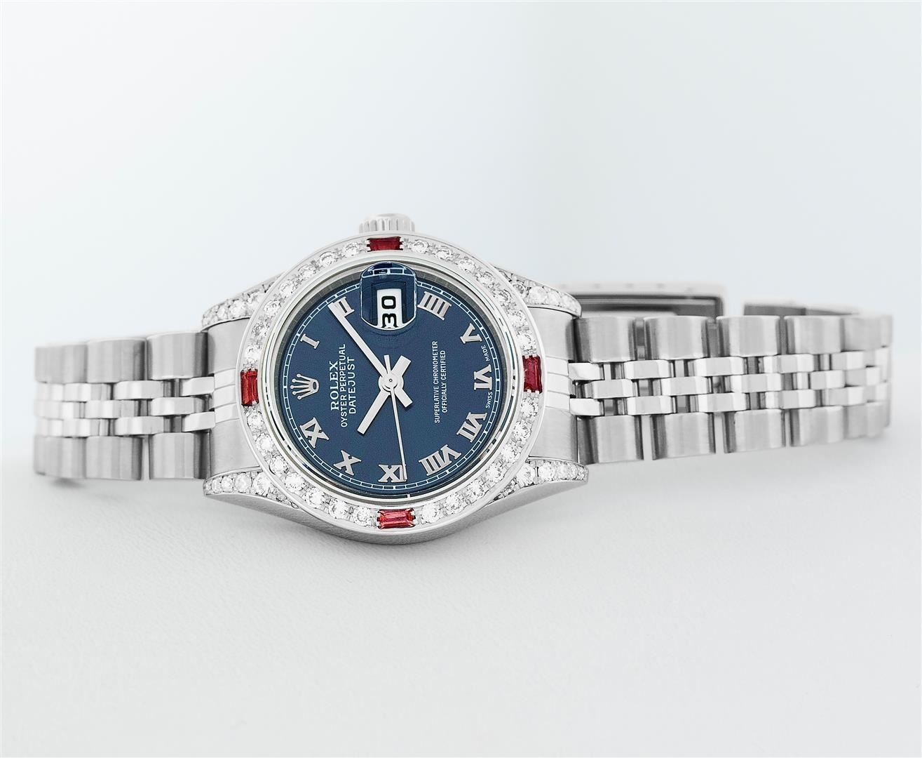 One Ladies Pre Owned Quickset Stainless Steel Rolex Datejust Polished Bright with Satin Finish, Serviced & Electronically Tested, Rolex Stainless Steel Case: 26mm, Custom Diamond Lugs: Added Diamonds On Lugs, Diamond Count: 24 Diamonds On Bezel, Color: G To H, Clartity: SI-VS. Rolex Stainless Steel Crown, Custom Bezel: New 18K White Gold Beadset And Ruby Bezel, Stone Count: 28 Diamonds + 4 Rubies, Diamond Color: G To H, Clarity: SI-VS. Custom Crystal: New Sapphire With Magnified Date Window. Custom Hands: New Hands. Rolex Movement: Quickset Automatic Winding Movement 2230. Rolex Dial: Blue Roman Dial With Square Track. Date Window: 3 O'Clock Position Date Display, Model: Sapphire Quickset Datejust. Condition: G-6 Extra Fine. Rolex Bracelet: Stainless Steel Jubilee Band. Bright Polish & Satin Finish. 6.0 Inch Length, Adjustable. Standard Clasp, With Rolex Logo. This Watch Has Been Serviced Time Tested And Is In Excellent Condition It Is Free Of All Scratches And Dents.