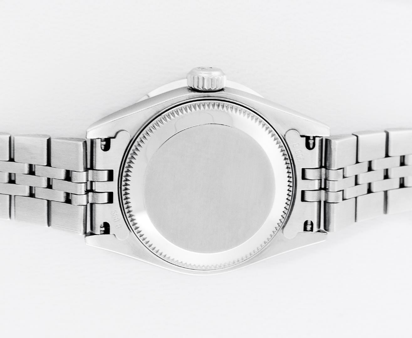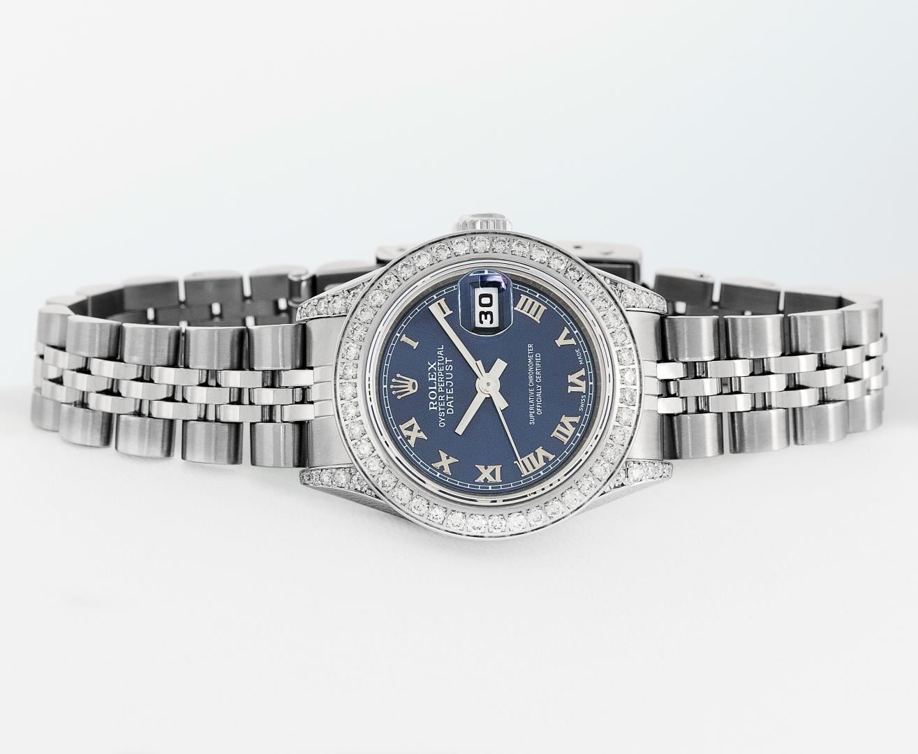 One Ladies Pre Owned Quickset Stainless Steel Rolex Datejust Polished Bright with Satin Finish, Serviced & Electronically Tested, Rolex Stainless Steel Case: 26mm, Custom Diamond Lugs: Added Diamonds On Lugs, Diamond Count: 24 Diamonds On Bezel, Color: G To H, Clartity: SI-VS. Rolex Stainless Steel Crown, Custom Bezel: New Stainless Steel Beadset Diamond Bezel, Stone Count: 40 Diamonds On Bezel, Diamond Color: G To H, Clarity: SI-VS. Custom Crystal: New Sapphire With Magnified Date Window. Custom Hands: New Hands. Rolex Movement: Quickset Automatic Winding Movement 2235. Rolex Dial: Blue Roman Dial With Square Track. Date Window: 3 O'Clock Position Date Display, Model: Sapphire Quickset Datejust. Condition: G-6 Extra Fine. Rolex Bracelet: Stainless Steel Jubilee Band. Bright Polish & Satin Finish. 6.0 Inch Length, Adjustable. Standard Clasp, With Rolex Logo. This Watch Has Been Serviced Time Tested And Is In Excellent Condition It Is Free Of All Scratches And Dents.