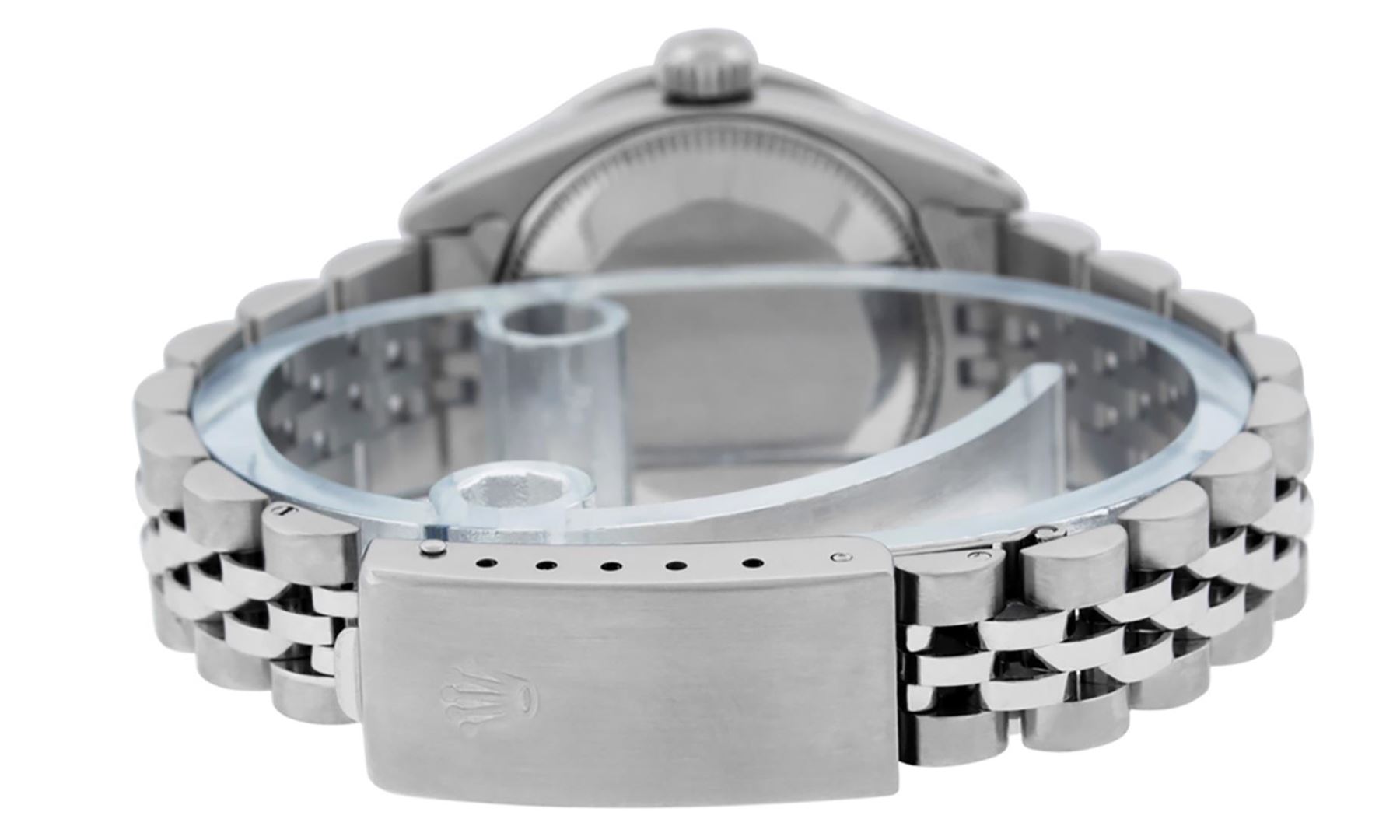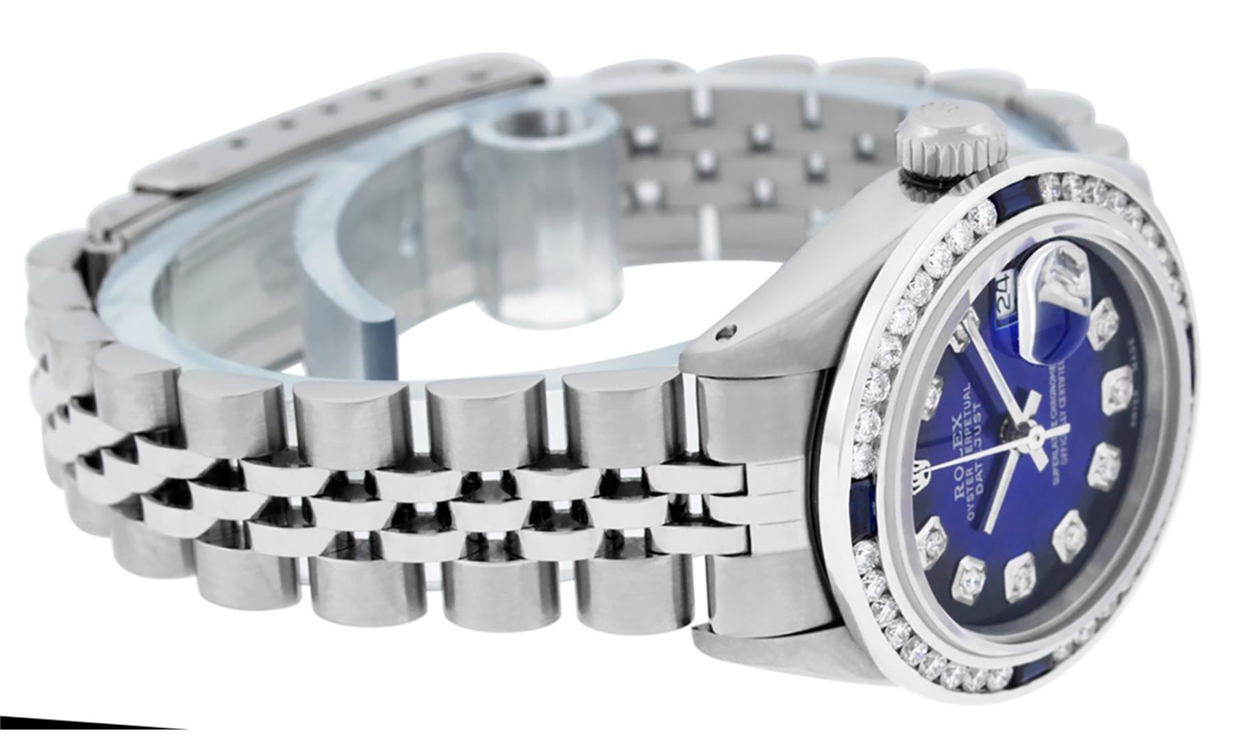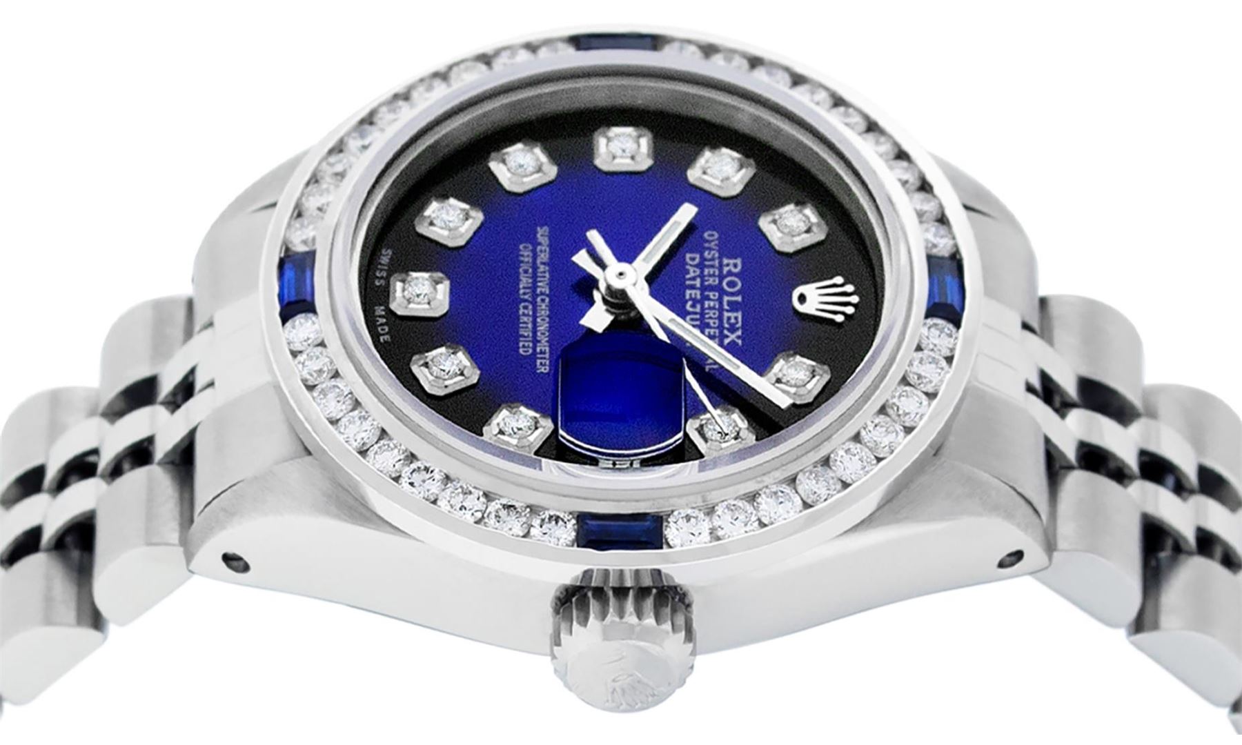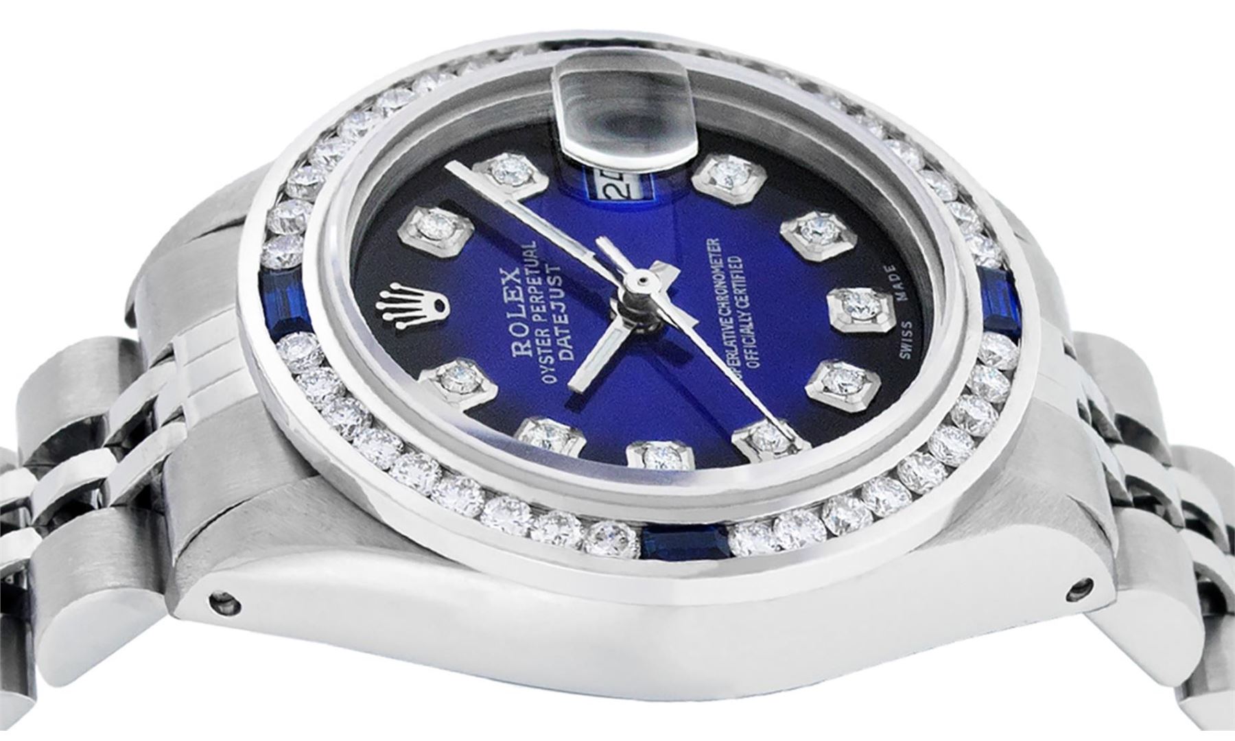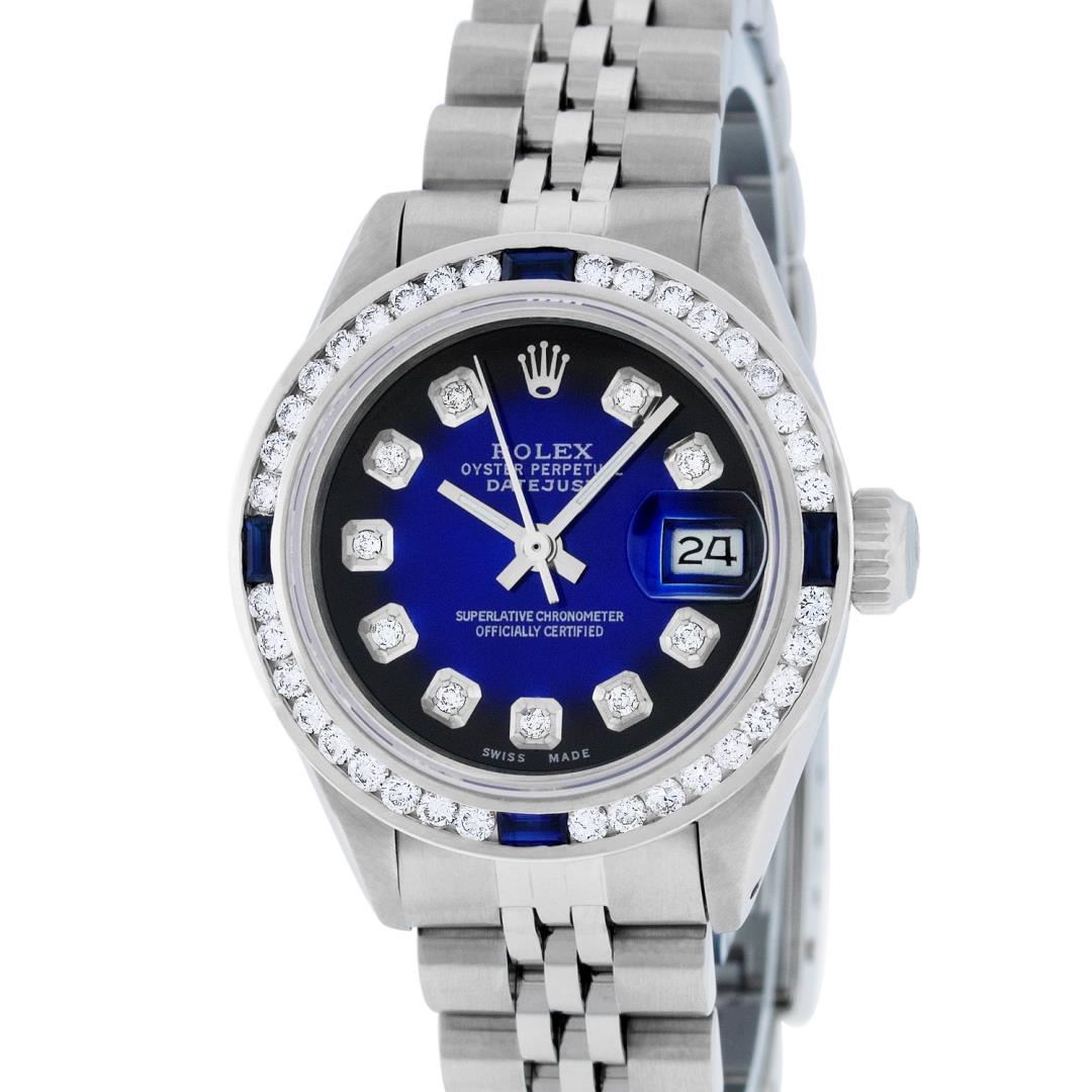 One Ladies Pre Owned Quickset Stainless Steel Rolex Datejust Polished Bright with Satin Finish, Serviced And Electronically Tested, Stainless Steel Case: 26mm, Stainless Steel Crown, Custom Bezel: New 18K White Gold Sapphire Channel Set Diamond Bezel, Diamond + Gem Count: 36 Diamonds + 4 Sapphires. Custom Crystal: New Sapphire With Date Window. Custom Hands: New Luminescent Hands. Rolex Movement: Automatic Winding Movement 2135. Custom Dial: Custom Blue Vignette With Added Diamond Hour Markers. Date Window: 3 O'Clock Position Date Display, Model: Quickset Datejust. Condition: G-6 Extra Fine. Rolex Bracelet: Stainless Steel Jubilee Band. Bright Polish & Satin Finish. 6.0 Inch Length, Adjustable. Standard Clasp, With Rolex Logo. This Watch Has Been Serviced Time Tested And Is In Excellent Condition It Is Free Of All Scratches And Dents.