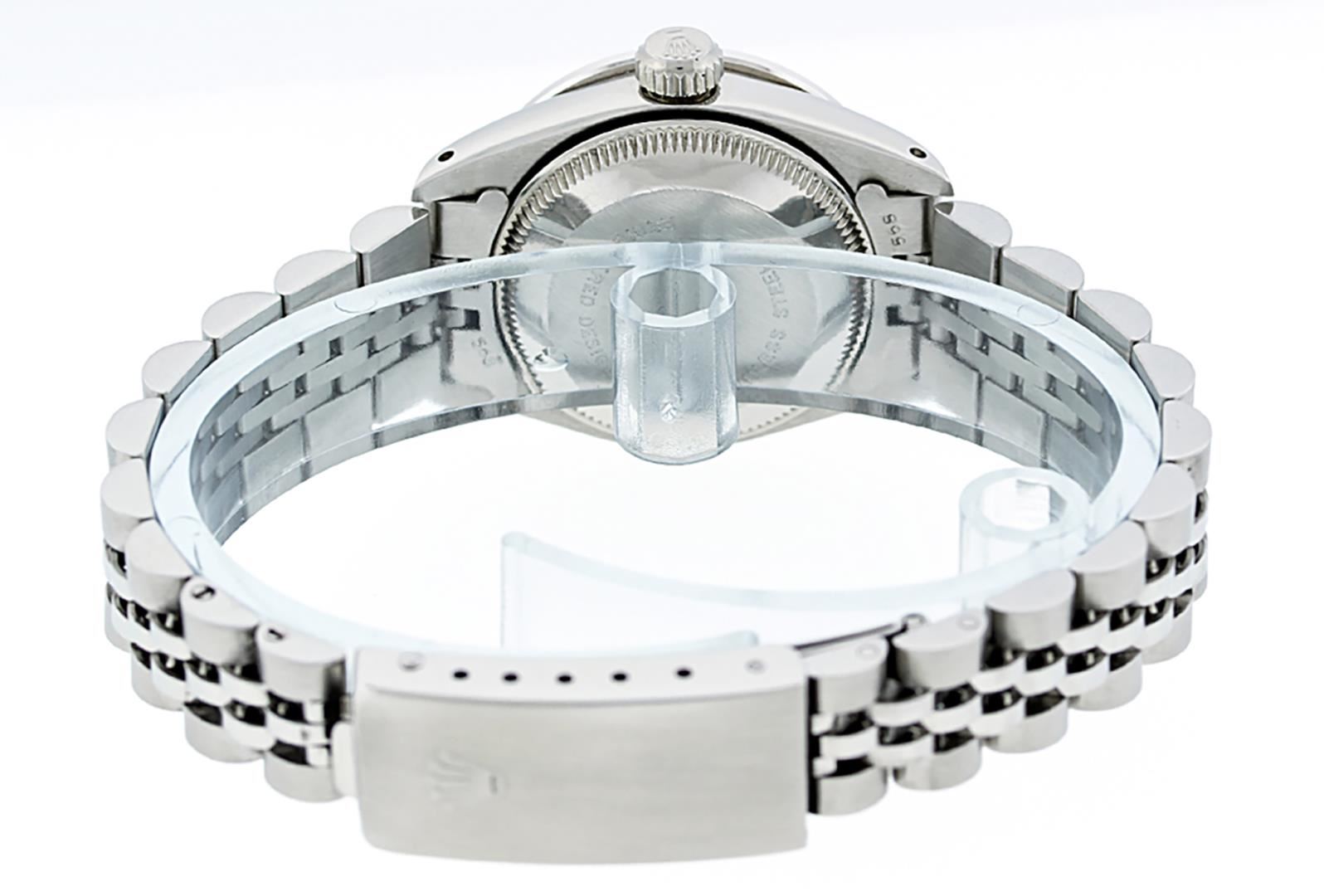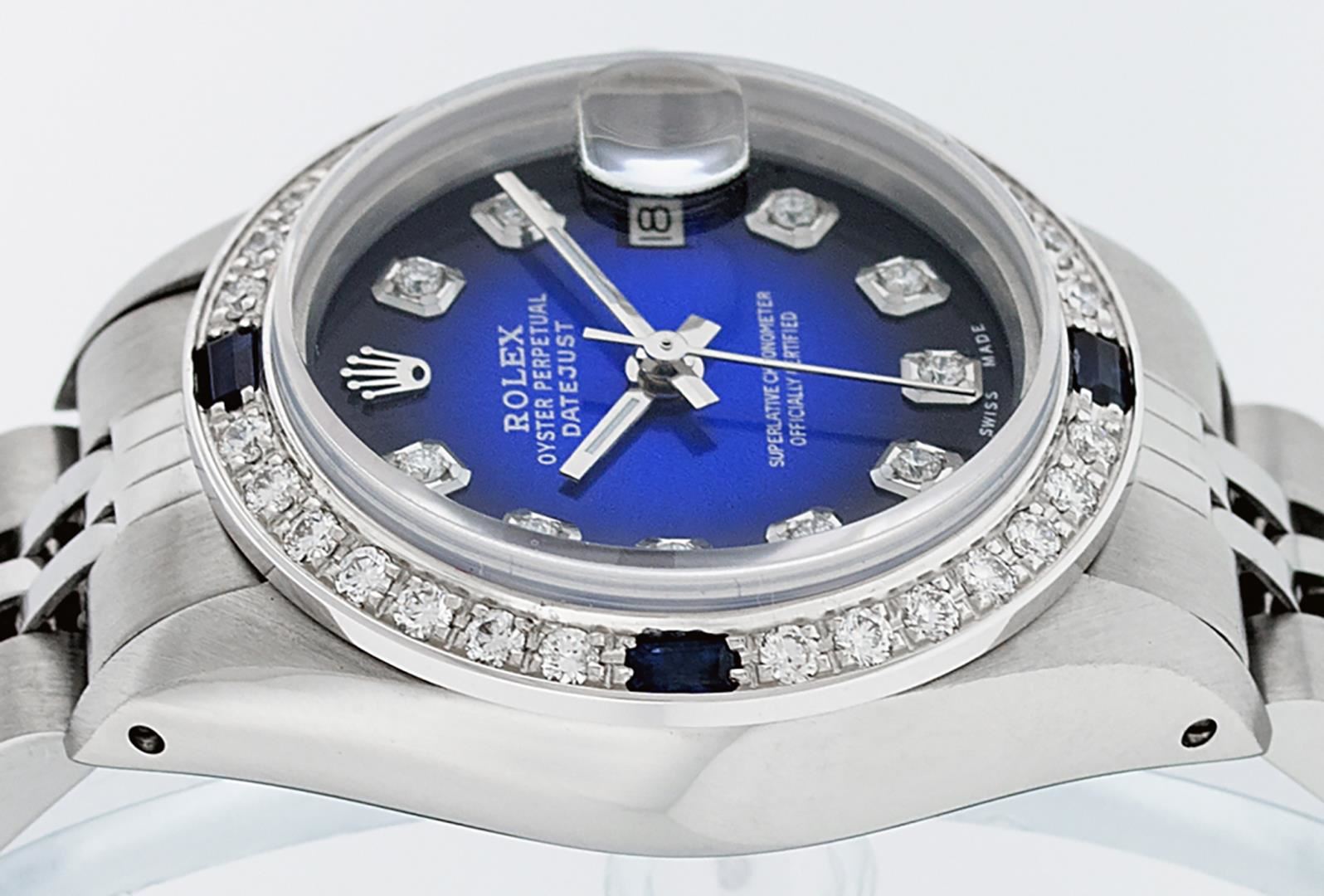 One Ladies Pre Owned Quickset Stainless Steel Rolex Datejust Polished Bright with Satin Finish, Serviced And Electronically Tested, Stainless Steel Case: 26mm, Stainless Steel Crown, Custom Bezel: New 18K White Gold Sapphire Beadset Diamond Bezel, Diamond + Gem Count: 28 Diamonds + 4 Sapphires. Custom Crystal: New Sapphire With Date Window. Custom Hands: New Luminescent Hands. Rolex Movement: Automatic Winding Movement 3035. Custom Dial: Custom Blue Vignette Dial With Added Diamond Hour Markers. Diamond Count: 10 Diamonds On Dial. Date Window: 3 O'Clock Position Date Display, Model: Datejust. Condition: G-6 Extra Fine. Rolex Bracelet: Stainless Steel Jubilee Band. Bright Polish And Satin Finish. 6.0 Inch Length, Adjustable. Standard Clasp, With Rolex Logo. This Watch Has Been Serviced Time Tested And Is In Excellent Condition It Is Free Of All Scratches And Dents.