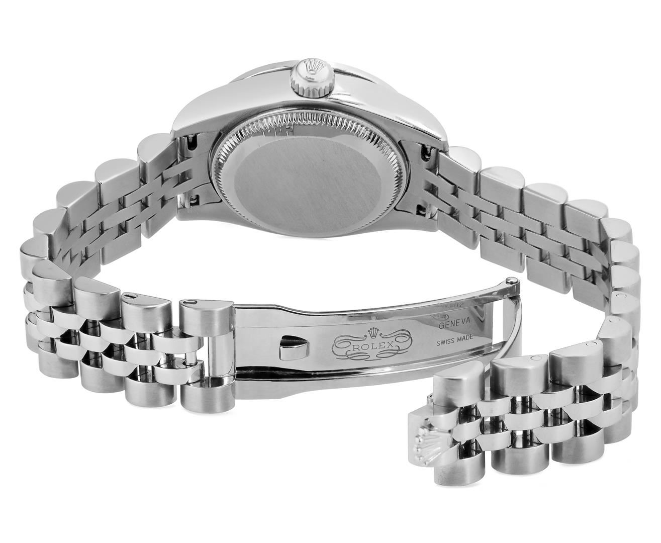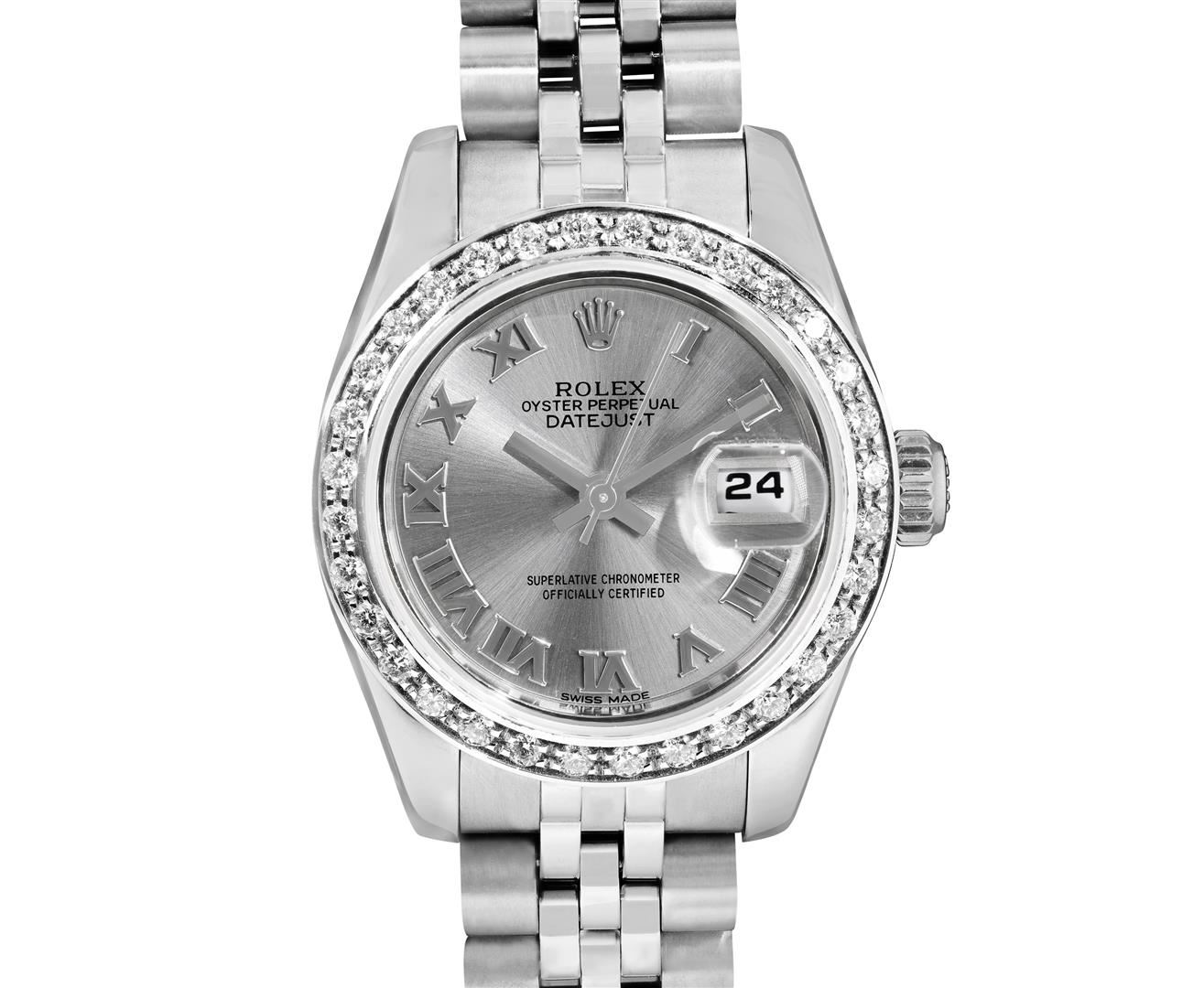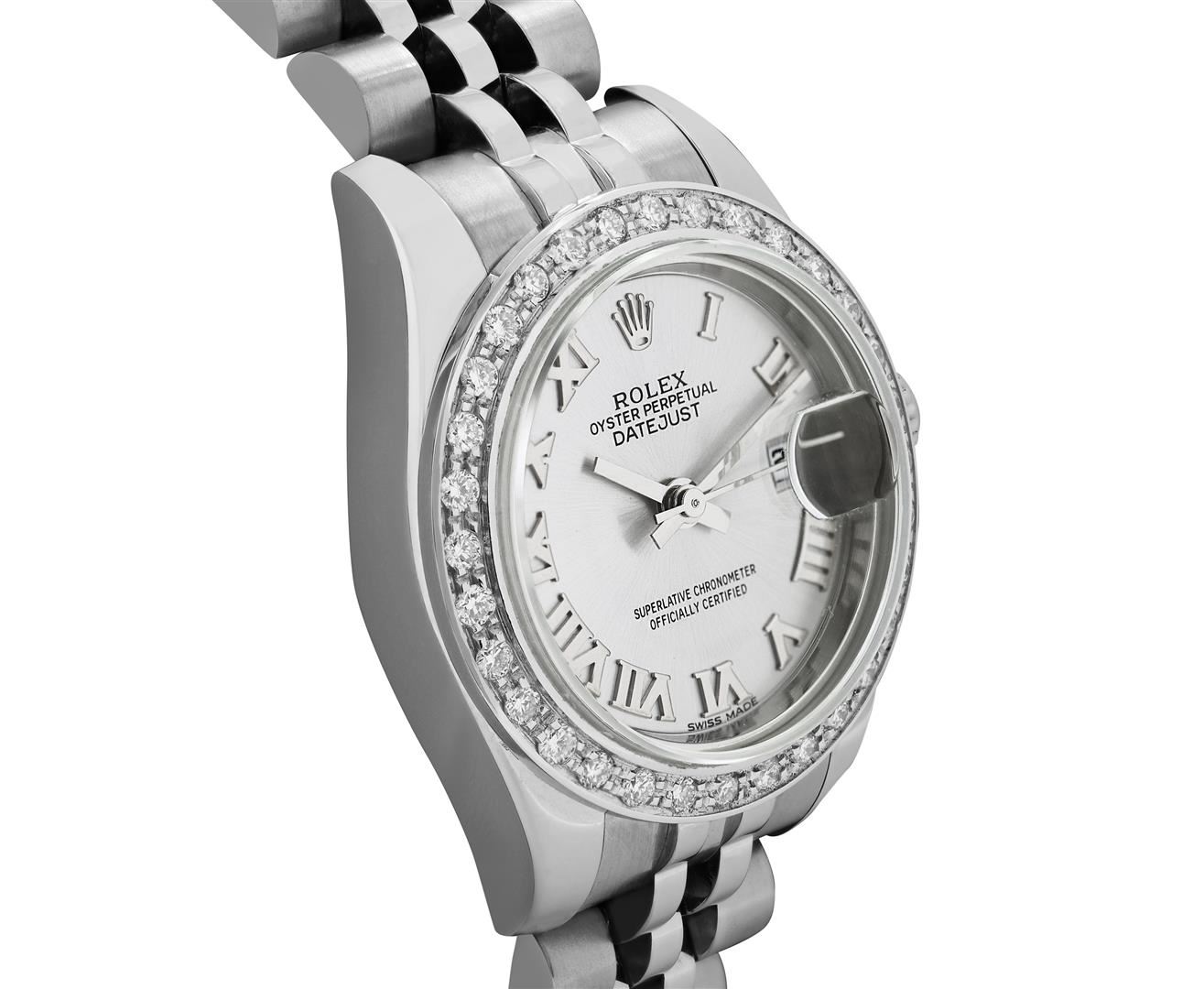 One Rolex Ladies Pre Owned Stainless Steel Datejust Wristwatch Polished Bright with Satin Finish, Serviced & Electronically Tested, Stainless Steel Case: 26mm, Stainless Steel Crown, Custom Bezel: New 18K White Gold Beadset Diamond Bezel, Diamond Count: 3