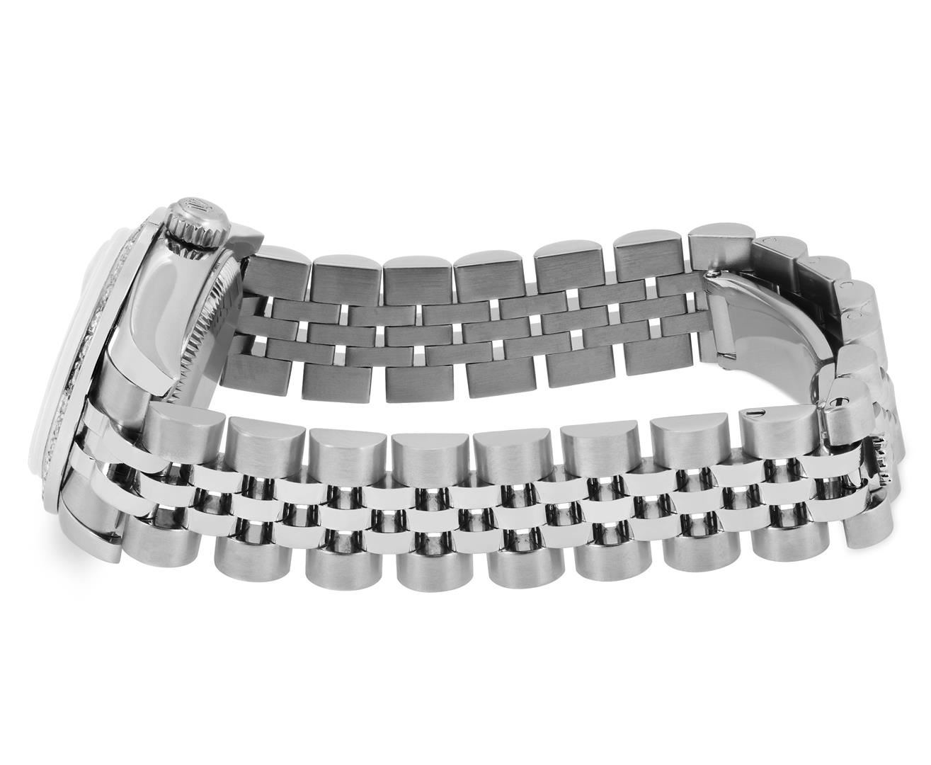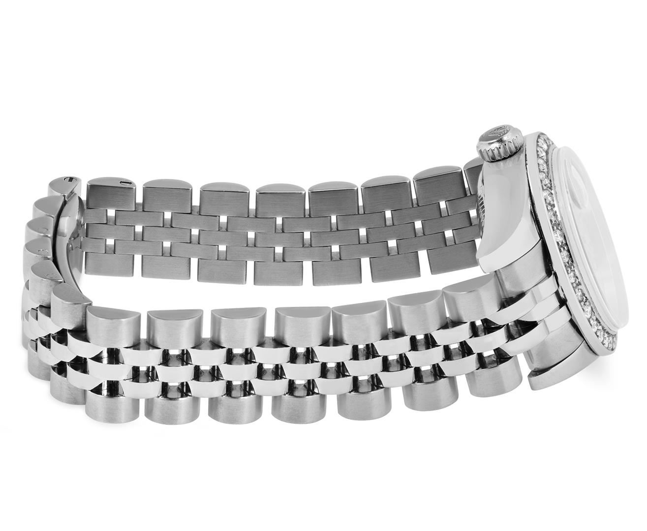 One Rolex Ladies Pre Owned Stainless Steel Datejust Wristwatch Polished Bright with Satin Finish, Serviced & Electronically Tested, Stainless Steel Case: 26mm, Stainless Steel Crown, Custom Bezel: New 18K White Gold Beadset Diamond Bezel, Diamond Count: 32 Diamonds, Total Weight .70 Carat, Clarity: SI-VS, Color: G to H. Crystal: Sapphire With Magnified Date Window. Custom Hands: Solid Hands. Rolex Movement: 2235 Automatic Winding Movement. Rolex Dial: Factory Silver Dial With Roman Hour Markers. Date Window: 3 O'Clock Position Date Display, Model: Sapphire Quickset Datejust. Condition: G-6 Extra Fine. Rolex Bracelet: Stainless Steel Jubilee Band. Bright Polish & Satin Finish. 6.0 Inch Length, Adjustable. Hidden Clasp, With Rolex Logo. This Watch Has Been Serviced And Time Tested. It Is In Excellent Condition, Free Of All Scratches And Dents. This Watch Comes With A Rolex Box.