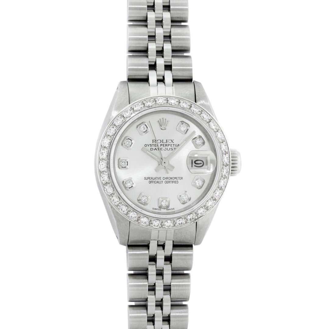 One Ladies Rolex Pre Owned Quickset Stainless Steel Rolex Datejust Wristwatch Polished Bright with Satin Finish, Serviced And Electronically Tested, Stainless Steel Case: 26mm, Stainless Steel Crown, Custom Bezel: New 18K White Gold Beadset Diamond Bezel, Diamond Count: 32 Diamonds. Custom Crystal: New Sapphire With Date Window. Custom Hands: New Luminescent Hands. Rolex Movement: Automatic Winding Movement 2135. Custom Dial: Custom Silver Dial With Added Diamond Hour Markers, Diamond Count: 10 Diamonds On Dial. Date Window: 3 O'Clock Position Date Display. Model: Quickset Datejust. Condition: G-6 Extra Fine. Rolex Bracelet: Stainless Steel Jubilee Band. Bright Polish And Satin Finish. 6.0 Inch Length, Adjustable. Standard Clasp, With Rolex Logo. This Watch Has Been Serviced Time Tested And Is In Excellent Condition It Is Free Of All Scratches And Dents.