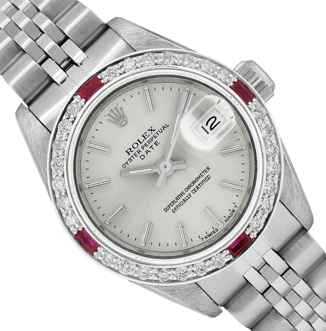 One Rolex Ladies Pre Owned Stainless Steel Date Wristwatch Polished Bright with Satin Finish, Serviced & Electronically Tested, Stainless Steel Case: 26mm, Stainless Steel Crown, Custom Bezel: New 18K White Gold Ruby Beadset Diamond Bezel, Diamond + Gem C
