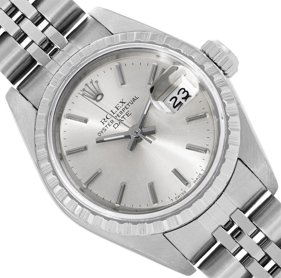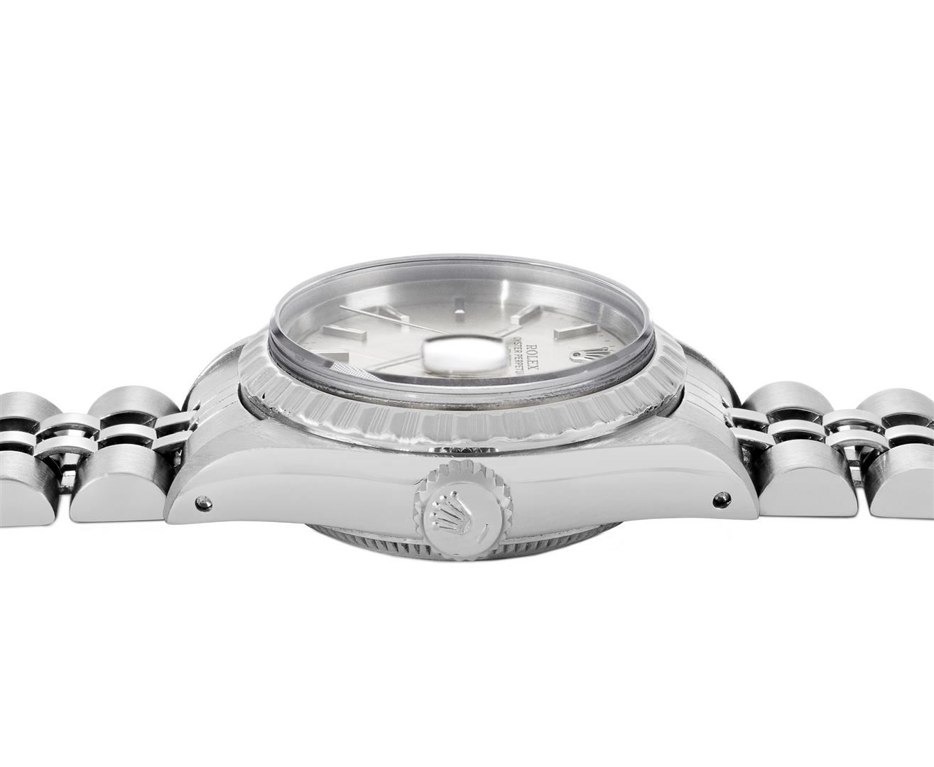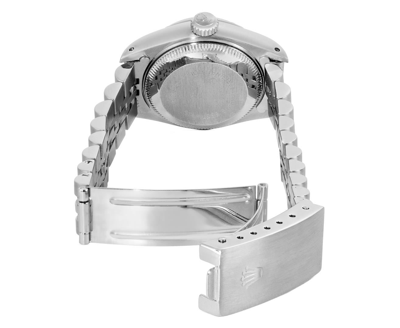 One Rolex Ladies Quickset Pre Owned Stainless Steel Date Wristwatch Polished Bright with Satin Finish, Serviced & Electronically Tested, Stainless Steel Case: 26mm, Stainless Steel Crown, Rolex Stainless Steel Engine Turn bezel. Crystal: Sapphire With Magnified Date Window. Hands: Luminescent Hands. Rolex Movement: 2135 Automatic Winding Movement. Rolex Dial: Factory Silver Dial With Index Hour Markers And Lumi Dots. Date Window: 3 O'Clock Position Date Display, Model: Datejust. Condition: G-6 Extra Fine. Rolex Bracelet: Stainless Steel Jubilee Band. Bright Polish & Satin Finish. 6.0 Inch Length, Adjustable. Standard Clasp, With Rolex Logo. This Watch Has Been Serviced And Time Tested. It Is In Excellent Condition, Free Of All Scratches And Dents. This Watch Comes With A Rolex Box.