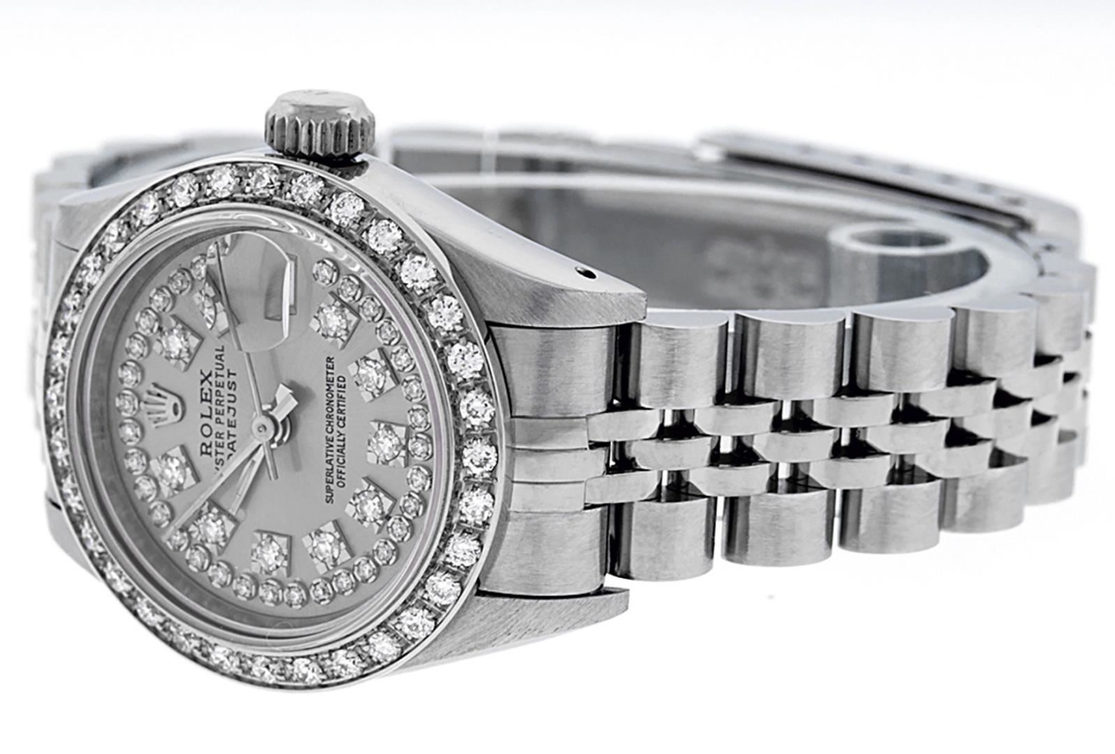 One Ladies Pre Owned Quickset Stainless Steel Rolex Datejust, Polished Bright with Satin Finish, Serviced And Electronically Tested, Stainless Steel Case: 26mm, Stainless Steel Crown. Custom Diamond Lugs: 24 Diamonds Added On Lugs. Custom Bezel: New 18K White Gold Beadset Diamond Bezel, Diamond Count: 32 Diamonds. Custom Crystal: New Sapphire With Magnified Date Window. Custom Hands: New Luminescent Hands. Rolex Movement: Automatic Winding Movement 2135. Custom Dial: Custom Slate Grey String Diamond Dial, Stone Count: 43 Diamonds On Dial. Date Window: 3 O'Clock Position Date Display, Model: Quickset Datejust. Condition: G-6 Extra Fine. Rolex Bracelet: Stainless Steel Jubilee Band. Bright Polish And Satin Finish. 6.0 Inch Length, Adjustable. Standard Clasp, With Rolex Logo. This Watch Has Been Serviced Time Tested And Is In Excellent Condition It Is Free Of All Scratches And Dents.