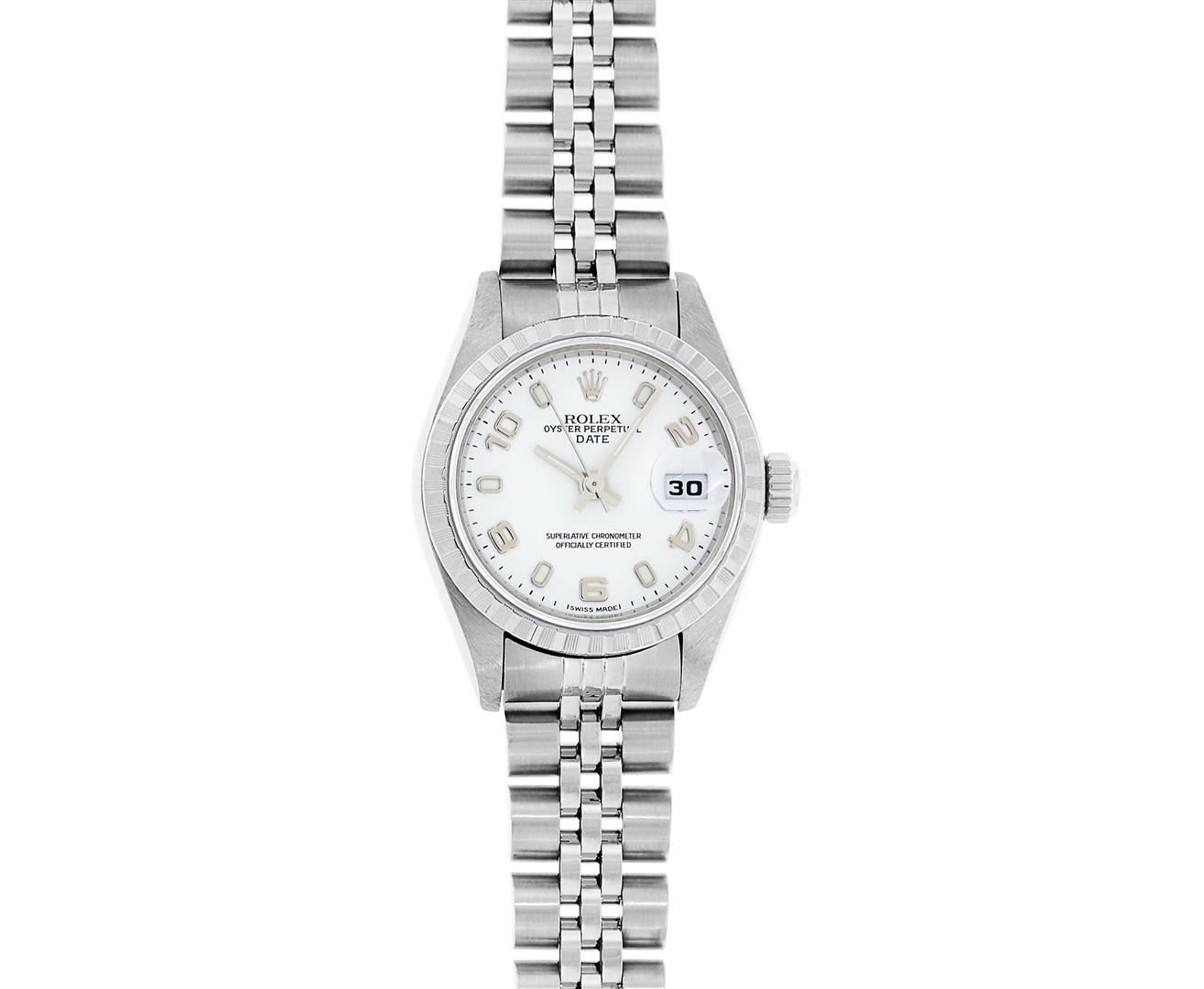 One Ladies Pre Owned Quickset Stainless Steel Rolex Date Polished Bright with Satin Finish, Serviced & Electronically Tested, Rolex Stainless Steel Case: 26mm. Rolex Stainless Steel Crown, Rolex Bezel: Stainless Steel Engine Turn Bezel. Crystal: Sapphire With Magnified Date Window. Hands: Lumi Hands. Rolex Movement: Quickset Automatic Winding Movement 2235. Rolex Dial: White Arabic With Dash Track. Date Window: 3 O'Clock Position Date Display, Model: Sapphire Quickset Datejust. Condition: G-6 Extra Fine. Rolex Bracelet: Stainless Steel Jubilee Band. Bright Polish & Satin Finish. 6.0 Inch Length, Adjustable. Standard Clasp, With Rolex Logo. This Watch Has Been Serviced Time Tested And Is In Excellent Condition It Is Free Of All Scratches And Dents.