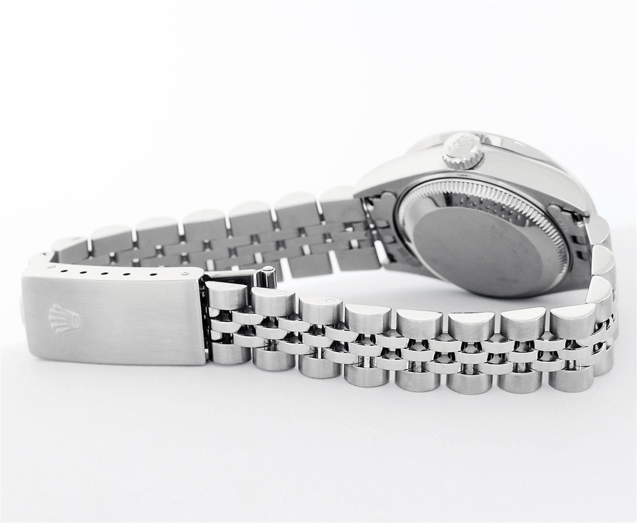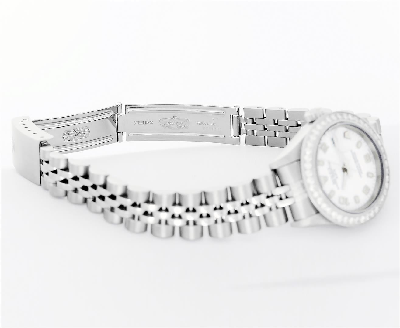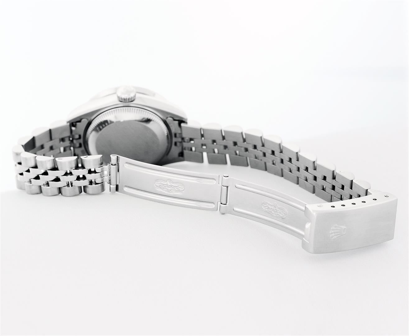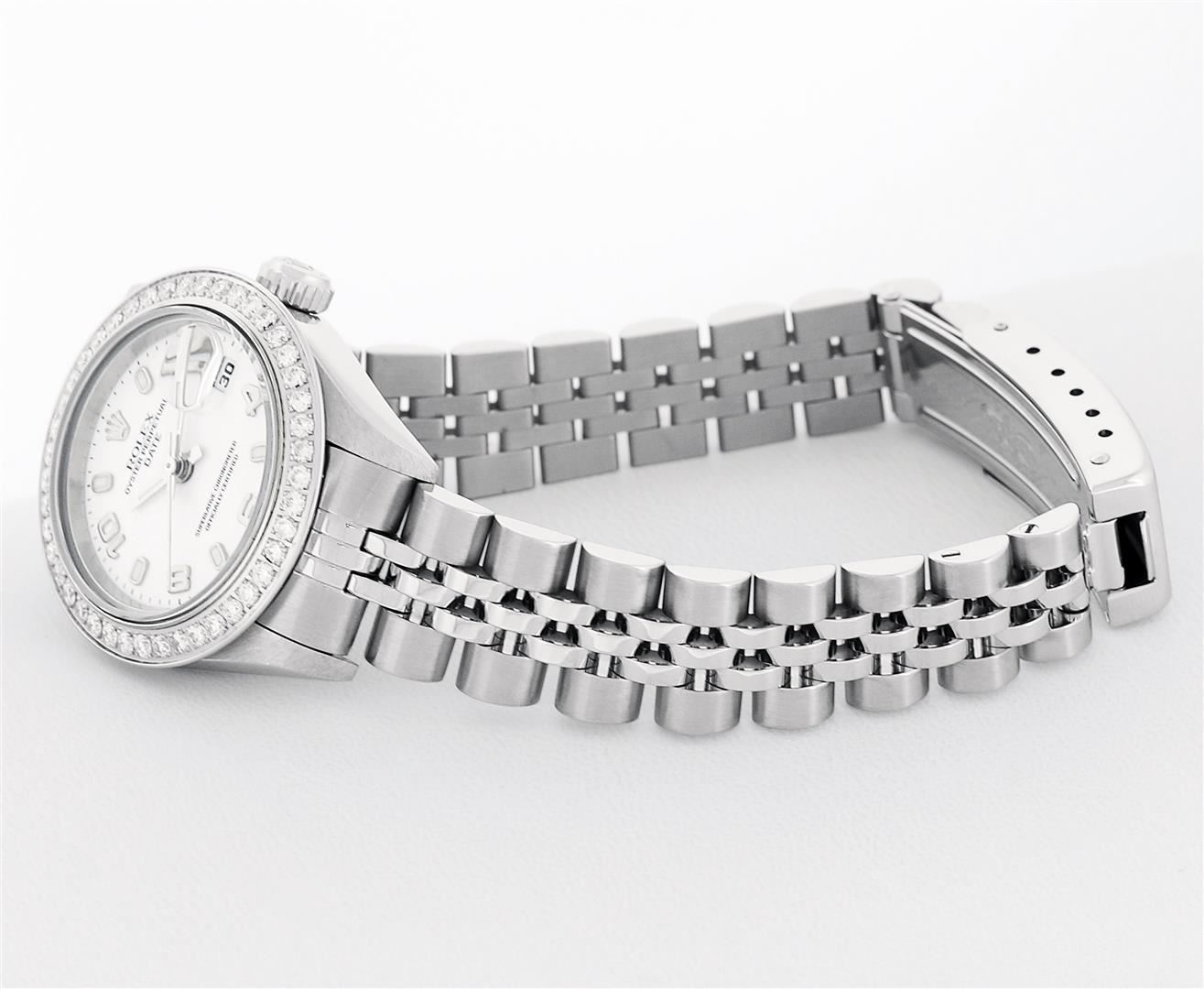 One Ladies Pre Owned Quickset Stainless Steel Rolex Date Polished Bright with Satin Finish, Serviced & Electronically Tested, Rolex Stainless Steel Case: 26mm. Rolex Stainless Steel Crown, Custom Bezel: New Stainless Steel Beadset Diamond Bezel, Stone Count: 32 Diamonds On Bezel, Diamond Color: G To H, Clarity: SI-VS. Custom Crystal: New Sapphire With Magnified Date Window. Custom Hands: New Lumi Hands. Rolex Movement: Quickset Automatic Winding Movement 2235. Rolex Dial: White Arabic With Dash Track. Date Window: 3 O'Clock Position Date Display, Model: Sapphire Quickset Datejust. Condition: G-6 Extra Fine. Rolex Bracelet: Stainless Steel Jubilee Band. Bright Polish & Satin Finish. 6.0 Inch Length, Adjustable. Standard Clasp, With Rolex Logo. This Watch Has Been Serviced Time Tested And Is In Excellent Condition It Is Free Of All Scratches And Dents.