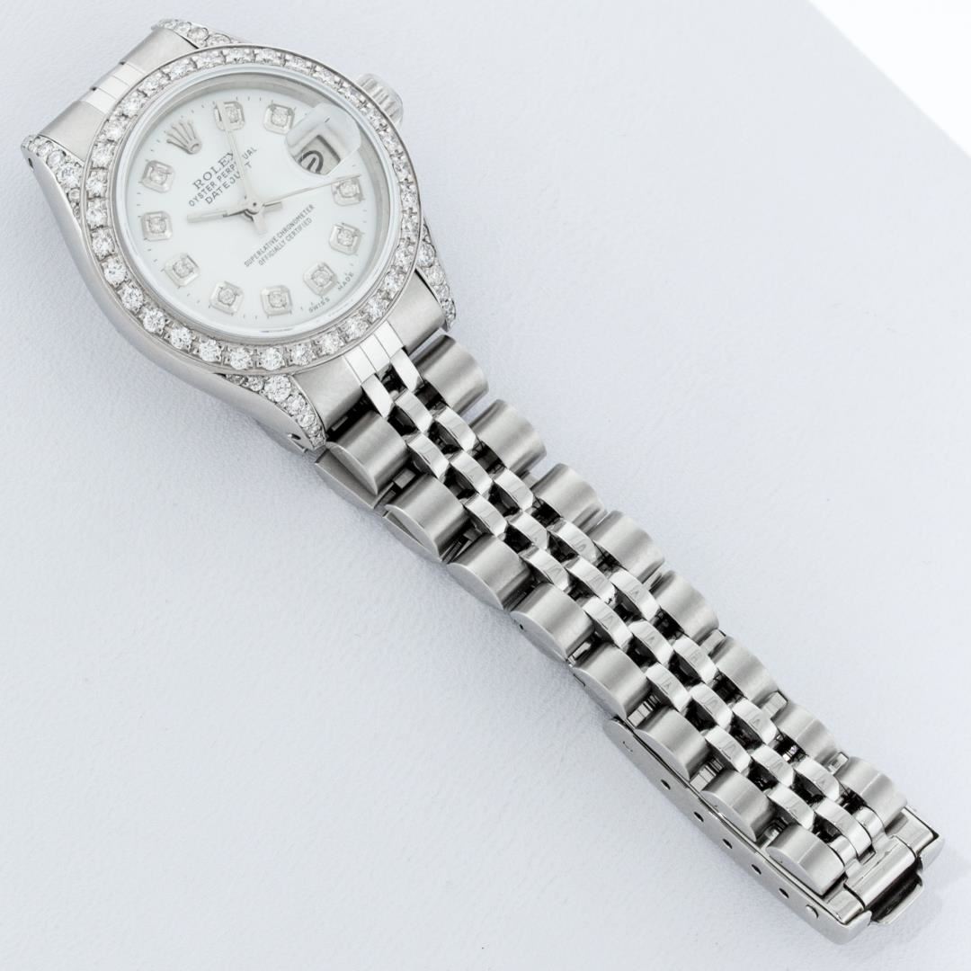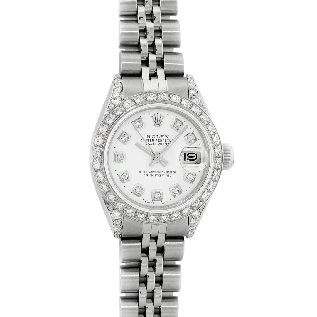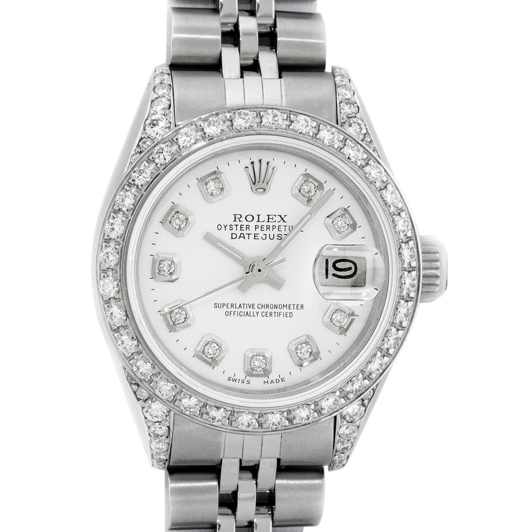 One Ladies Pre Owned Quickset Stainless Steel Rolex Datejust Polished Bright with Satin Finish, Serviced And Electronically Tested, Stainless Steel Case: 26mm, Stainless Steel Crown, Custom Diamond Lugs: 24 Diamonds Added On Lugs. Custom Bezel: New 18K White Gold Diamond Beadset Bezel, Diamond Count: 32 Diamonds. Custom Crystal: New Sapphire With Date Window. Custom Hands: New Luminescent Hands. Rolex Movement: Automatic Winding Movement 2135. Custom Dial: Custom White Dial With Added Diamonds, 10 Diamonds On Dial. Date Window: 3 O'Clock Position Date Display, Model: Quickset Datejust. Condition: G-6 Extra Fine. Rolex Bracelet: Stainless Steel Jubilee Band. Bright Polish And Satin Finish. 6.0 Inch Length, Adjustable. Standard Clasp, With Rolex Logo. This Watch Has Been Serviced Time Tested And Is In Excellent Condition It Is Free Of All Scratches And Dents.