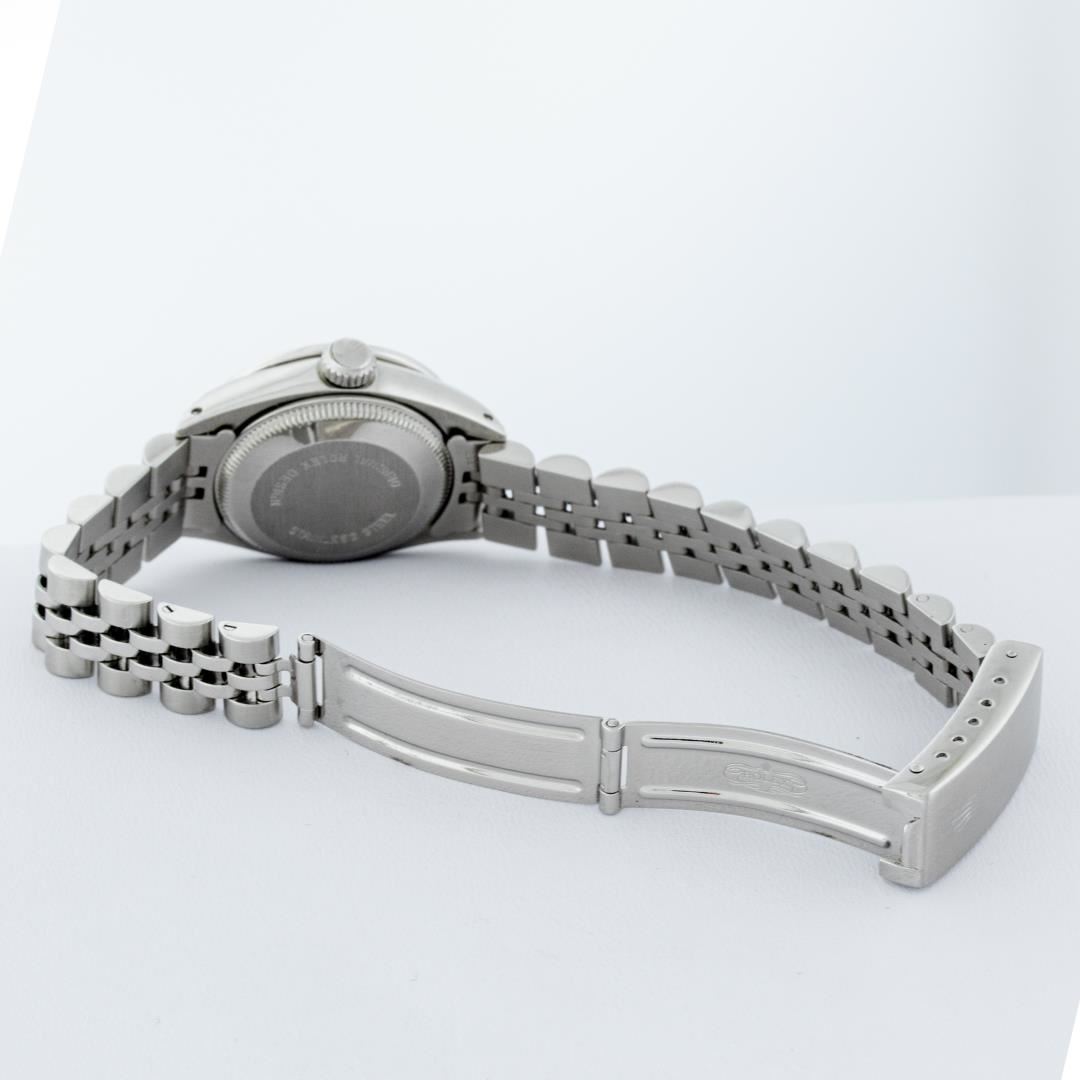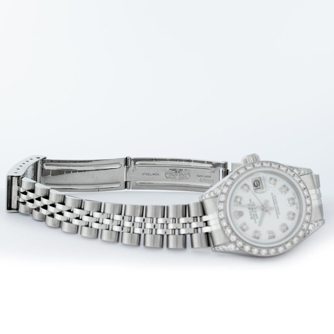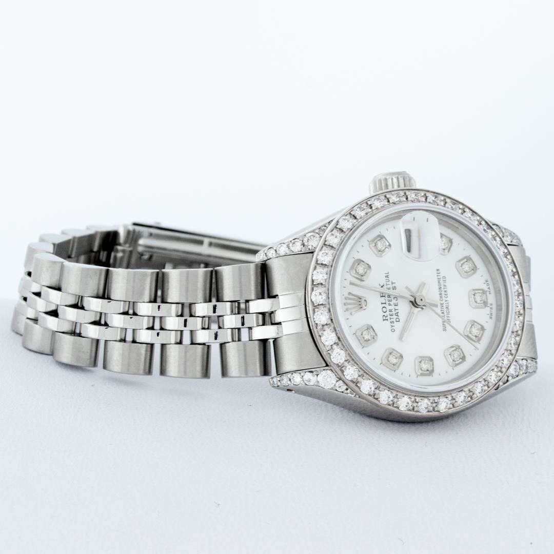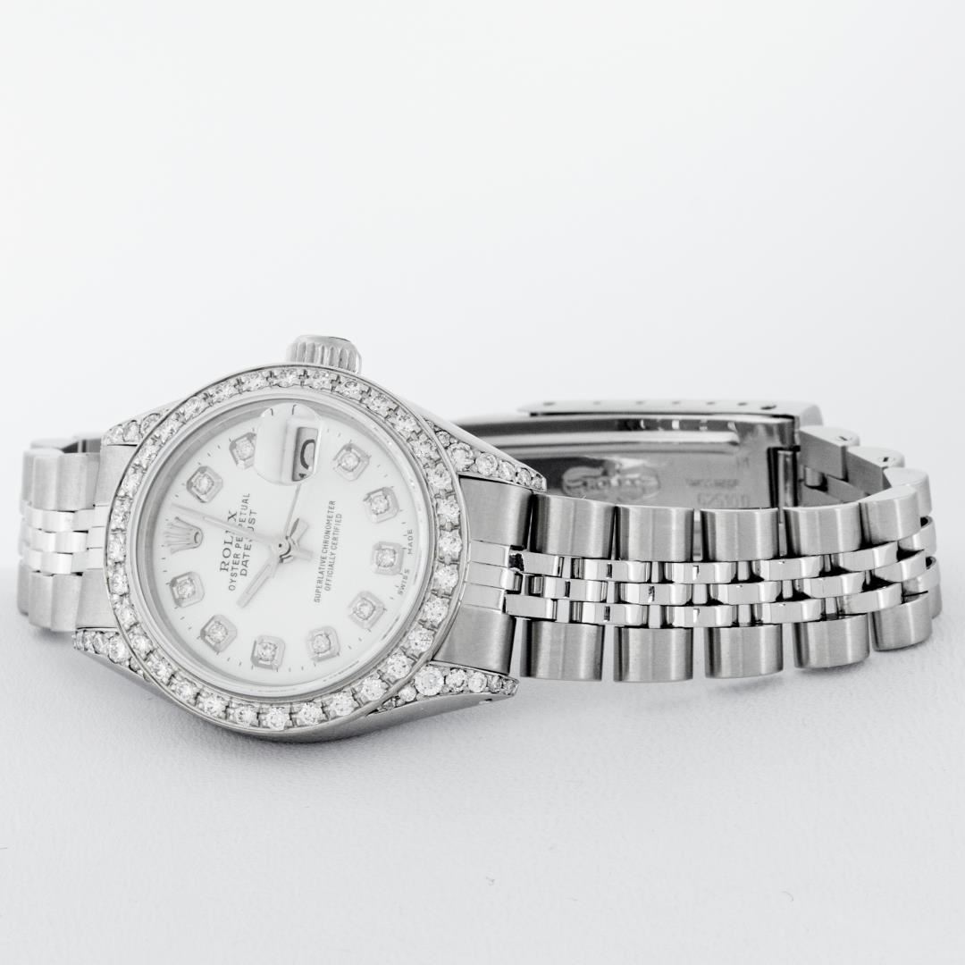 One Ladies Pre Owned Quickset Stainless Steel Rolex Datejust Polished Bright with Satin Finish, Serviced And Electronically Tested, Stainless Steel Case: 26mm, Stainless Steel Crown, Custom Diamond Lugs: 24 Diamonds Added On Lugs. Custom Bezel: New 18K White Gold Diamond Beadset Bezel, Diamond Count: 32 Diamonds. Custom Crystal: New Sapphire With Date Window. Custom Hands: New Luminescent Hands. Rolex Movement: Automatic Winding Movement 2135. Custom Dial: Custom White Dial With Added Diamonds, 10 Diamonds On Dial. Date Window: 3 O'Clock Position Date Display, Model: Quickset Datejust. Condition: G-6 Extra Fine. Rolex Bracelet: Stainless Steel Jubilee Band. Bright Polish And Satin Finish. 6.0 Inch Length, Adjustable. Standard Clasp, With Rolex Logo. This Watch Has Been Serviced Time Tested And Is In Excellent Condition It Is Free Of All Scratches And Dents.