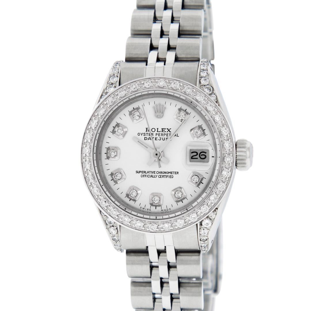 One Ladies Pre Owned Quickset Stainless Steel Rolex Datejust Polished Bright with Satin Finish, Serviced And Electronically Tested, Stainless Steel Case: 26mm, Stainless Steel Crown, Custom Diamond Lugs: 24 Diamonds Added On Lugs. Custom Bezel: New 18K White Gold Diamond Beadset Bezel, Diamond Count: 32 Diamonds. Custom Crystal: New Sapphire With Date Window. Custom Hands: New Luminescent Hands. Rolex Movement: Automatic Winding Movement 2135. Custom Dial: Custom White Dial With Added Diamonds, 10 Diamonds On Dial. Date Window: 3 O'Clock Position Date Display, Model: Quickset Datejust. Condition: G-6 Extra Fine. Rolex Bracelet: Stainless Steel Jubilee Band. Bright Polish And Satin Finish. 6.0 Inch Length, Adjustable. Standard Clasp, With Rolex Logo. This Watch Has Been Serviced Time Tested And Is In Excellent Condition It Is Free Of All Scratches And Dents.