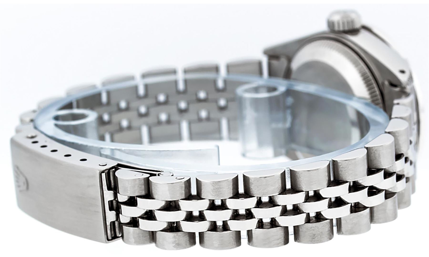 One Ladies Pre Owned Quickset Stainless Steel Rolex Datejust Polished Bright with Satin Finish, Serviced And Electronically Tested, Stainless Steel Case: 26mm, Stainless Steel Crown, Custom Diamond Lugs: 24 Diamonds Added On Lugs. Custom Bezel: New 18K White Gold Diamond Beadset Bezel, Diamond Count: 32 Diamonds. Custom Crystal: New Sapphire With Date Window. Custom Hands: New Luminescent Hands. Rolex Movement: Automatic Winding Movement 2135. Custom Dial: Custom White Dial With Added Diamonds, 10 Diamonds On Dial. Date Window: 3 O'Clock Position Date Display, Model: Quickset Datejust. Condition: G-6 Extra Fine. Rolex Bracelet: Stainless Steel Jubilee Band. Bright Polish And Satin Finish. 6.0 Inch Length, Adjustable. Standard Clasp, With Rolex Logo. This Watch Has Been Serviced Time Tested And Is In Excellent Condition It Is Free Of All Scratches And Dents.