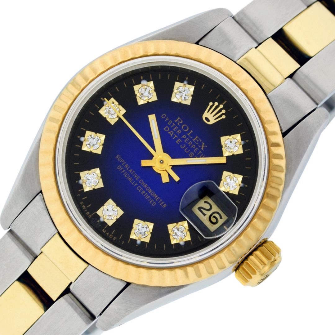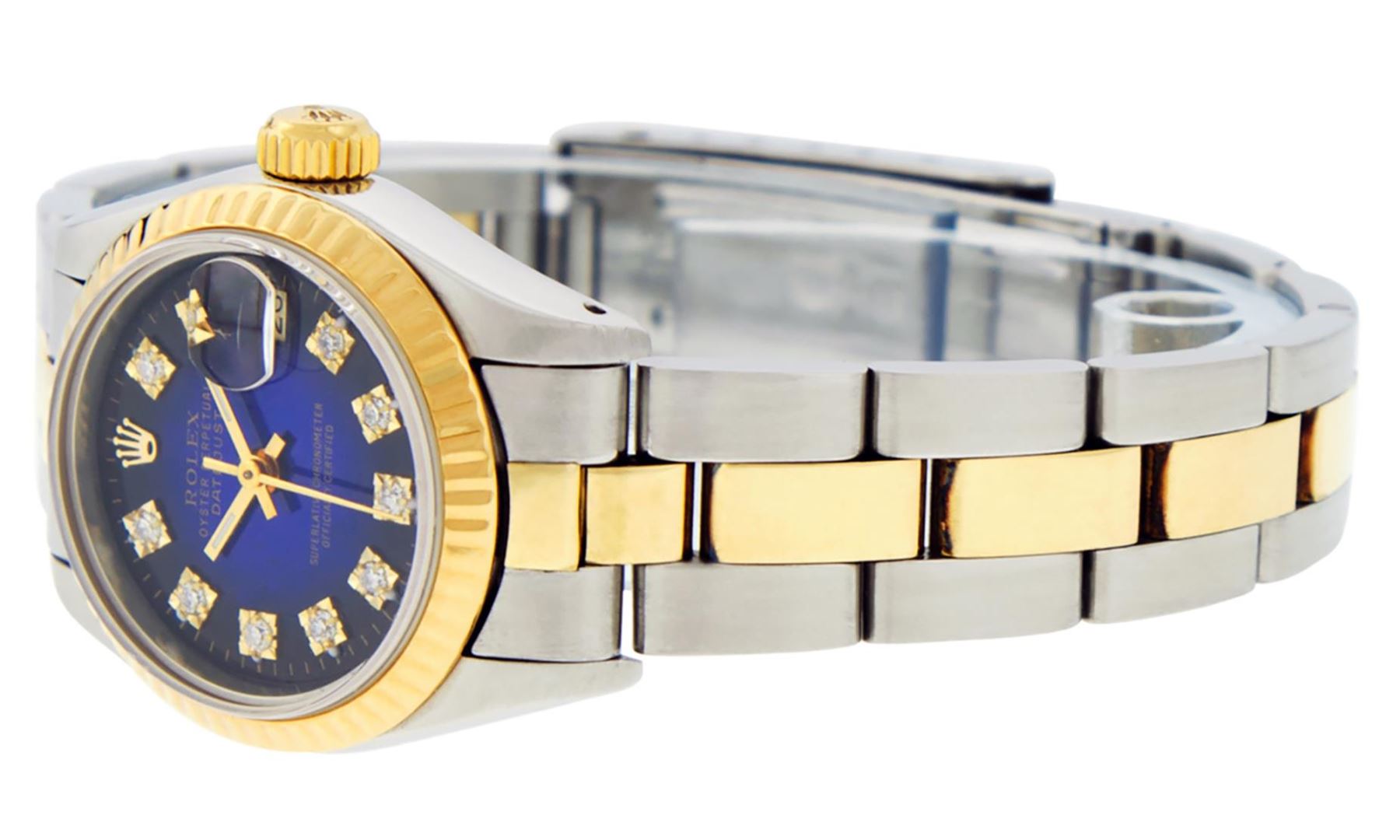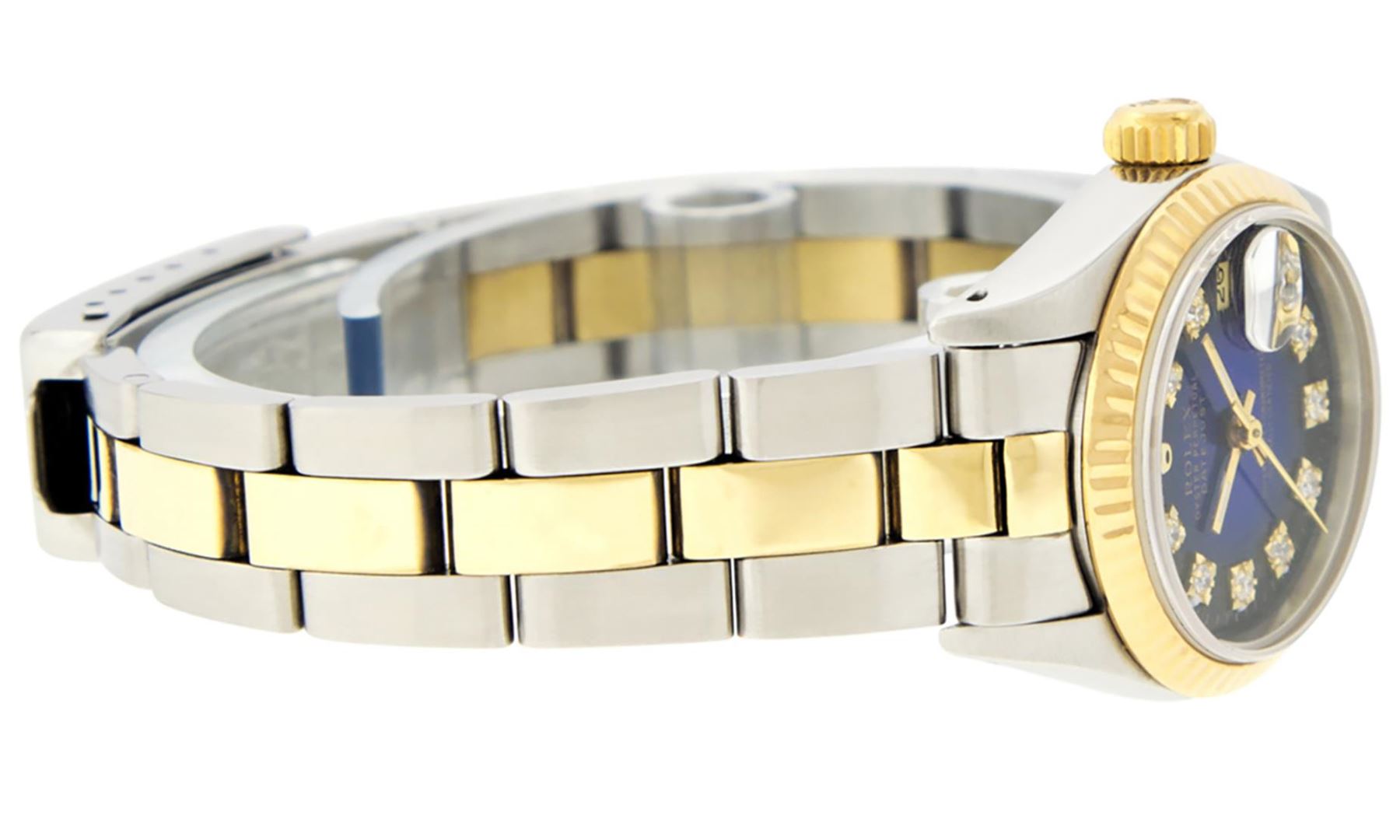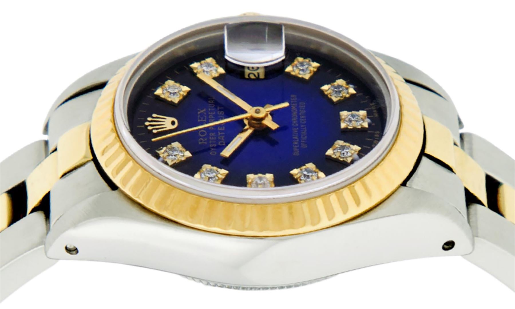 One Ladies Pre Owned Quickset Two Tone 18K Yellow Gold And Stainless Steel Rolex Datejust Polished, Serviced And Electronically Tested, Yellow Gold And Stainless Steel Case: 26mm, Yellow Gold Crown, Rolex Bezel: 18K Yellow Gold Fluted Bezel. Custom Crystal: New Sapphire With Magnified Date Window. Custom Hands: New Luminescent Hands. Rolex Movement: Automatic Winding Movement 2135. Custom Dial: Custom Blue Vignette Dial With Added Diamond Hour Markers, Diamond Count: 10 Single Cut Diamonds. Date Window: 3 O'Clock Position Date Display, Model: Quickset Datejust. Condition: G-6 Extra Fine. Rolex Bracelet: Two Tone Yellow Gold And Stainless Steel Oyster Band. Bright Polish. 6.0 Inch Length, Adjustable. Standard Clasp, With Rolex Logo. This Watch Has Been Serviced Time Tested And Is In Excellent Condition It Is Free Of All Scratches And Dents.