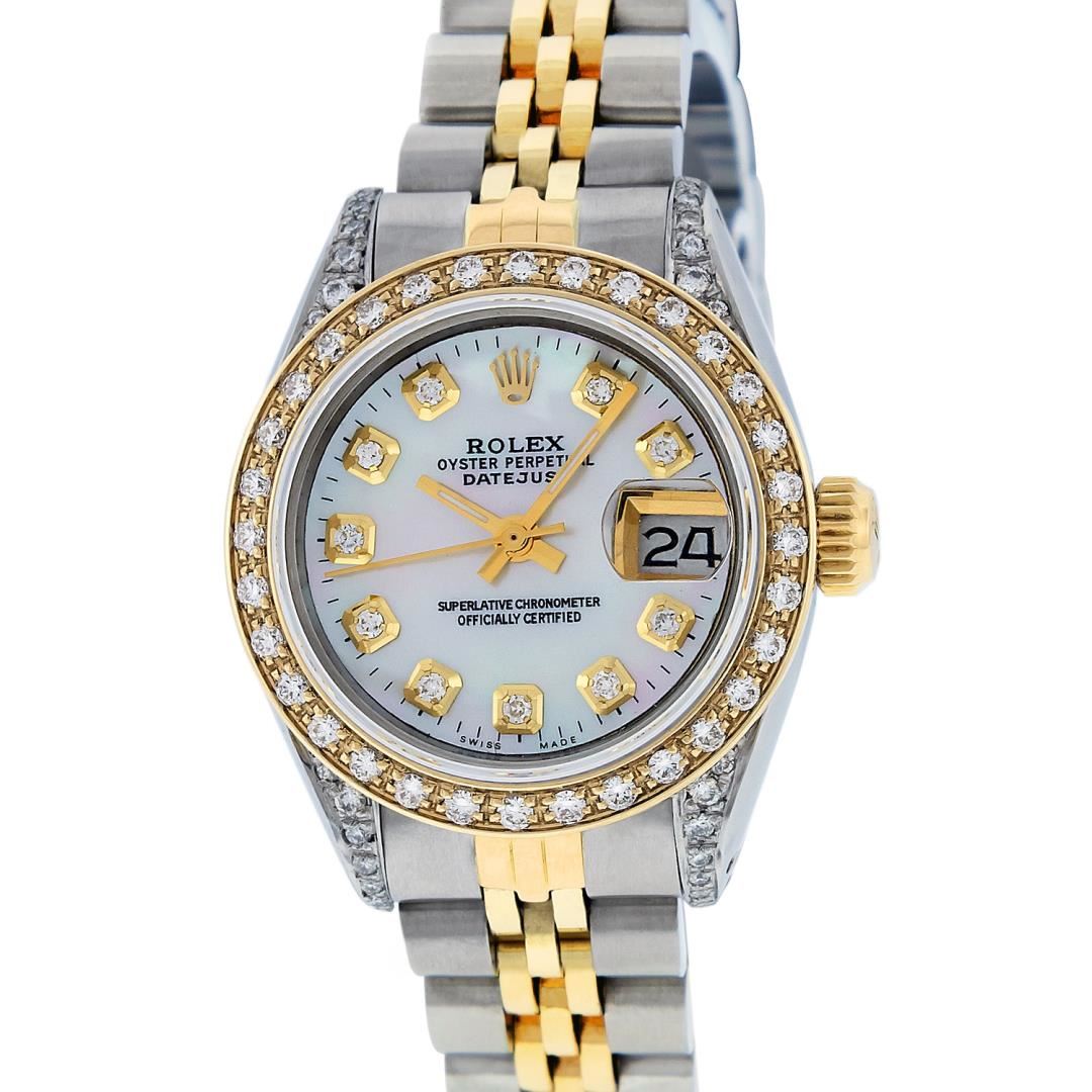 One Ladies Pre Owned Two Tone 18K Yellow Gold And Stainless Steel Rolex Datejust Polished, Serviced And Electronically Tested, Yellow Gold And Stainless Steel Case: 26mm, Yellow Gold Crown, Custom Diamond Lugs: 24 Added Diamonds On Lugs. Custom Bezel: New 18K Yellow Gold Beadset Diamond Bezel, Diamond Count: 32 Diamonds. Custom Crystal: New Sapphire With Magnified Date Window. Custom Hands: New Luminescent Hands. Rolex Movement: Automatic Winding Movement 2135. Custom Dial: Custom White Dial With Added Diamond Hour Markers and Dash Track, Diamond Count: 10 Diamonds. Date Window: 3 O'Clock Position Date Display, Model: Quickset Datejust. Condition: G-6 Extra Fine. Rolex Bracelet: Two Tone Yellow Gold And Stainless Steel Jubilee Band. Bright Polish. 6.0 Inch Length, Adjustable. Standard Clasp, With Rolex Logo. This Watch Has Been Serviced Time Tested And Is In Excellent Condition It Is Free Of All Scratches And Dents.