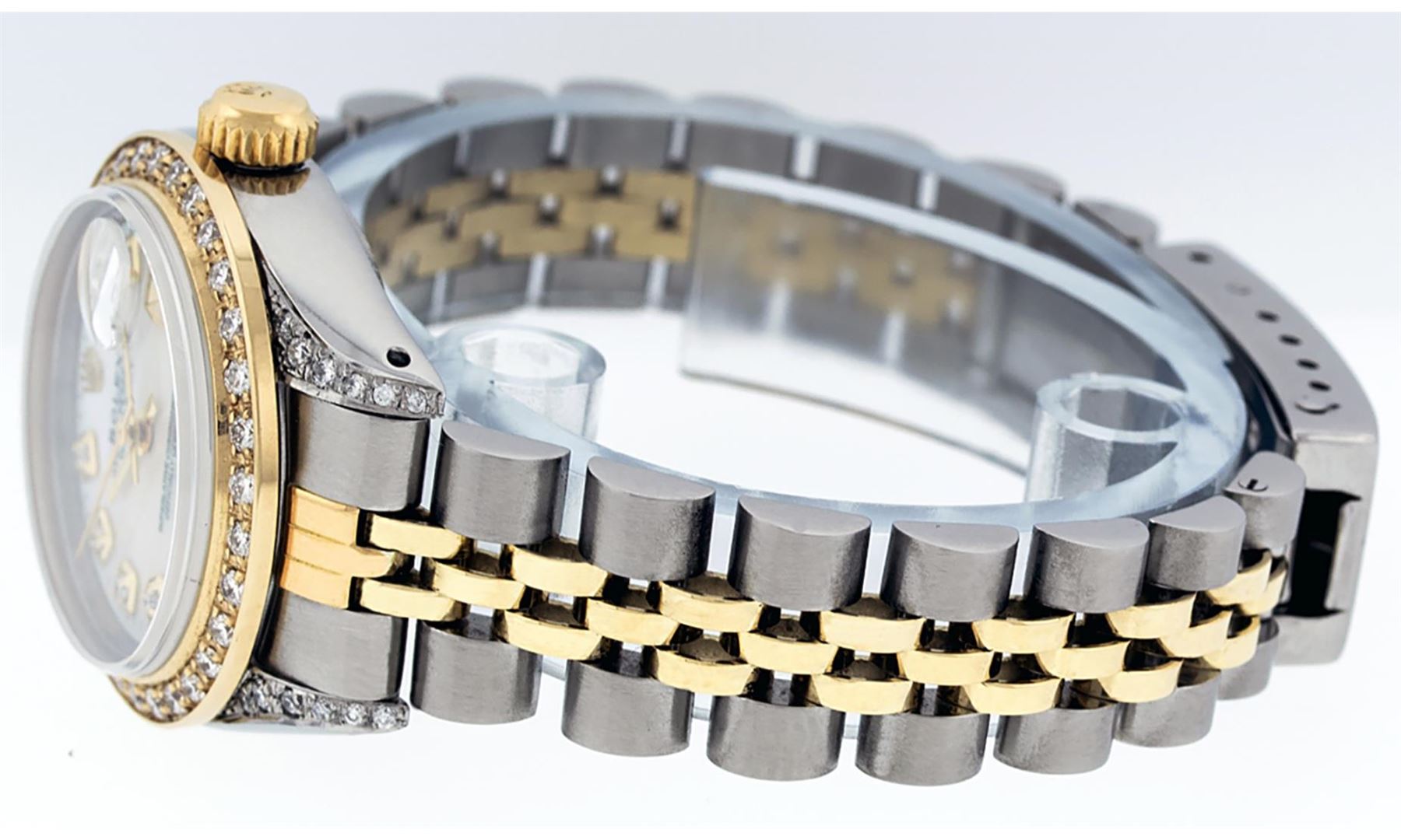 One Ladies Pre Owned Two Tone 18K Yellow Gold And Stainless Steel Rolex Datejust Polished, Serviced And Electronically Tested, Yellow Gold And Stainless Steel Case: 26mm, Yellow Gold Crown, Custom Diamond Lugs: 24 Added Diamonds On Lugs. Custom Bezel: New 18K Yellow Gold Beadset Diamond Bezel, Diamond Count: 32 Diamonds. Custom Crystal: New Sapphire With Magnified Date Window. Custom Hands: New Luminescent Hands. Rolex Movement: Automatic Winding Movement 2135. Custom Dial: Custom White Dial With Added Diamond Hour Markers and Dash Track, Diamond Count: 10 Diamonds. Date Window: 3 O'Clock Position Date Display, Model: Quickset Datejust. Condition: G-6 Extra Fine. Rolex Bracelet: Two Tone Yellow Gold And Stainless Steel Jubilee Band. Bright Polish. 6.0 Inch Length, Adjustable. Standard Clasp, With Rolex Logo. This Watch Has Been Serviced Time Tested And Is In Excellent Condition It Is Free Of All Scratches And Dents.